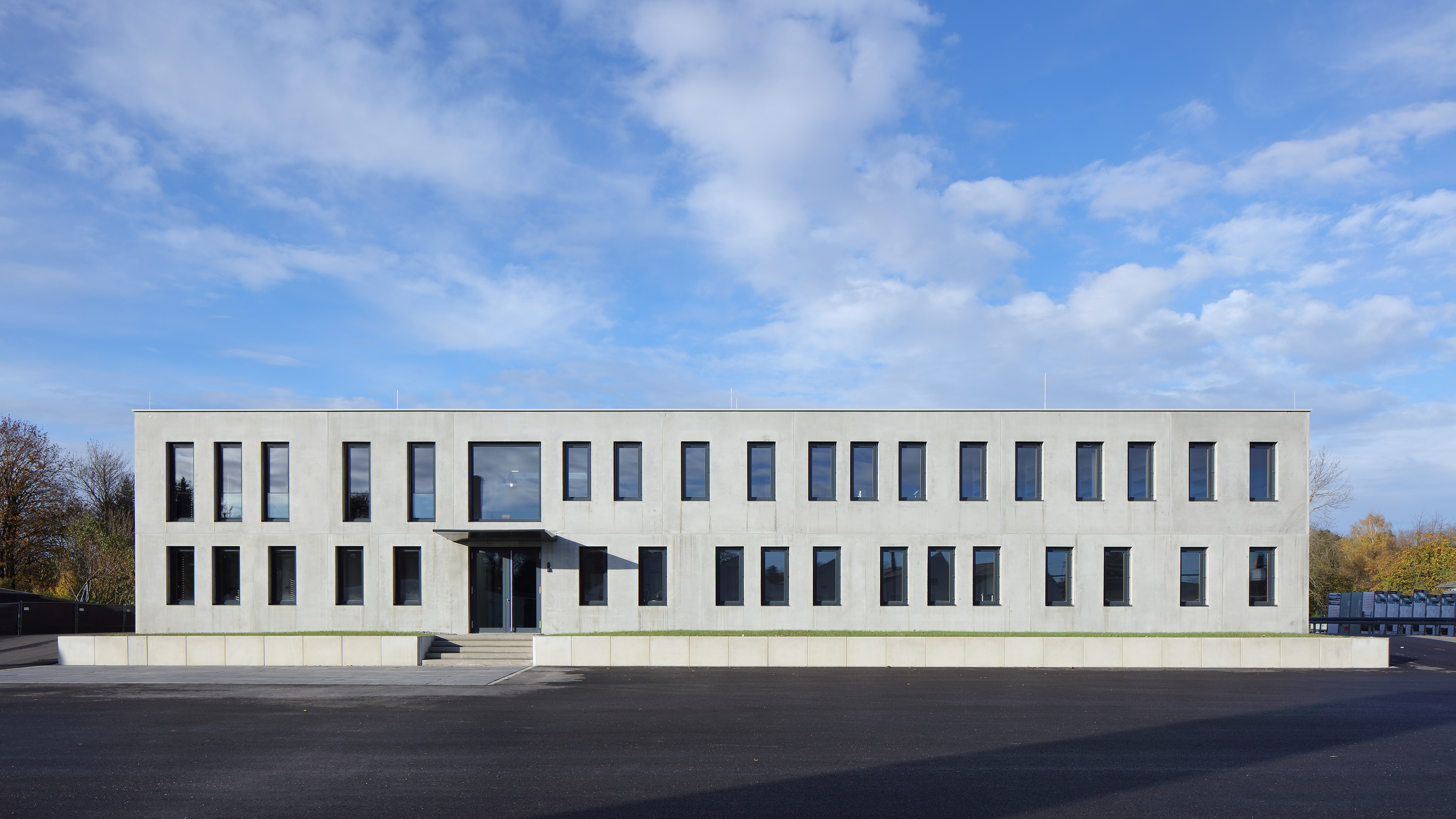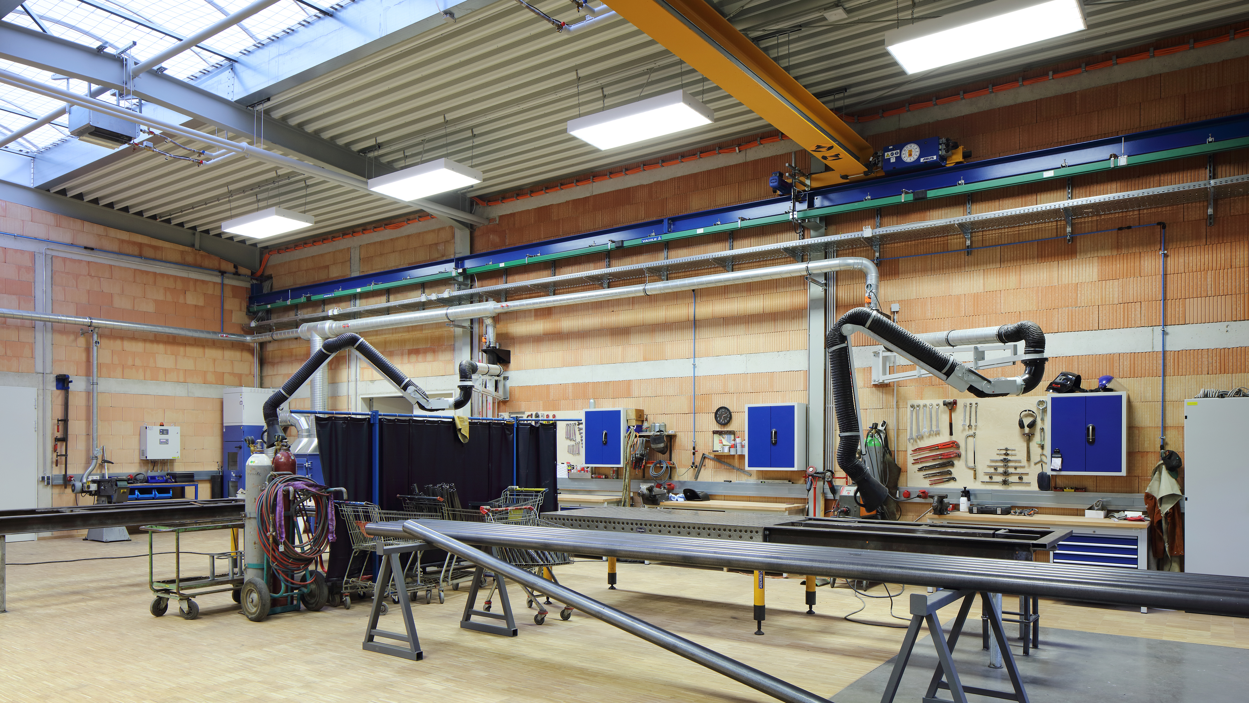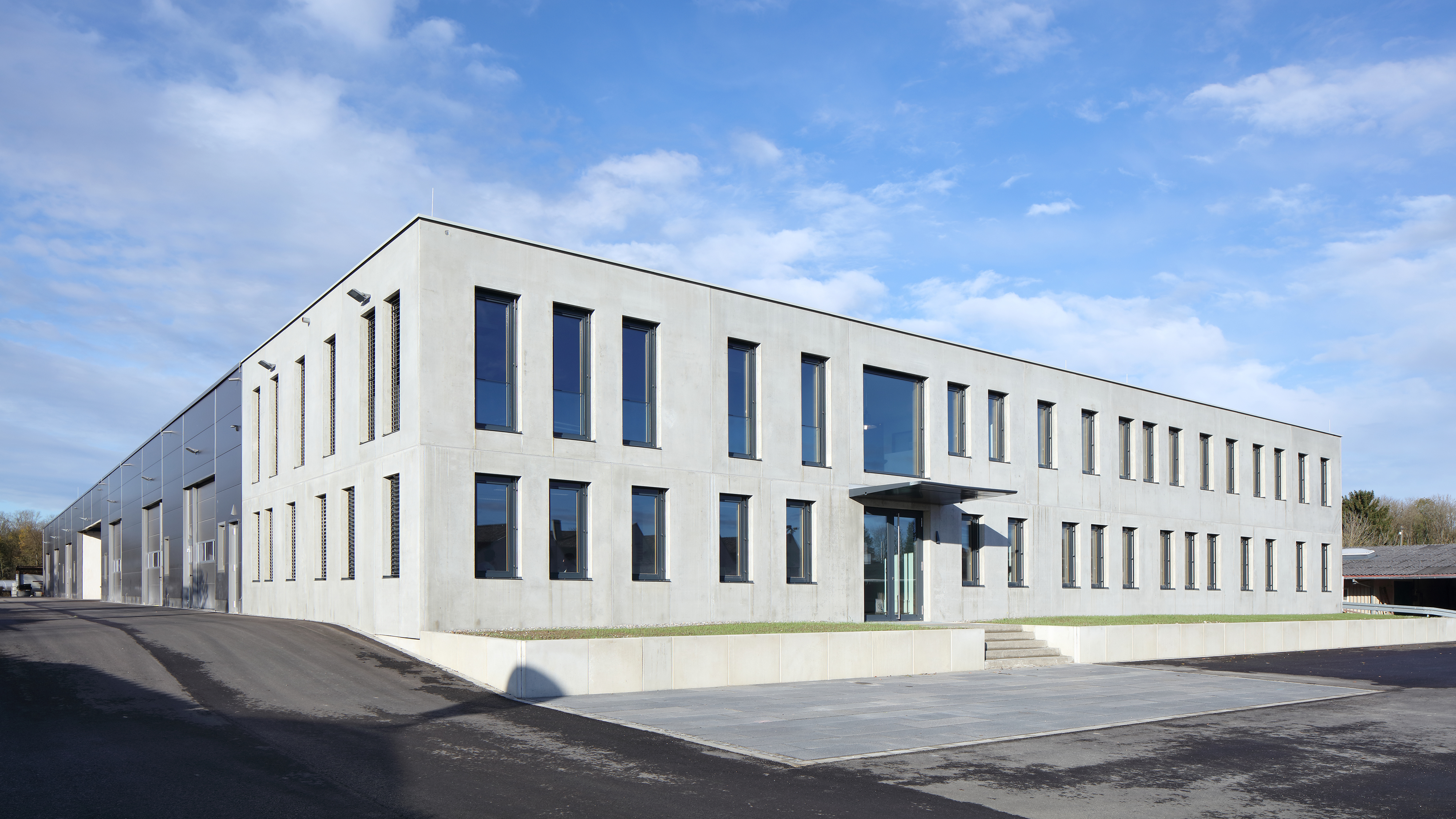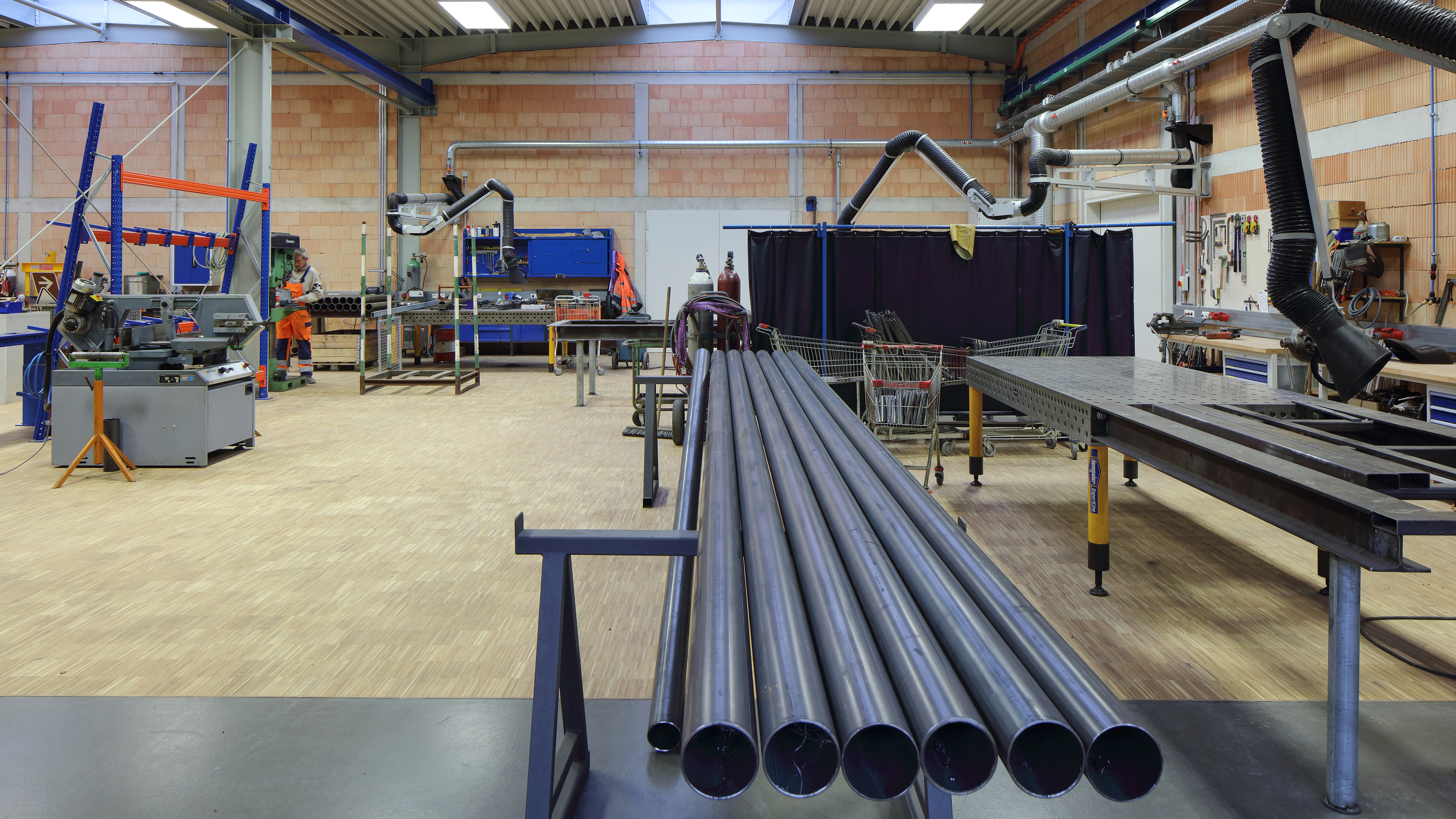 das werkstattgebäude mit seinem tragwerk als stahlrahmenkonstruktion wird von einer fassade aus stahlsandwichpaneelen umhüllt. die sandwichpaneele sind waagerecht verlegt und mit einer farbig beschichteten oberfläche versehen. die innenwände zur offenen montagehalle sind aus mauerwerk hlz, einem kerngedämmte poroton-planziegel, hergestellt. die werkstattbüros sind als konfektionierte einbauelemente in stahl/glas-konstruktion umgesetzt.