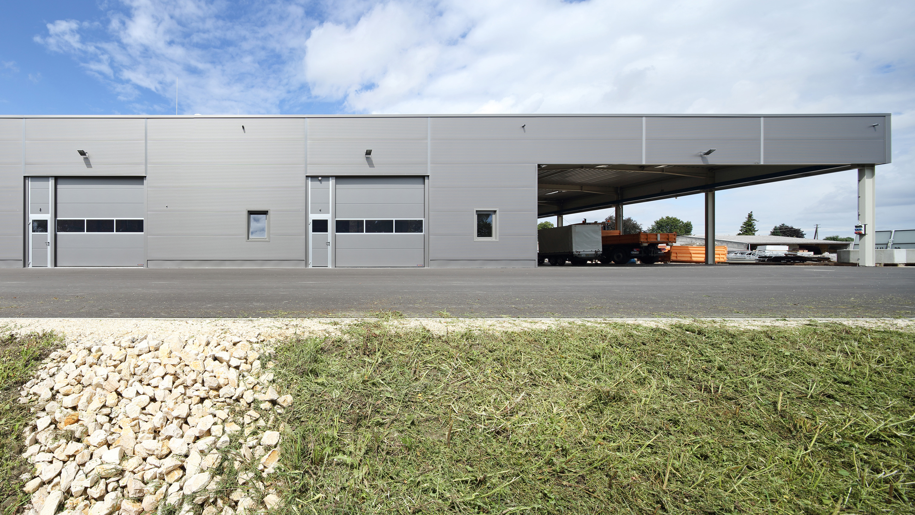 im ersten bauabschnitt wurde zunächst die schreinerwerkstatt errichtet. es wurden zwei werkstatteinheiten (schreiner, spielplatzwarte) mit dazugehörigen lagerflächen, sowie die montagehalle als offene fahrzeughalle mit krahnbahn erstellt. die errichtung der weiteren werkstätten, lagerräume sowie die büro-und sozialräume folgen im zweiten bauabschnitt. die geländeaufschüttung für diesen wurde bereits in bauabschnitt eins komplett ausgeführt und wird momentan als außenlagerfläche genutzt.
