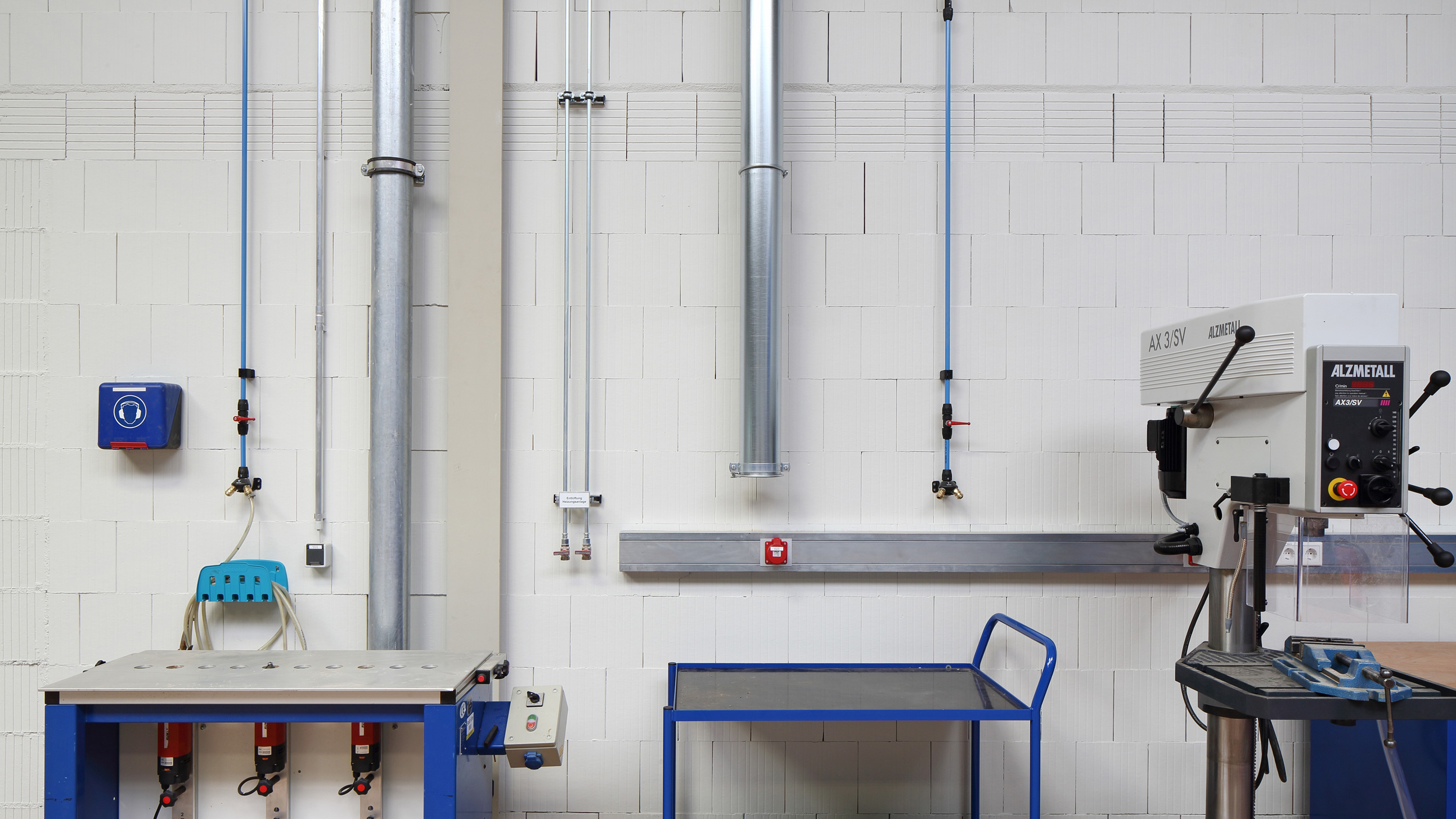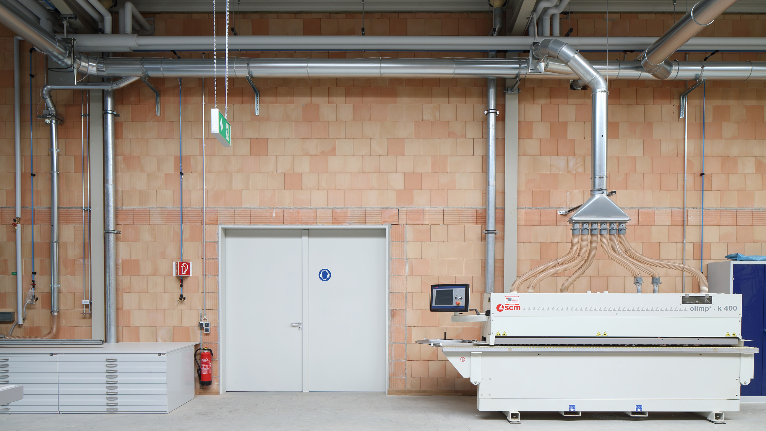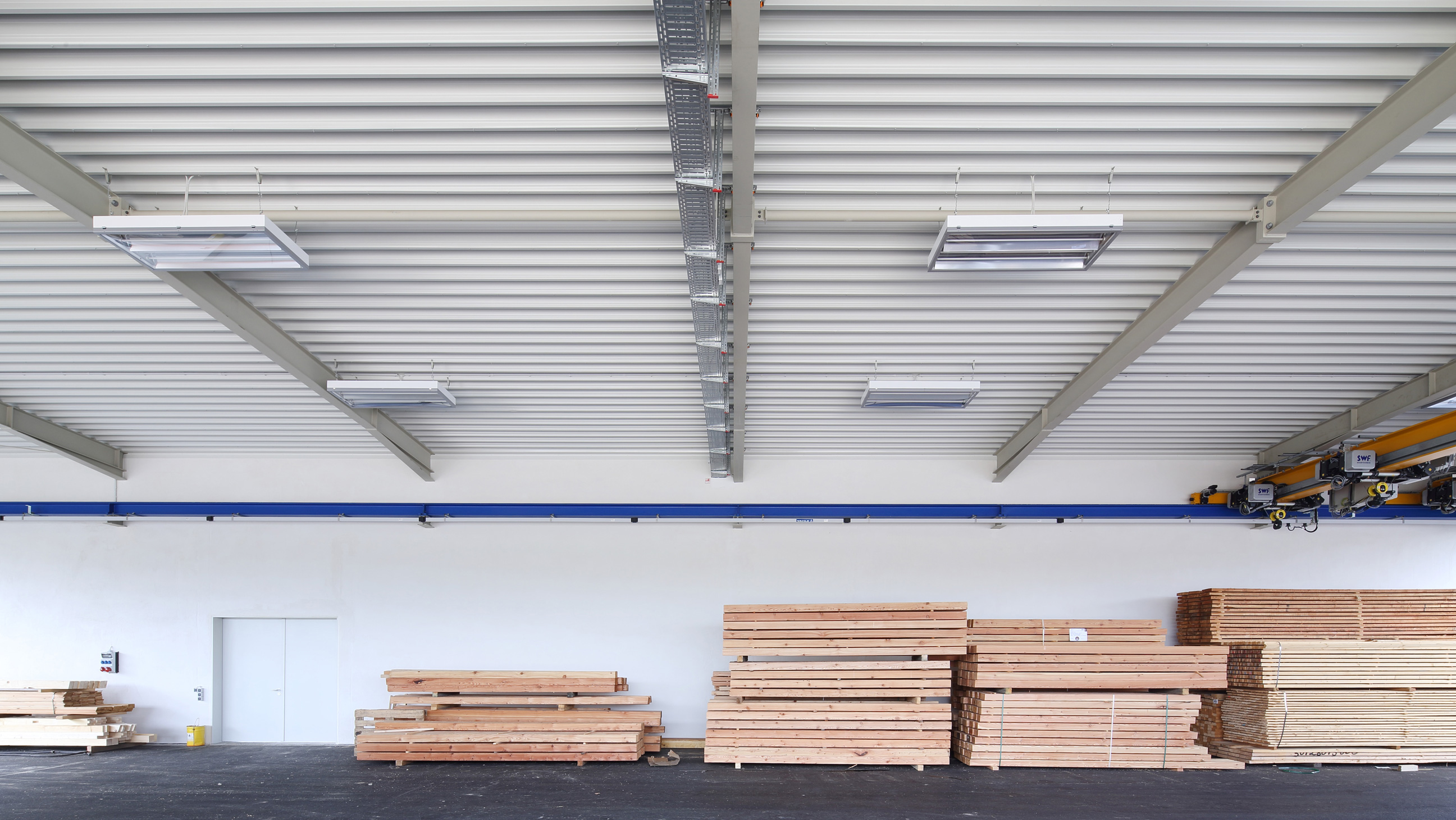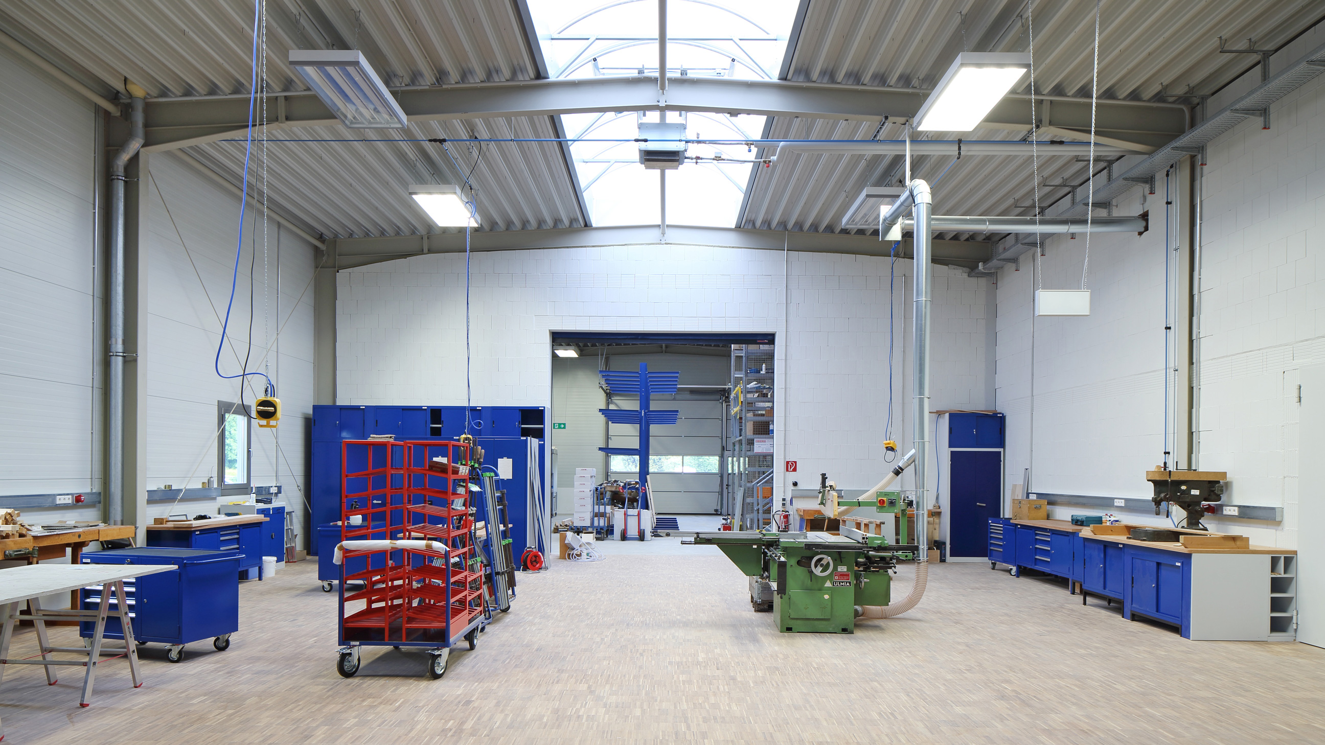 das tragwerk wurde als stahlkonstruktion ausgebildet, bei der die aussteifung über verbände erfolgt. um dem gebäude keinen drückenden industriehallen-charakter zu verleihen, wurden waagerechte sandwichpaneele verlegt. die belichtung und entrauchung erfolgt über lichtbänder in der mittelachse der werkstätten. durch das geölte industrieparkett in den werkstätten wird zum einen die funktionalität gewährleistet und gleichzeitig eine warme atmosphäre geschaffen. im lagerbereich und maschinenraum entschied man sich für einen staubbindenden anstrich.