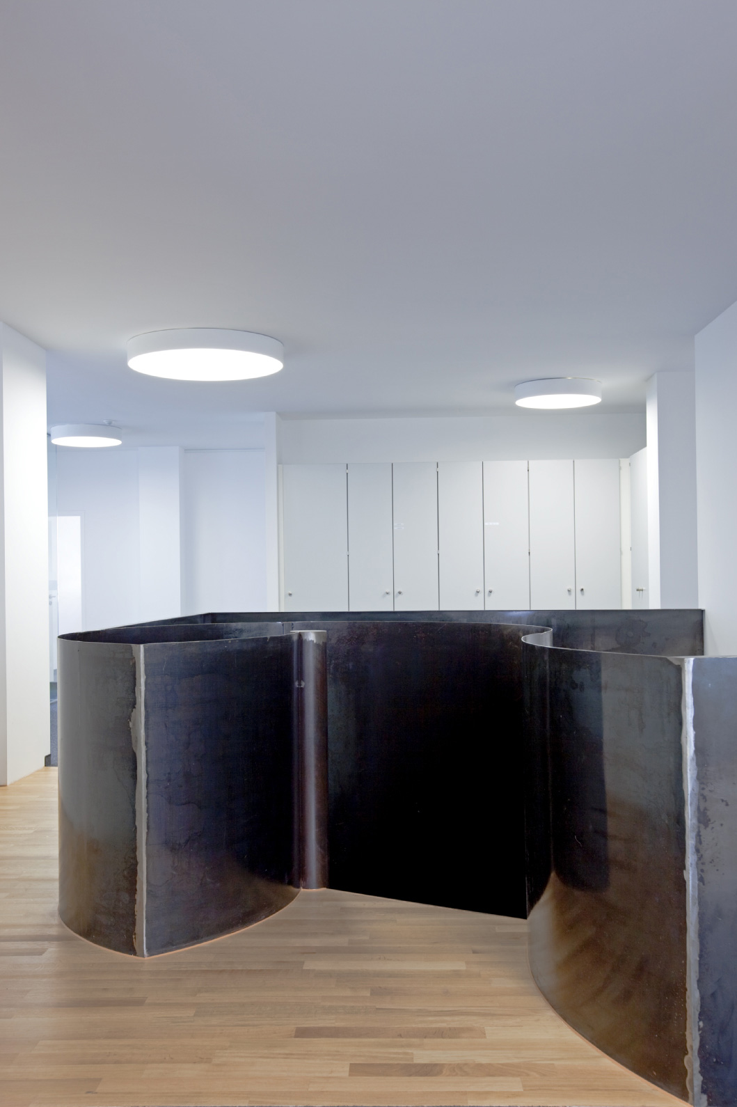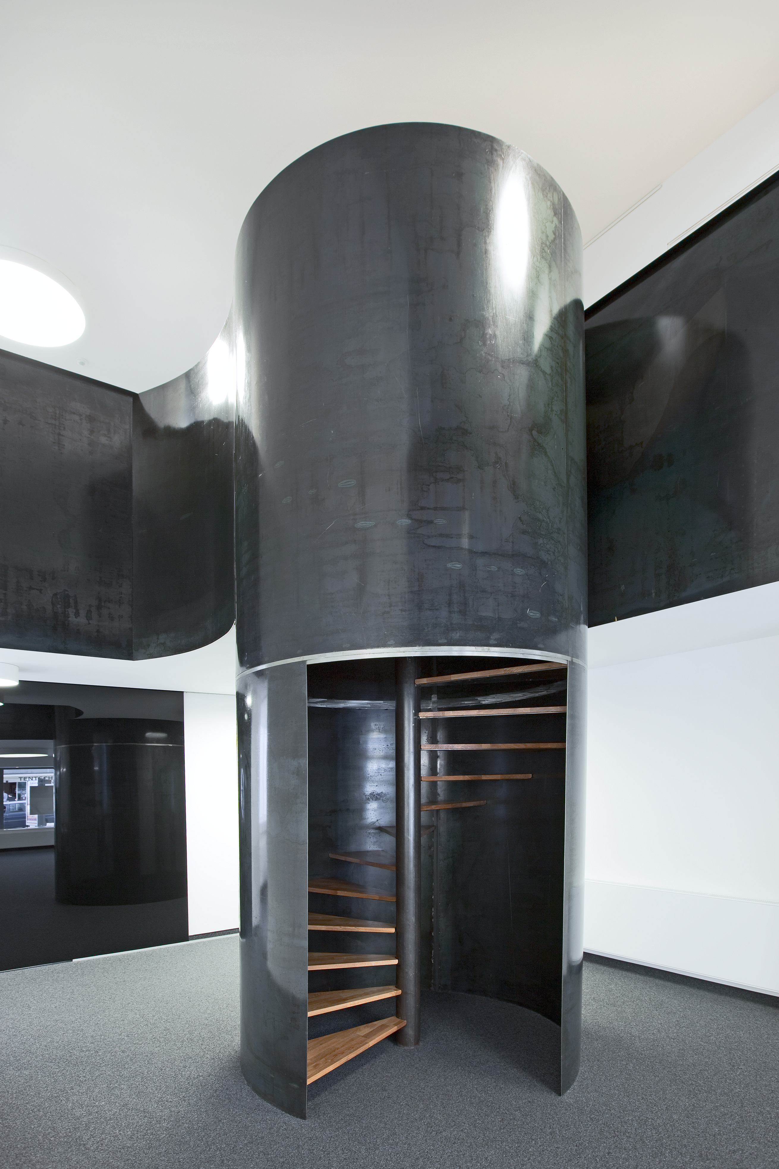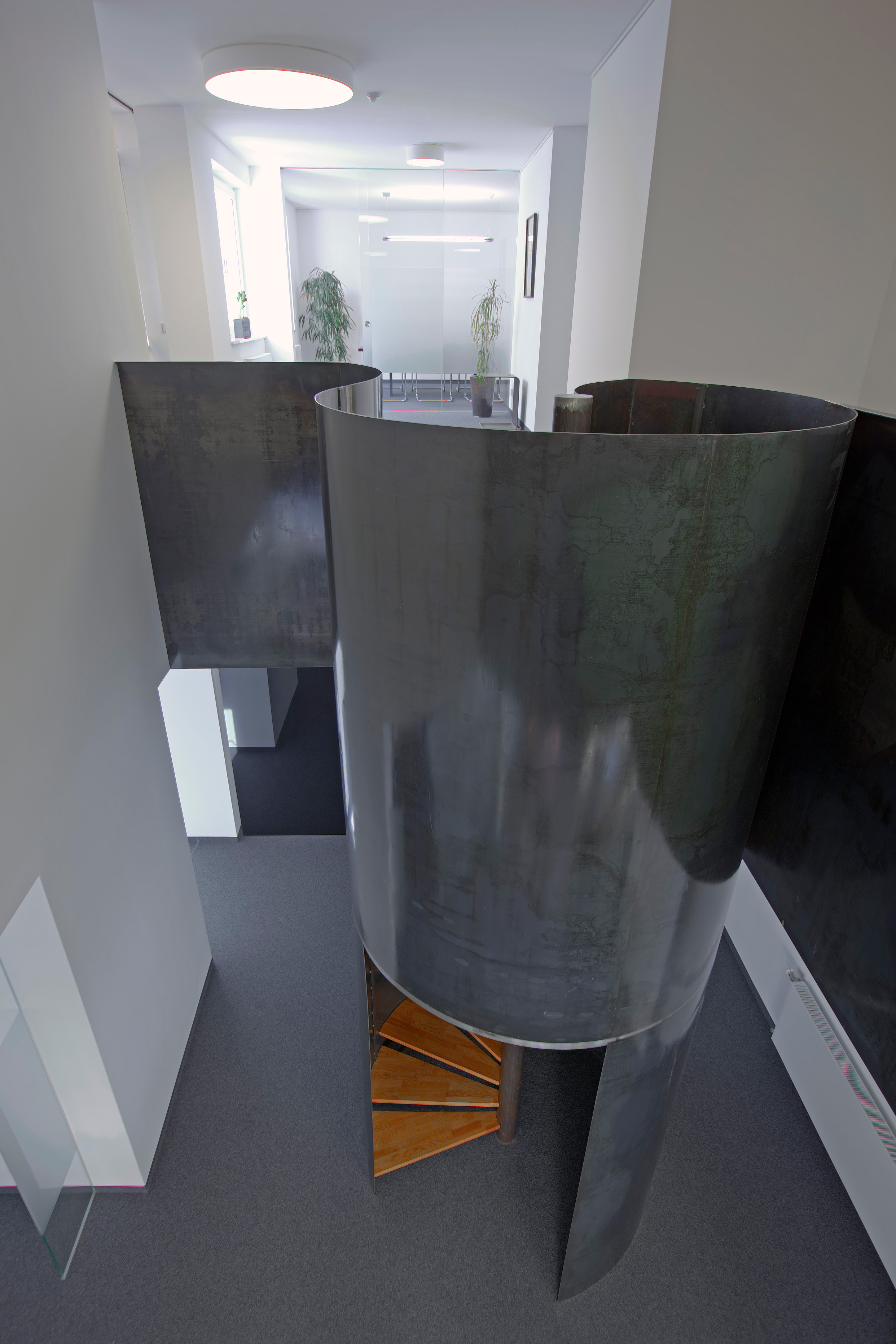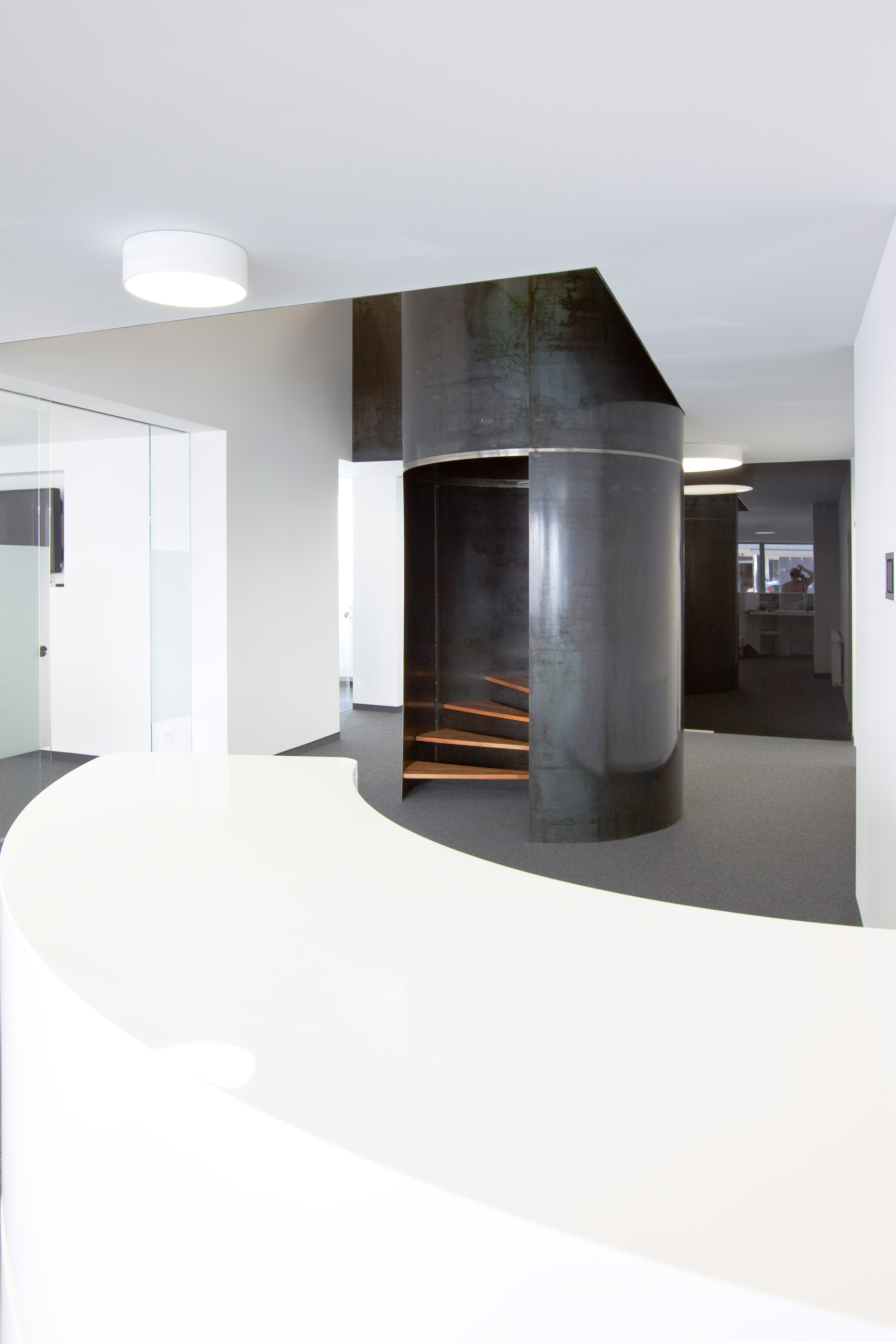 im eckhaus an der kreuzung frauenstraße/schuhhausgasse entstand auf zwei geschossen eine auf wenige elemente reduzierte arbeitswelt. um eine möglichst freie und offene kommunikation zwischen beiden geschossen zu schaffen wurde ein großzügiger, rund 7 meter hoher luftraum integriert. die verbindung der beiden ebenen erfolgt über eine spindeltreppe, die von einer tonne aus geöltem schwarzblech gefasst wird. die freiform stellt das zenrale element der arbeitswelt dar. die profillosen glastrennelemente in den büros sorgen für lichtdurchflutung und die notwendige transparenz. die maßgefertigten, schlichten und hochweiß glänzenden möbel fügen sich mit ihren klaren strukturen wie selbstverständlich in den bestand. kontraste entstehen durch die wirkung großer flächen; die transparenz und die weißgestrichenen wände stehen im deutlichen kontrast zu der in anthrazit gehaltenen treppe, dem bodenbelag als nadelfilz und dem mobilen raumteiler, der als schwarzlackierte, 2,60 x 2,40 meter große glasscheibe, gestaltet wurde.