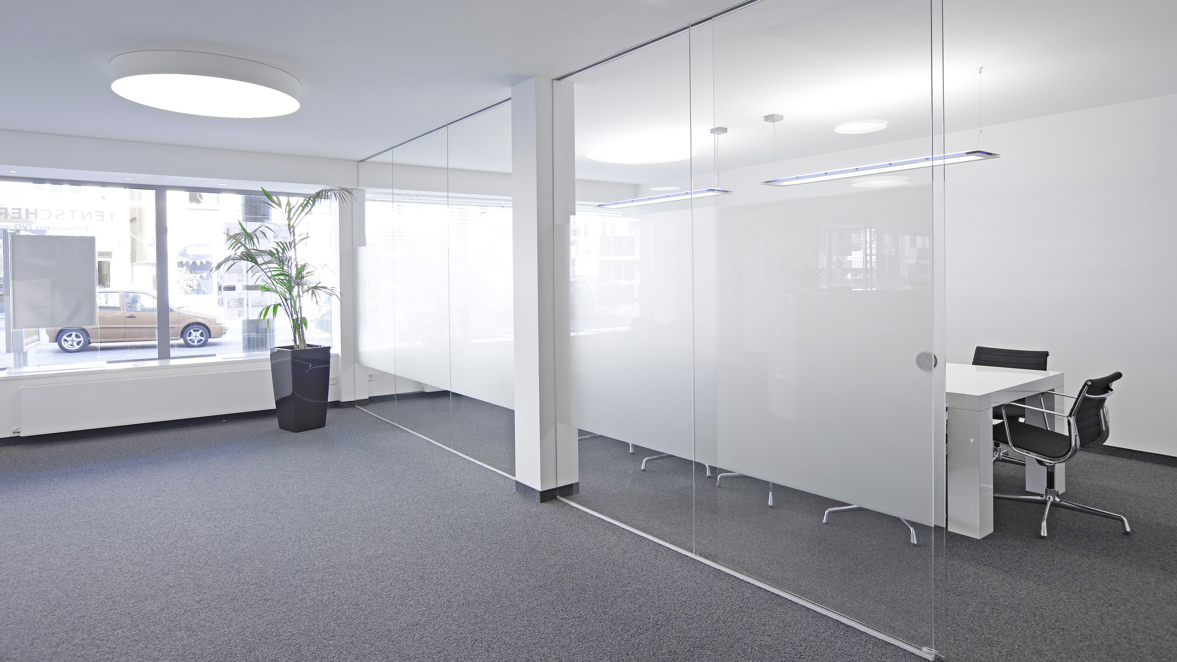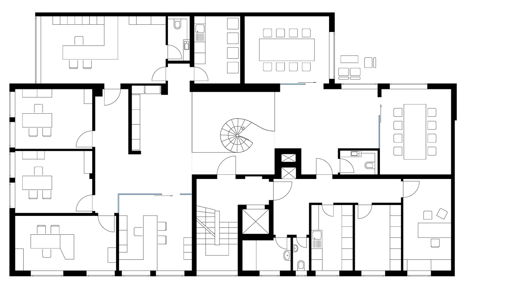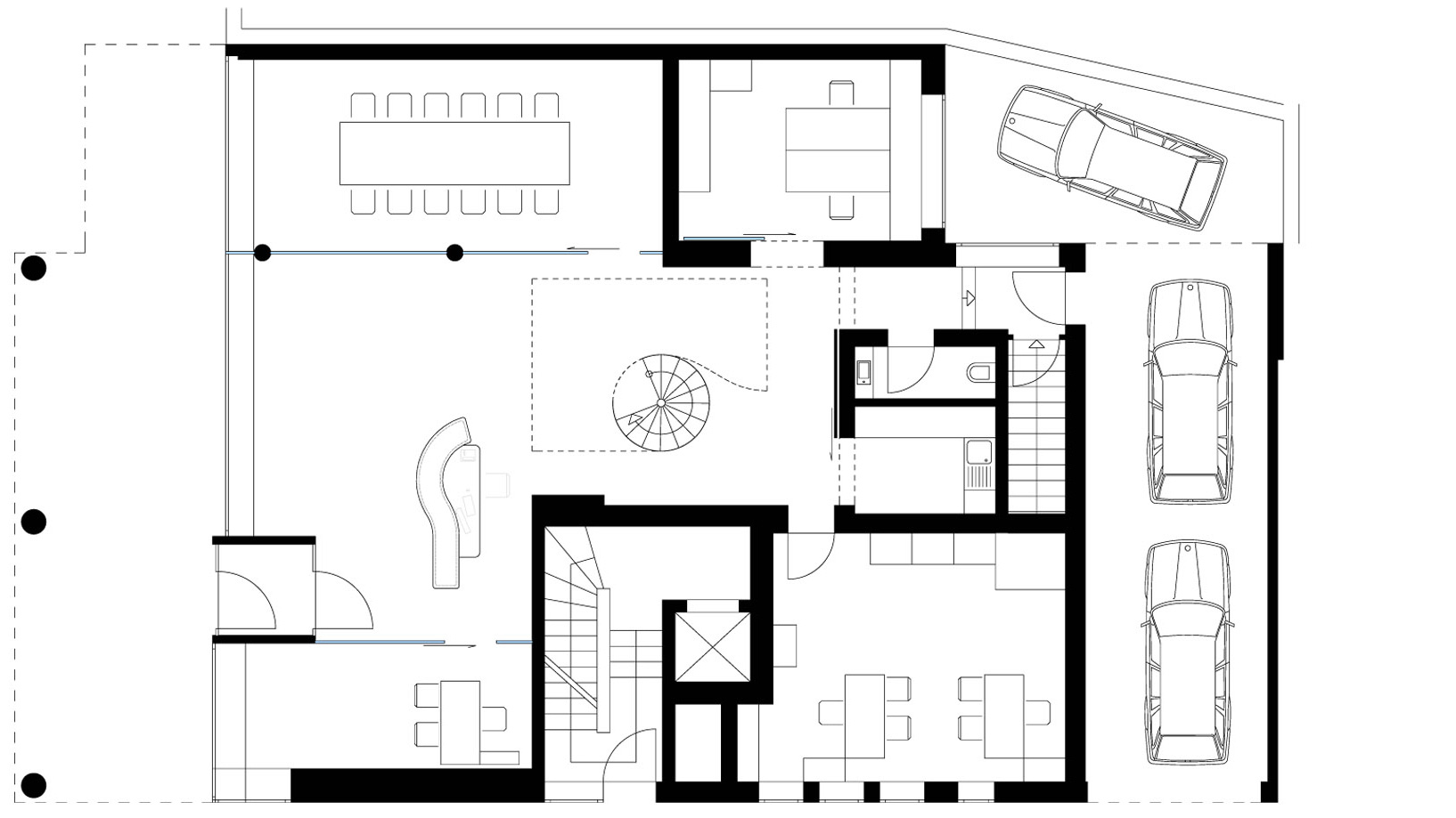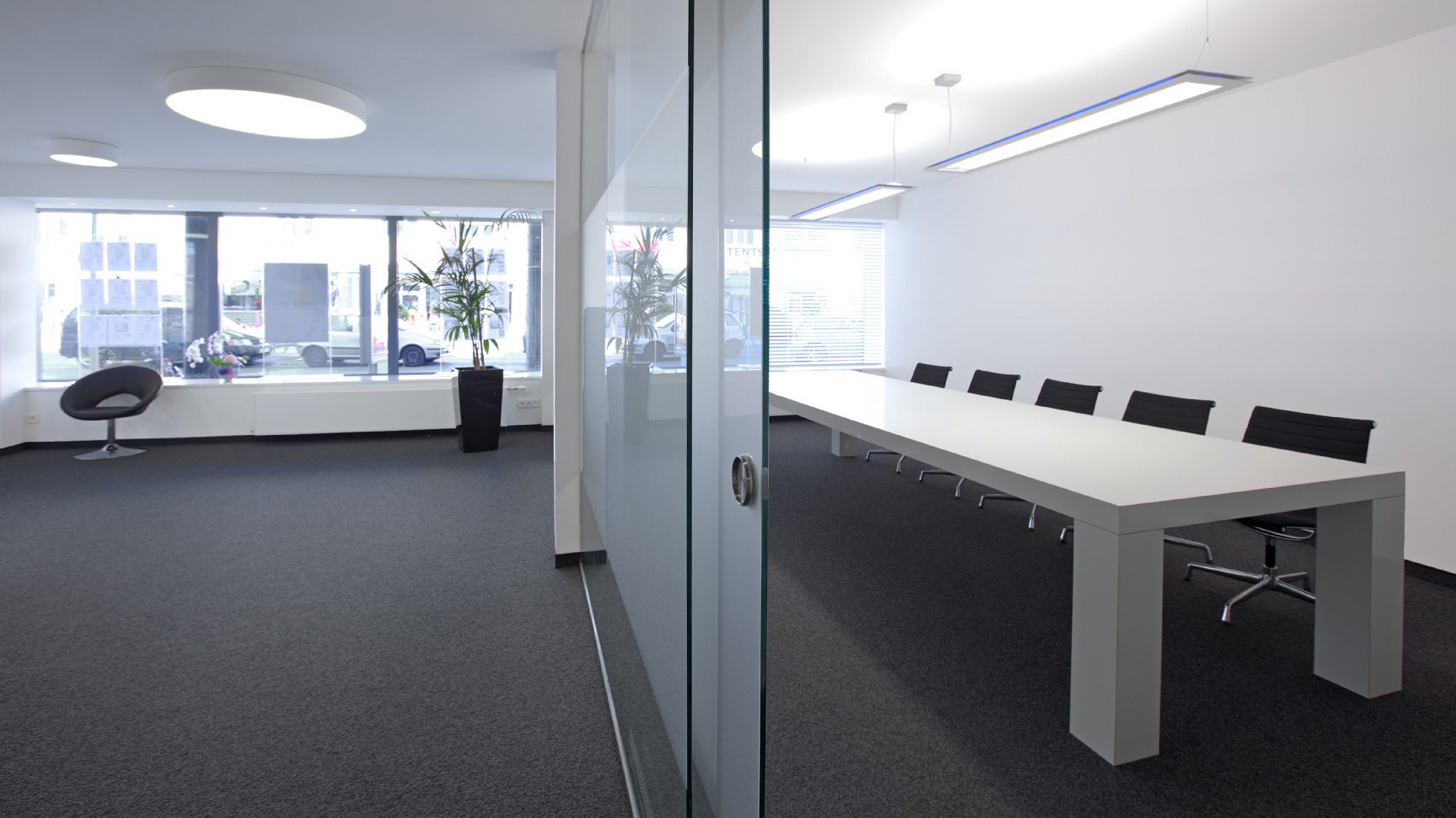 im eckhaus an der kreuzung frauenstraße/schuhhausgasse entstand auf zwei geschossen eine auf wenige elemente reduzierte arbeitswelt. um eine möglichst freie und offene kommunikation zwischen beiden geschossen zu schaffen wurde ein großzügiger, rund 7 meter hoher luftraum integriert. die verbindung der beiden ebenen erfolgt über eine spindeltreppe, die von einer tonne aus geöltem schwarzblech gefasst wird. die freiform stellt das zenrale element der arbeitswelt dar. die profillosen glastrennelemente in den büros sorgen für lichtdurchflutung und die notwendige transparenz. die maßgefertigten, schlichten und hochweiß glänzenden möbel fügen sich mit ihren klaren strukturen wie selbstverständlich in den bestand. kontraste entstehen durch die wirkung großer flächen; die transparenz und die weißgestrichenen wände stehen im deutlichen kontrast zu der in anthrazit gehaltenen treppe, dem bodenbelag als nadelfilz und dem mobilen raumteiler, der als schwarzlackierte, 2,60 x 2,40 meter große glasscheibe, gestaltet wurde.