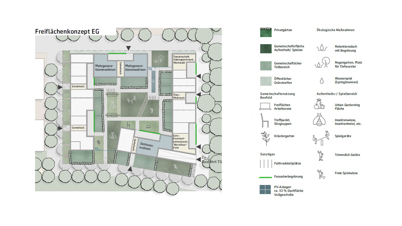 die grün- und freiflächen sollen sowohl ökologischen aspekten als auch sozialen aspekten gerecht werden. es sollen ausschließlich heimische pflanzen verwendet werden, die mit den hiesigen bedingungen zurechtkommen und keine gefahr für menschen, tiere oder umwelt darstellen.