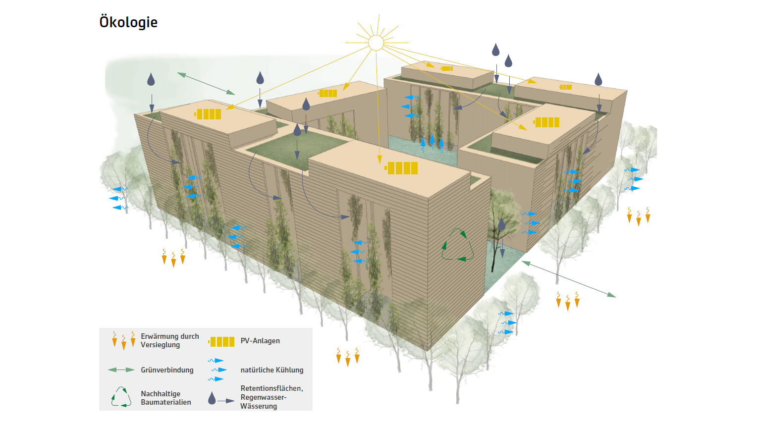 - haustechnik: der anschluss des gebiets an die fernwärme ist vorausgesetzt + geforderten pv-anlagen auf 30 % der dachflächen