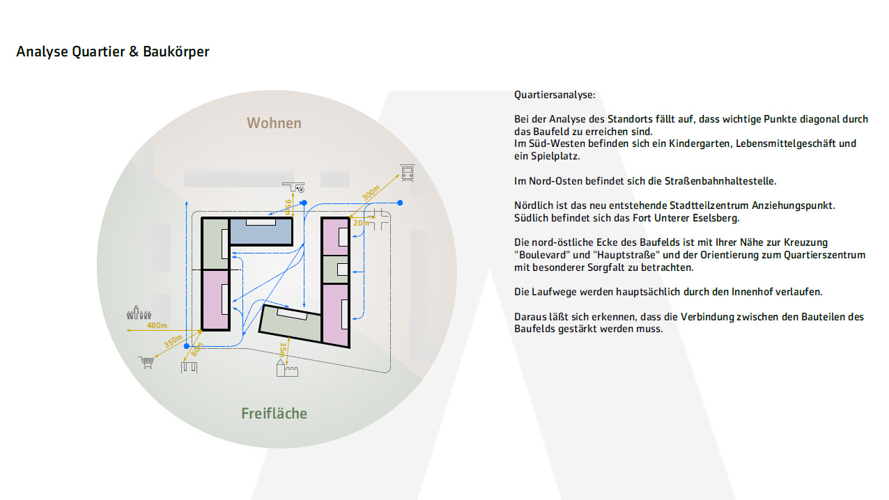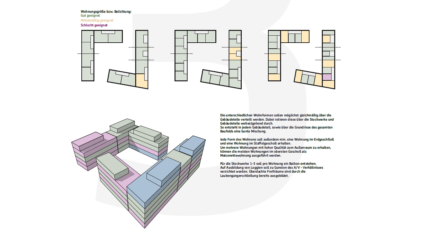 das gewählte baufeld a3 konzentriert sich, fast ausschließlich auf das wohnen. so wird die eg-fläche hauptsächlich mit wohnungen bestückt. ausnahmen stellen gemeinschaftsflächen und eine gewerbefläche von ca. 50 m² im erdgeschoß dar. die gemeinschaftsflächen dienen nicht nur als treffpunkt für bewohner, sondern auch als verbindung zwischen dem innenhof und der jeweiligen straßenseite. die obersten vollgeschoße der baukörper werden mit den staffelgeschoßen als maisonettewohnungen ausgebildet.