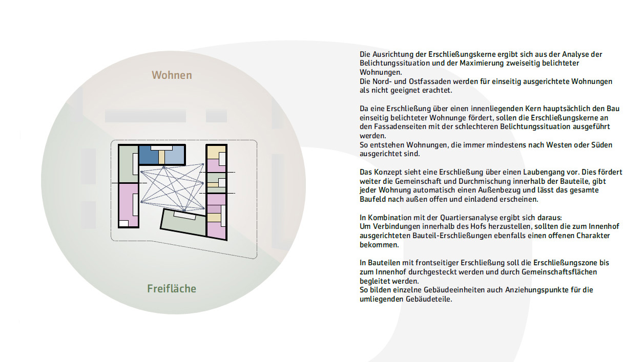 die erschließung der bauteile erfolgt über laubengänge. diese sind immer nord- und ostseitig in die gebäudeform integriert. so sind alle wohnungen entweder nach süden oder westen ausgerichtet und eine min. zweiseitige belichtung ist für alle wohnungen garantiert. außerdem bieten die laubengänge einen überdachten außenbereich und begegnungsraum für die bewohner und wirken einladen und offen.