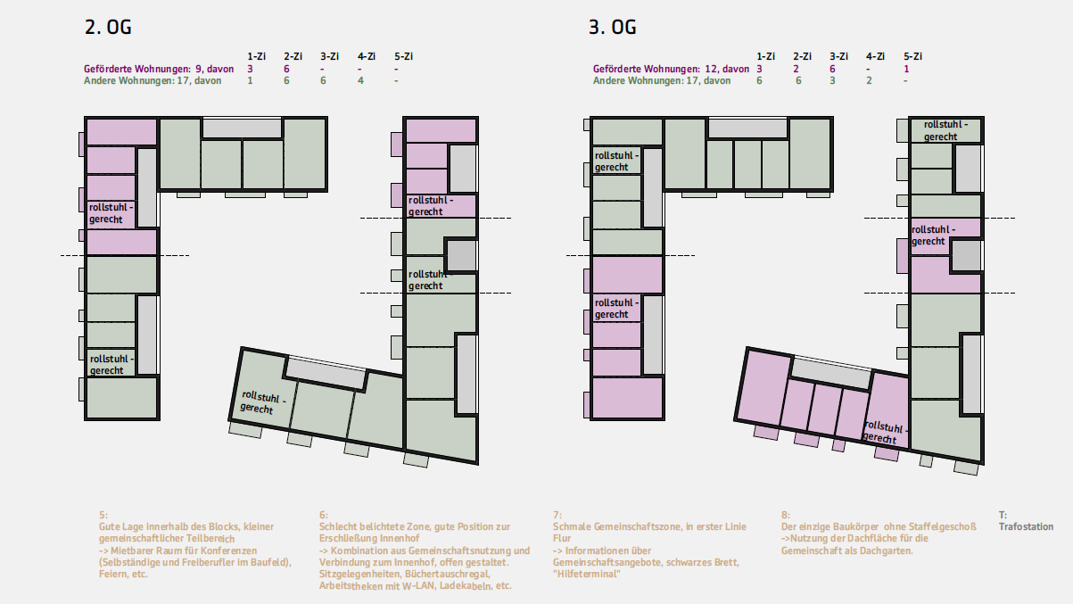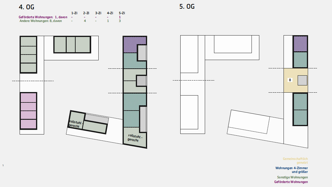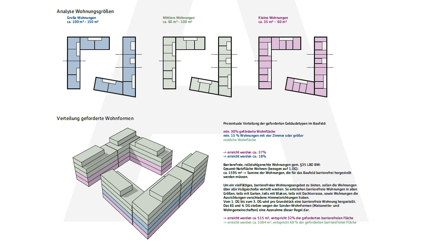 jedes der bauteile der zwei l‘s ist eigenständig und verfügt über einen eigenen hauseingang. das konzept verfolgt eine durchmischung aller möglicher wohnungsformen und -größen auf die einzelnen bauteile gesehen, aber auch über die stockwerke, was sich in der gesamtbetrachtung der grundrisse zeigt. so wird eine durchmischung verschiedener bewohnergruppen garantiert. jede wohnung erhält, sofern keine garten- oder dachfläche zugehörig, einen balkon (an süd- oder westfassade). die barrierefreien und rollstuhlgerechten wohnungen, folgen demselben prinzip: jedes bauteil weist entsprechend ausgestattete wohnungen auf. dabei befinden diese sich in unterschiedlichen stockwerken und sie variieren ebenfalls in der wohnungsgröße.