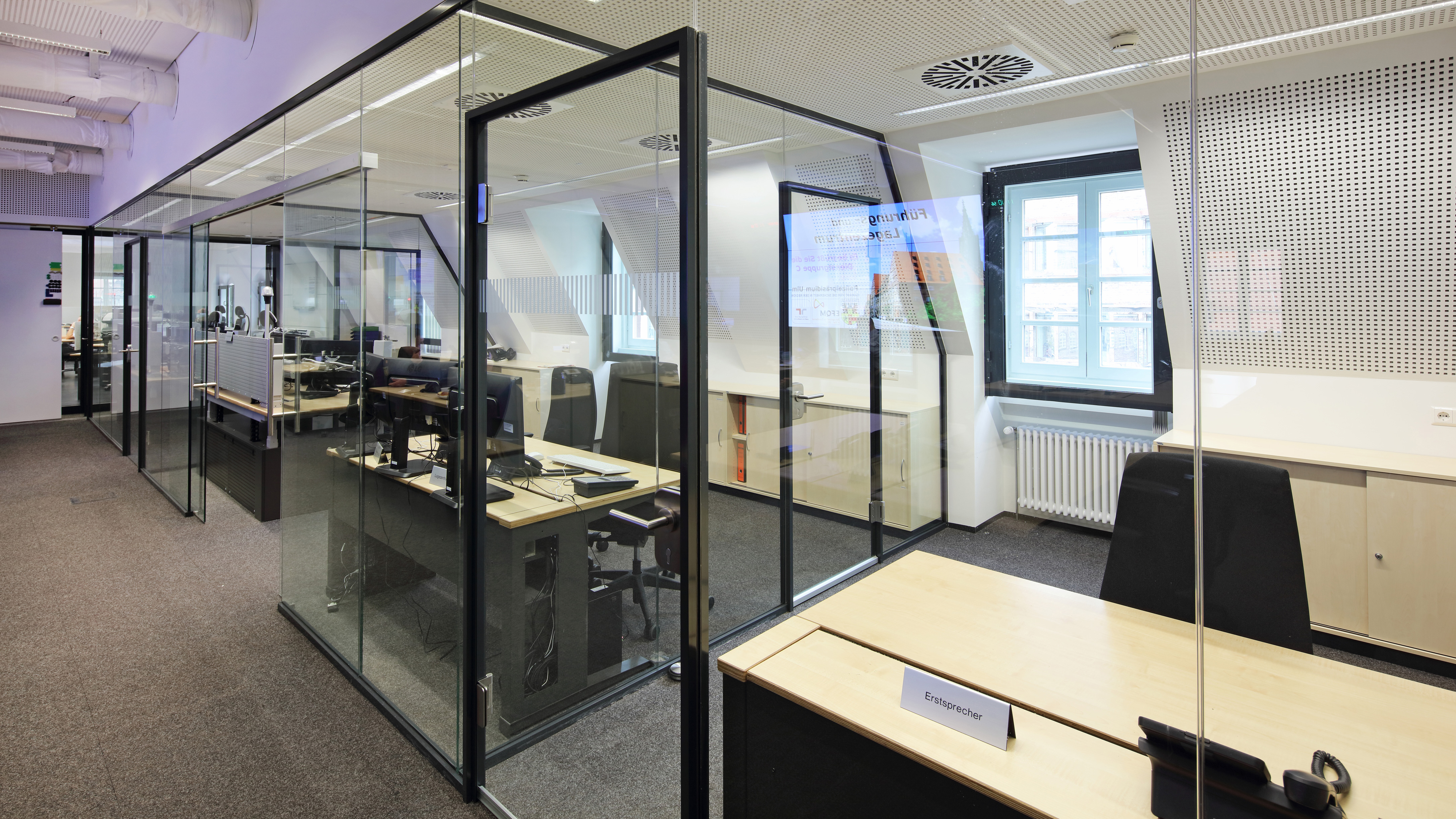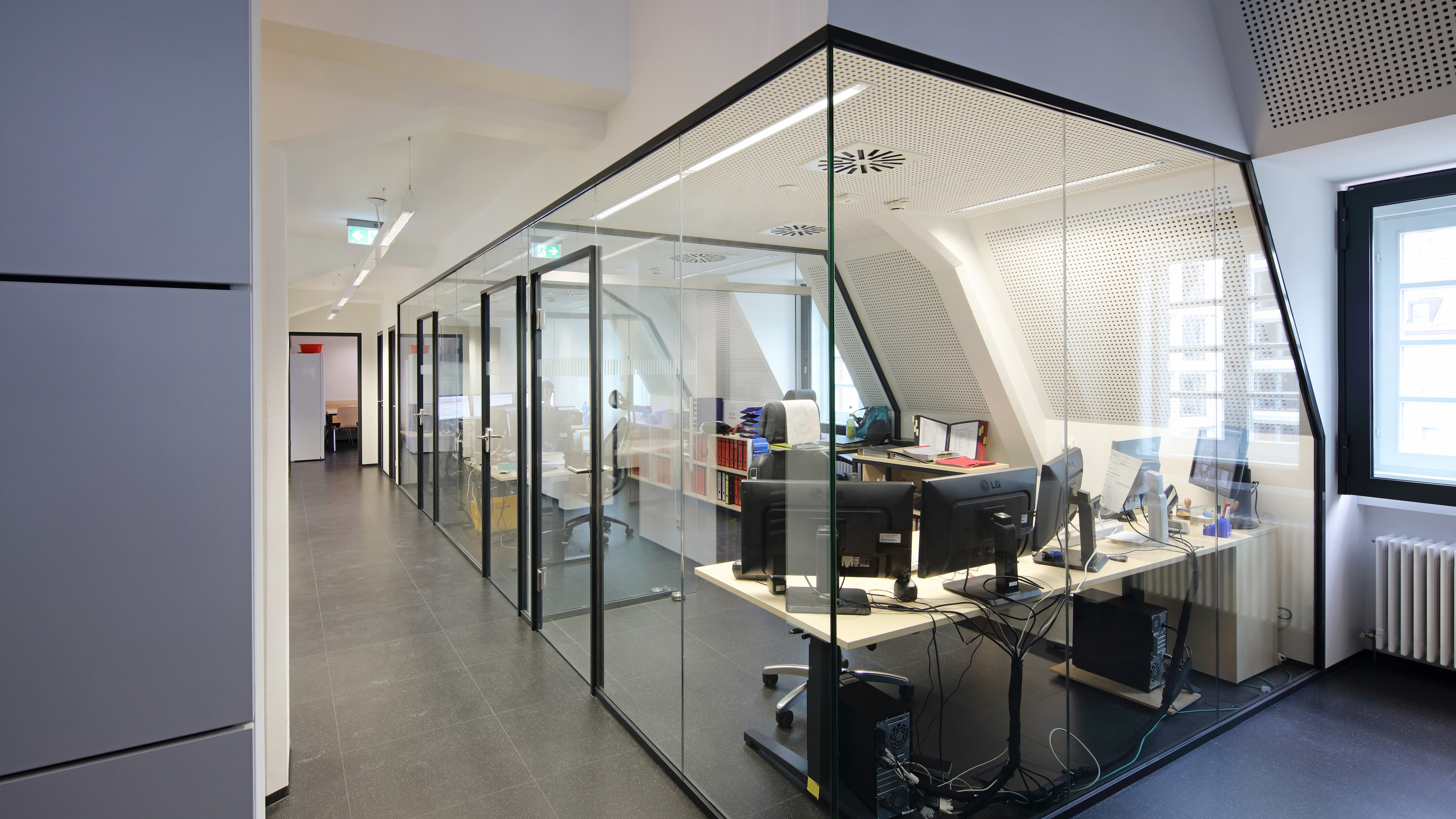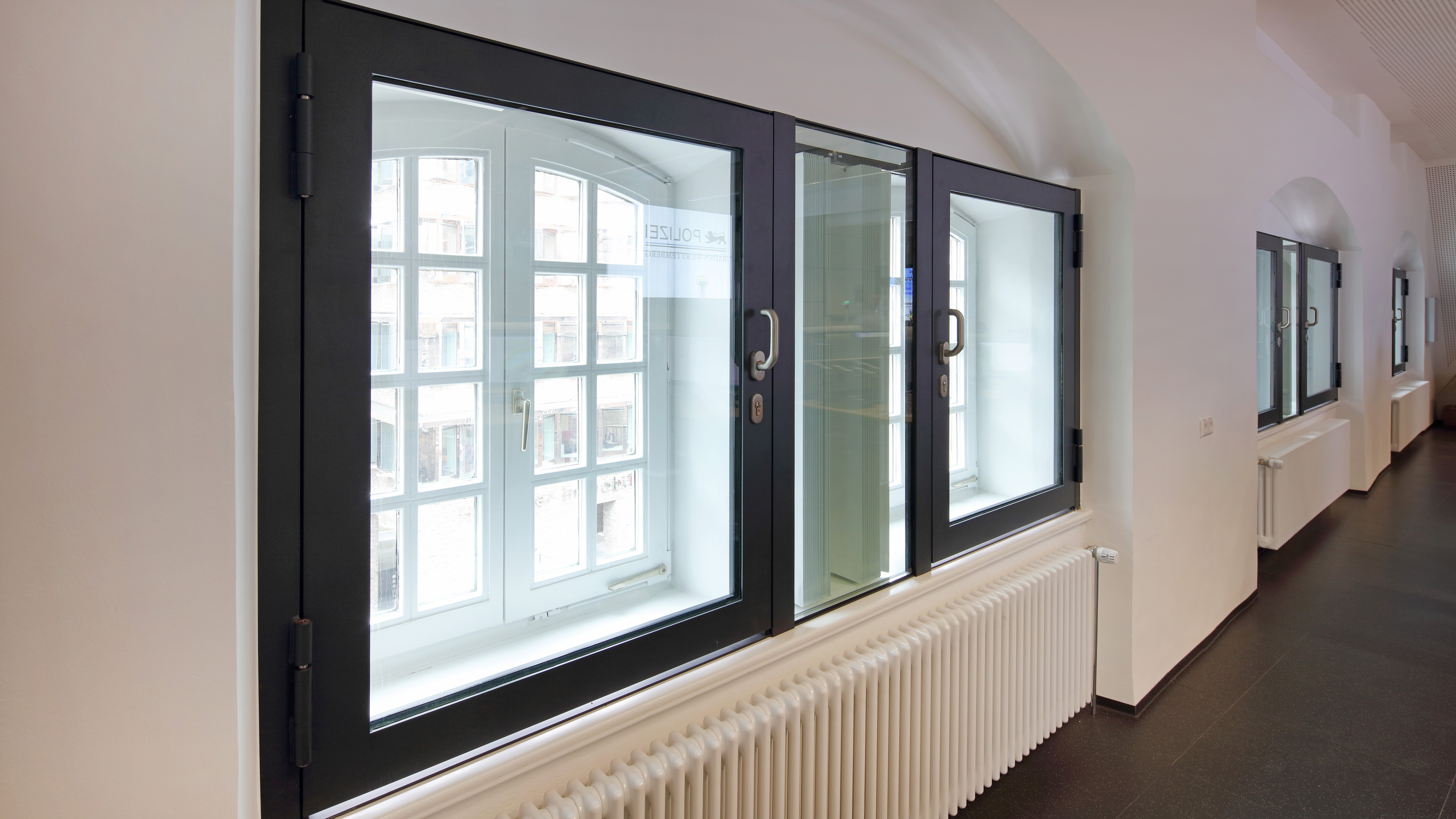 im zuge der polizeistrukturreform galt es das führungs- und lagezentrum der polizeidirektion in den historischen bau zu integrieren. die neue nutzung bedingt die denkmalsgerechte integration von höchsten sicherheitsanforderungen, redundanter haustechnik und komfort für den 24h – dauerbetrieb. es entsteht der zentrale ort für die sogenannte lagebearbeitung. die unterbringung des FLZ erfolgte in den dachgeschossen des „neuen baus“.