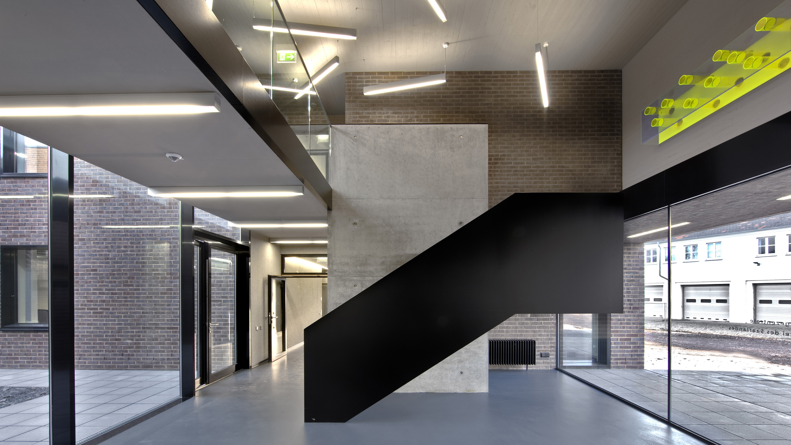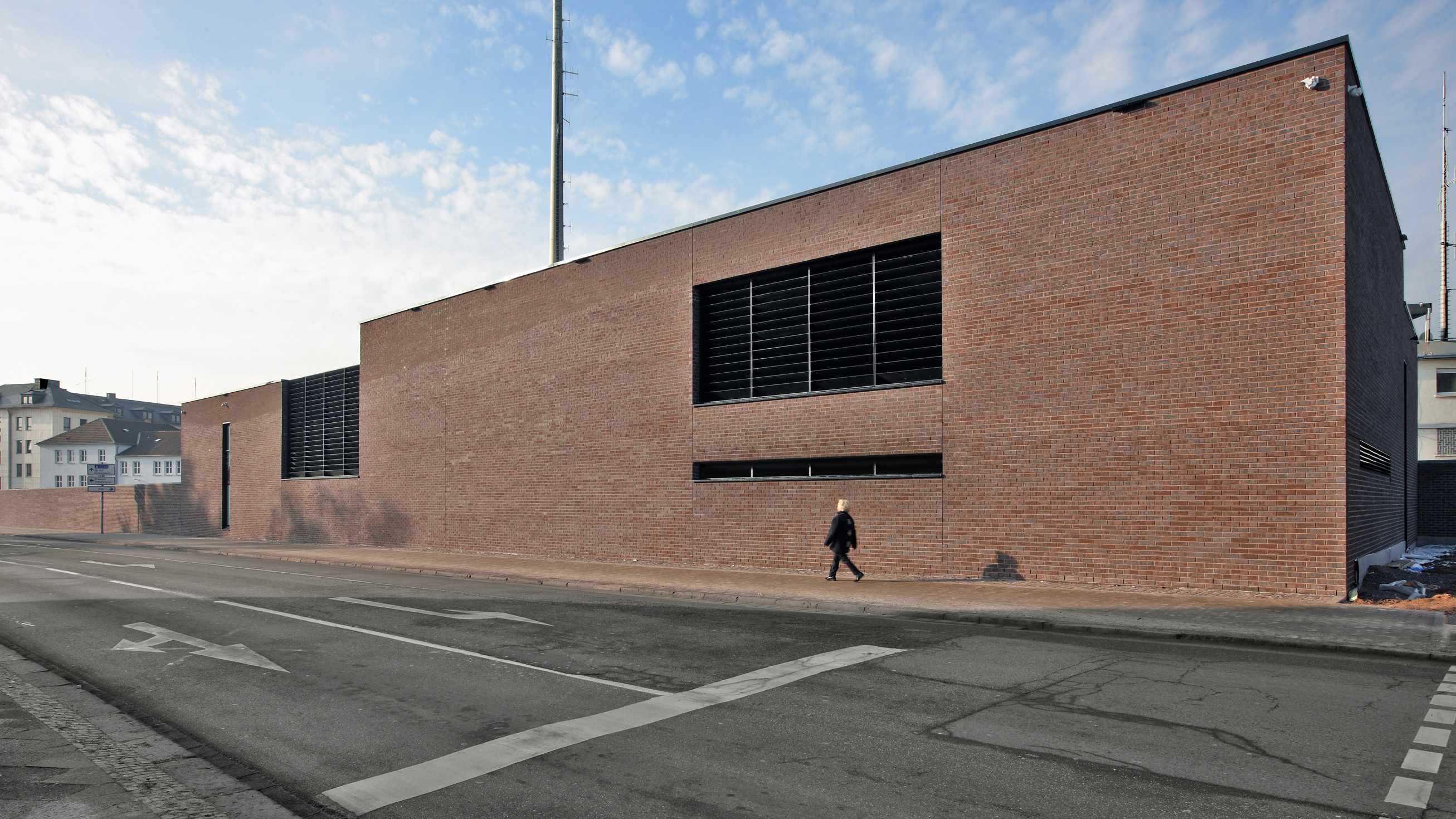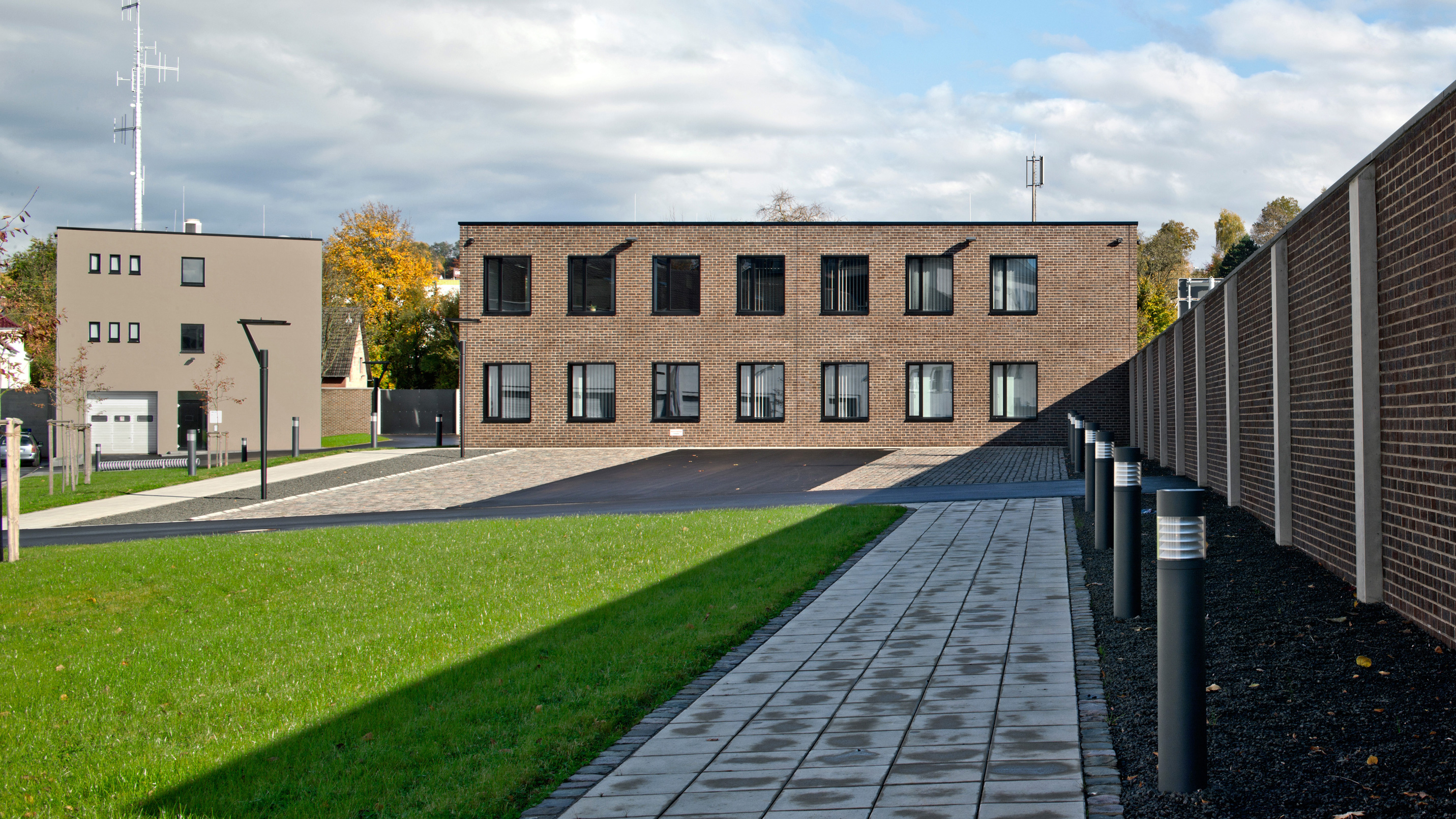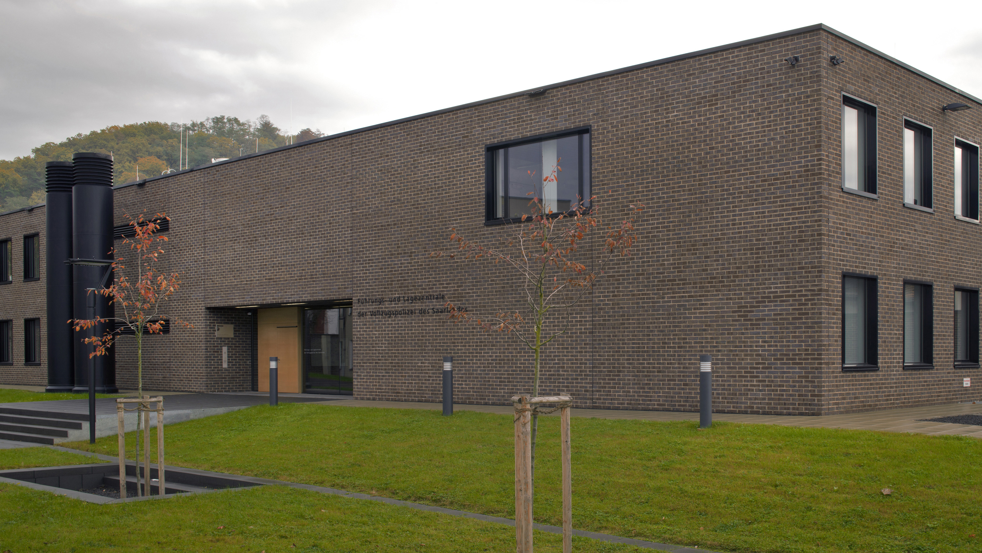 das grundstück des führungs- und lagezentrum der saarländischen vollzugspolizei, liegt an der aufgelockerten bebauung am rande der innenstadt. der zweigeschossige neubau akzentuiert diese nahtstelle durch seine einfache kubatur, die an der leitzentrale erhöht und nachvollziehbar ausgeformt wurde. das gebäude akzentuiert durch die größeren raumhöhen von konferenzraum und großraumbüro die städtebaulich prägnante ecke halbergstraße /am kieselhumes, nimmt das motiv der giebelständigkeit der gebäude 10 und 10a an der halbergstraße auf und bildet einen räumlichen abschluß für den südwestlich angrenzenden vorbereich des benachbarten gewerbebaus. die beiden nach innen wirkenden raumelemente innenhof und dachterrasse geben dem inneren raumgefüge eine wohltuende gliederung. sowohl der eingangsbereich als auch der raum für die einsatzsachbearbeitung profitieren hervorragend von derartigen raumelementen. die tragende konstruktion des zweigeschossigen massivbaus wurde in ortbetonbauweise erstellt und mit leichten trennwänden ergänzt. um die zugehörigkeit des neubaus zur einfriedung des kasernenareals als auch zu den bestehenden gebäuden zu betonen, wurde eine fassade in sichtziegelmauerwerk gewählt. aus sicherheitsgründen wurden zum öffentlichen raum möglichst wenig öffnungen vorgesehen und sämtliche diensträume zum gesicherten bereich orientiert.