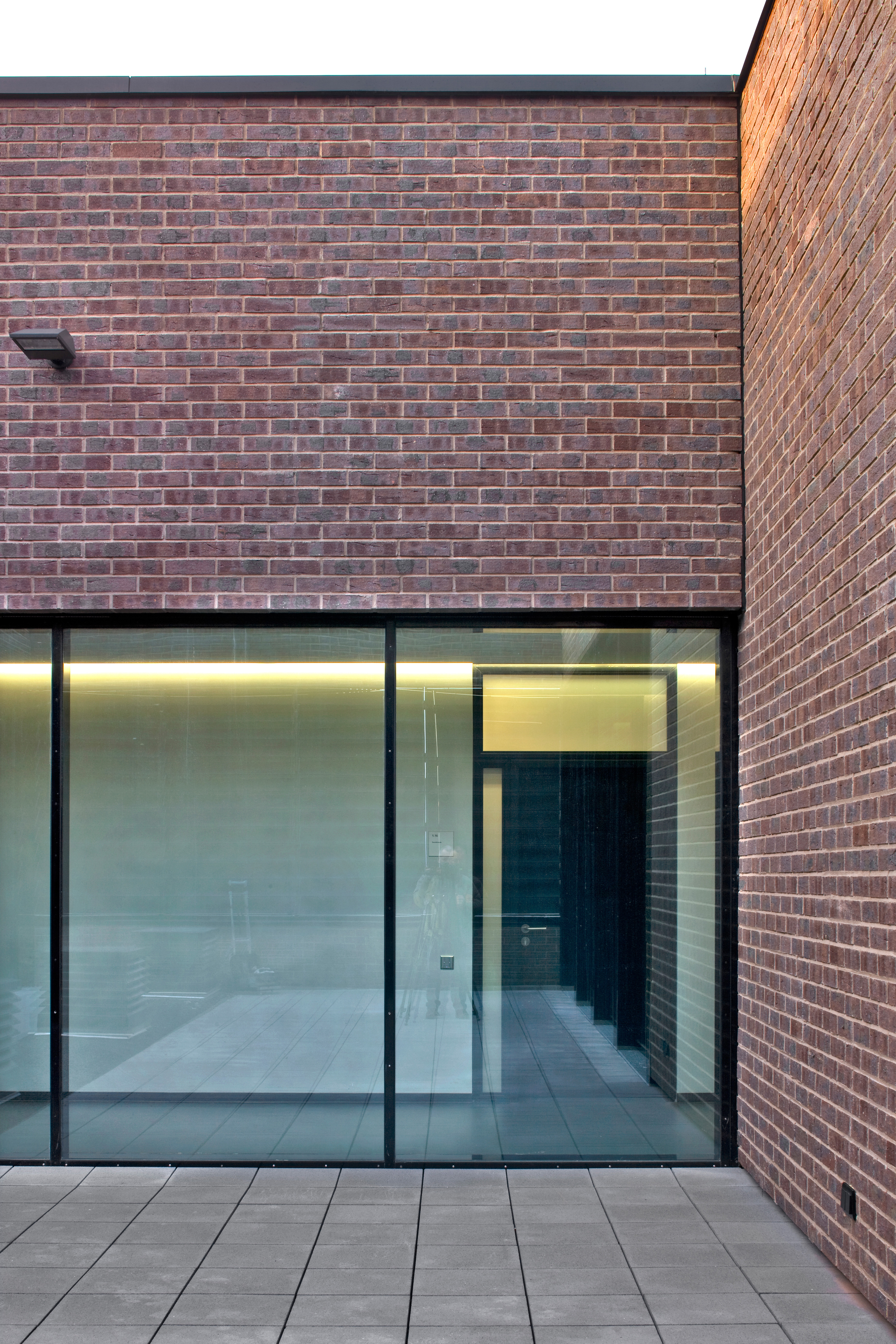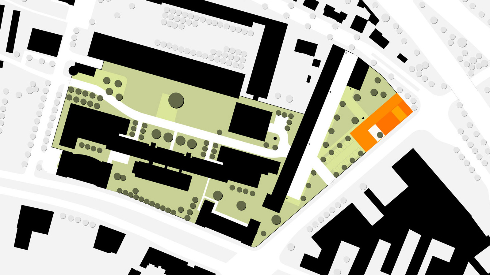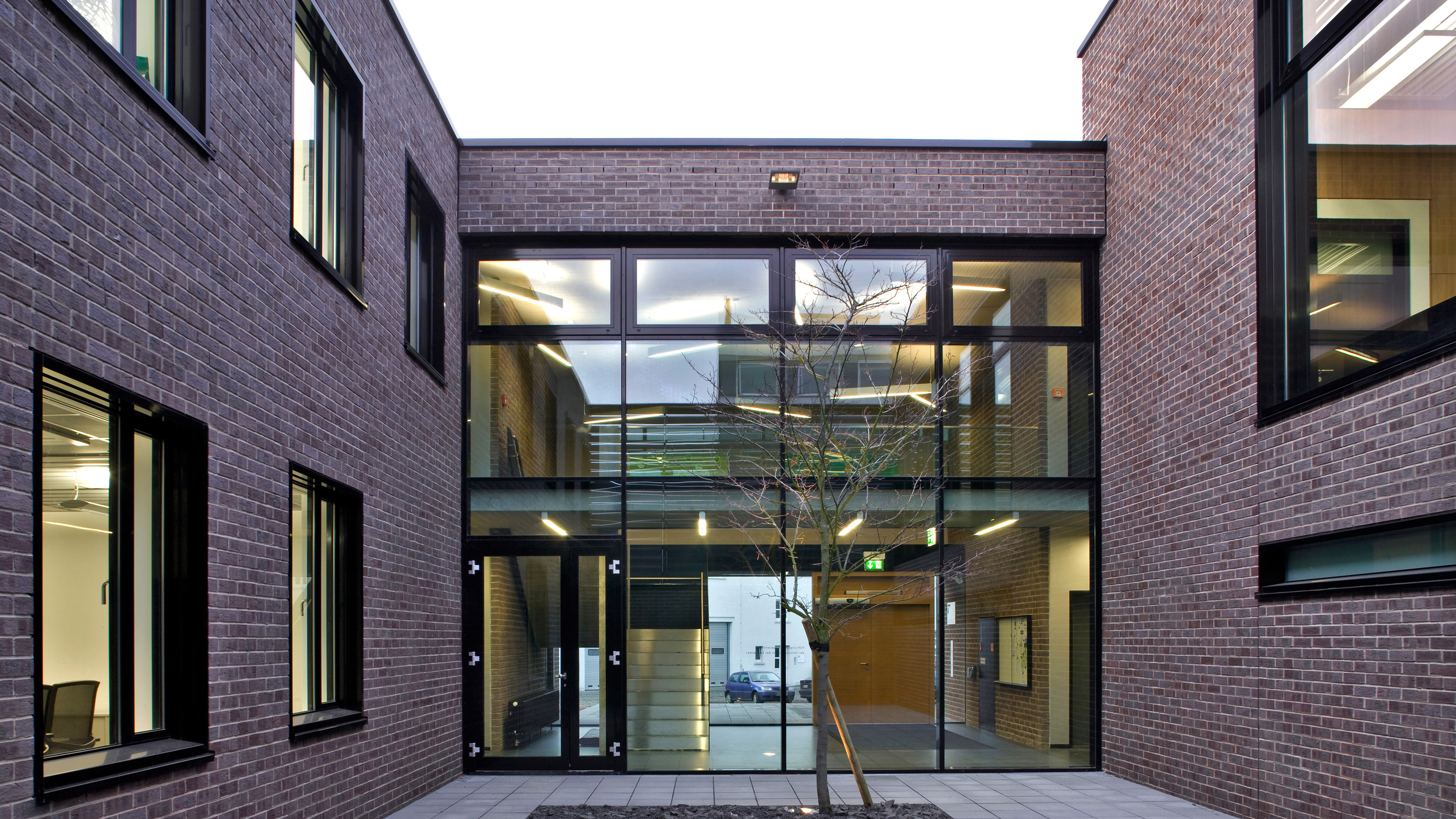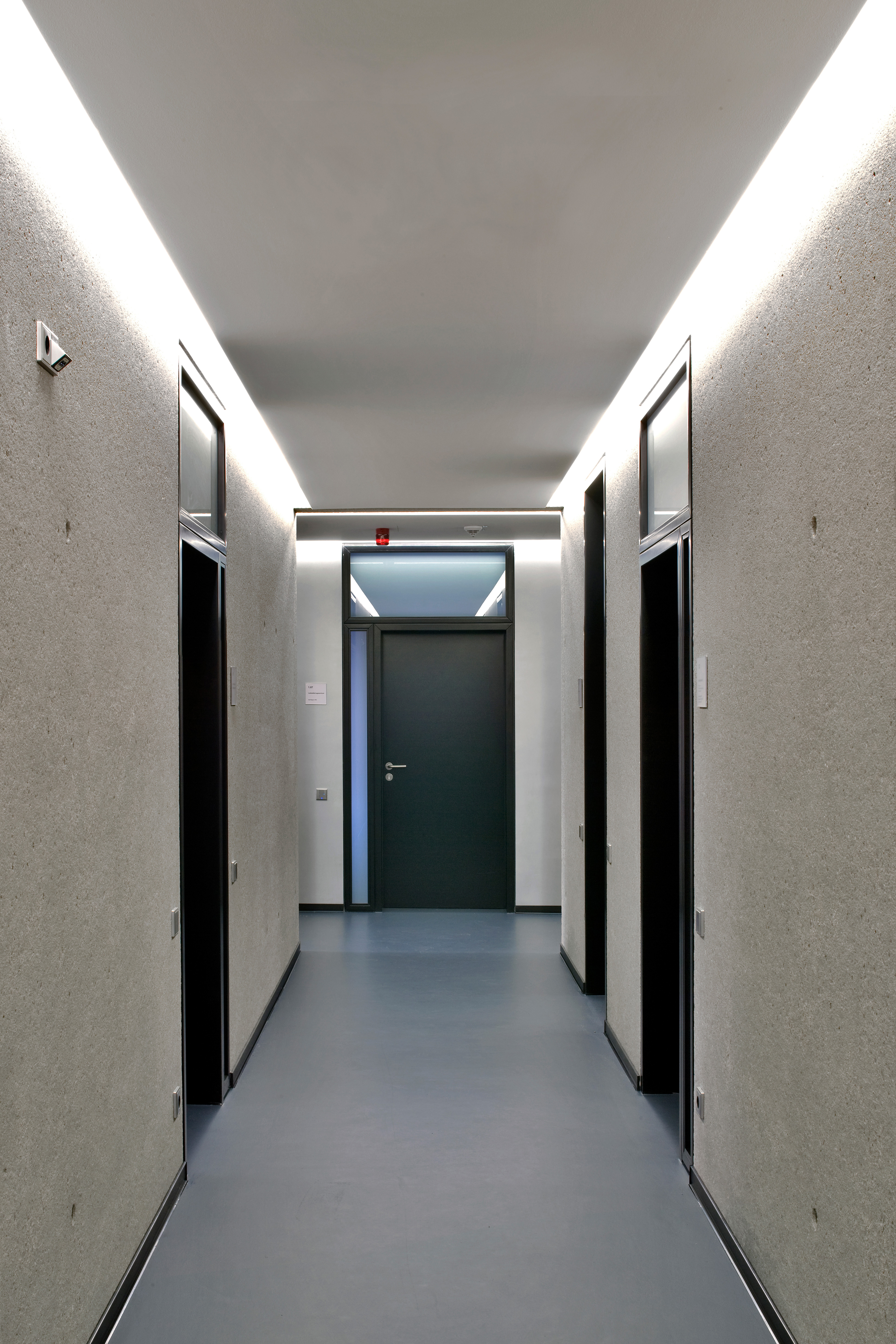 das grundstück des führungs- und lagezentrum der saarländischen vollzugspolizei, liegt an der aufgelockerten bebauung am rande der innenstadt. der zweigeschossige neubau akzentuiert diese nahtstelle durch seine einfache kubatur, die an der leitzentrale erhöht und nachvollziehbar ausgeformt wurde. das gebäude akzentuiert durch die größeren raumhöhen von konferenzraum und großraumbüro die städtebaulich prägnante ecke halbergstraße /am kieselhumes, nimmt das motiv der giebelständigkeit der gebäude 10 und 10a an der halbergstraße auf und bildet einen räumlichen abschluß für den südwestlich angrenzenden vorbereich des benachbarten gewerbebaus. die beiden nach innen wirkenden raumelemente innenhof und dachterrasse geben dem inneren raumgefüge eine wohltuende gliederung. sowohl der eingangsbereich als auch der raum für die einsatzsachbearbeitung profitieren hervorragend von derartigen raumelementen. die tragende konstruktion des zweigeschossigen massivbaus wurde in ortbetonbauweise erstellt und mit leichten trennwänden ergänzt. um die zugehörigkeit des neubaus zur einfriedung des kasernenareals als auch zu den bestehenden gebäuden zu betonen, wurde eine fassade in sichtziegelmauerwerk gewählt. aus sicherheitsgründen wurden zum öffentlichen raum möglichst wenig öffnungen vorgesehen und sämtliche diensträume zum gesicherten bereich orientiert.