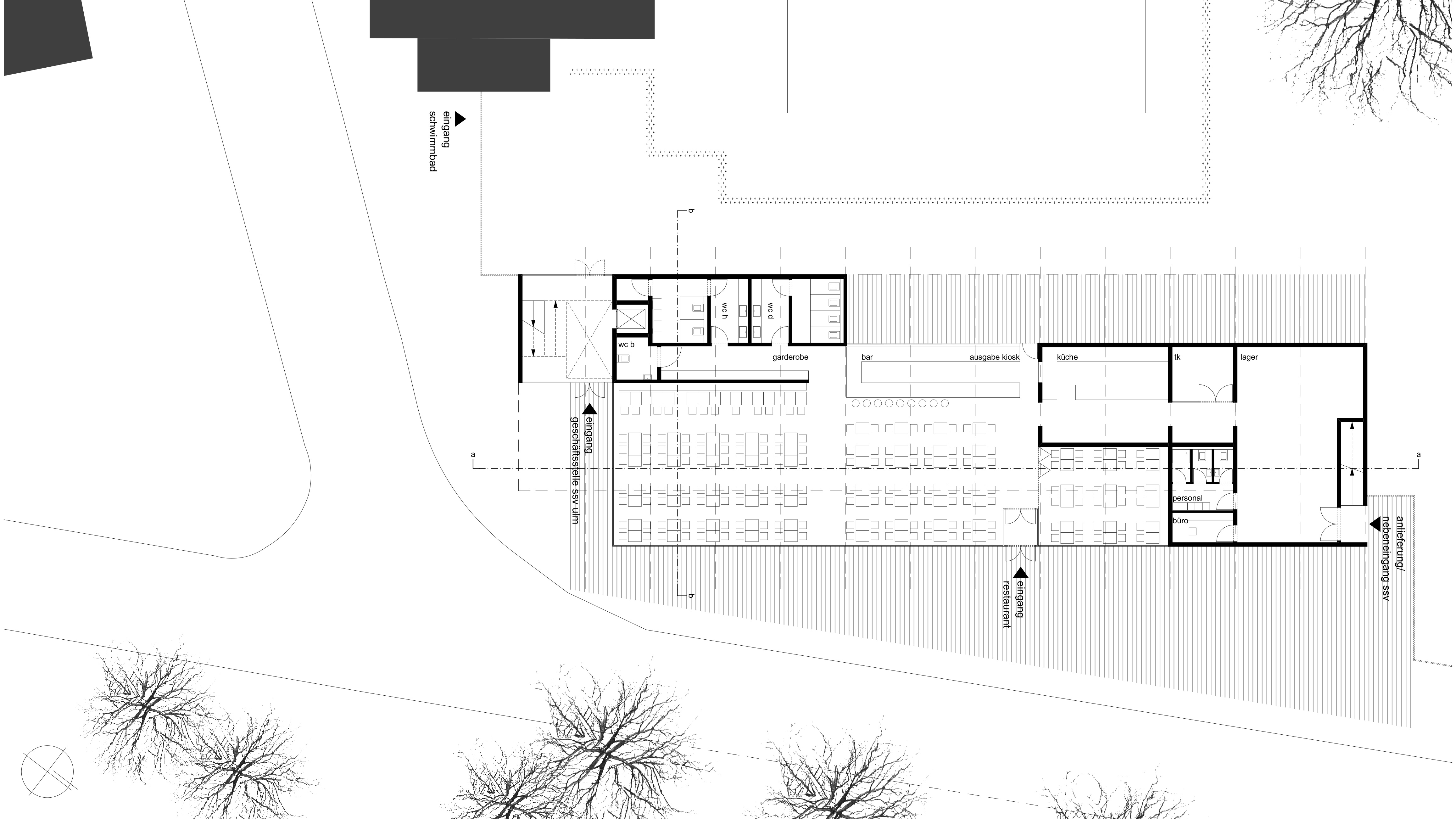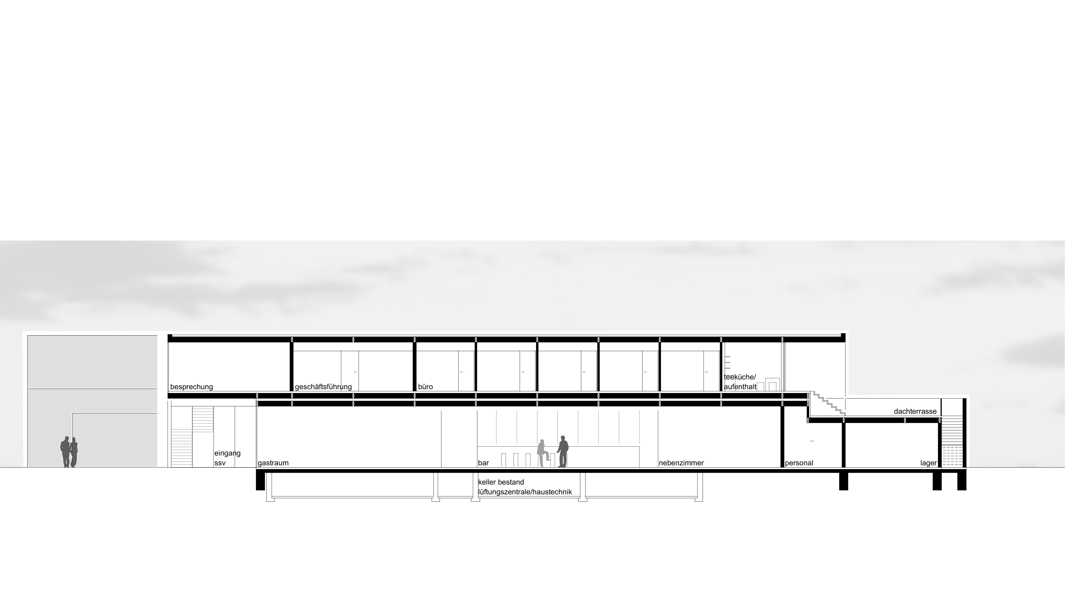 auf dem grundstück der bestehenden geschäftsstelle mit vereinslokal kann ein neues gebäude entstehen, das die vorhandenen funktionen erneut aufnimmt und dem ort eine neue identität geben soll. entwurfsthema ist die entwicklung der „neuen adresse“ des vereins, sowie die entflechtung sich überlagernder wege und nutzungen. der klare baukörper gliedert sich in die vorhandene baustruktur ein, setzt durch seinen markanten eingangsbereich ein klares zeichen und betont so die „adresse“ des ssv ulm 1846. im neubau wird die vorhandene strukturierung mit der teilung von og in geschäftsstelle und eg in vereinslokal wieder aufgenommen, die funktionen über zwei erschließungswege sind klar voneinander getrennt. im og entsteht eine flexibel einteilbare bürofläche mit barrierefreiem zugang. das restaurant im erdgeschoss öffnet sich mit seiner glasfassade und großen terrasse richtung donau und schafft einen attraktiven aufenthaltsbereich. die innere organisation des restaurants ist so aufgebaut, dass mit wenig personalaufwand sowohl das restaurant, als auch der kiosk des freibads betrieben werden können ohne die beiden funktionen miteinander zu vermischen.