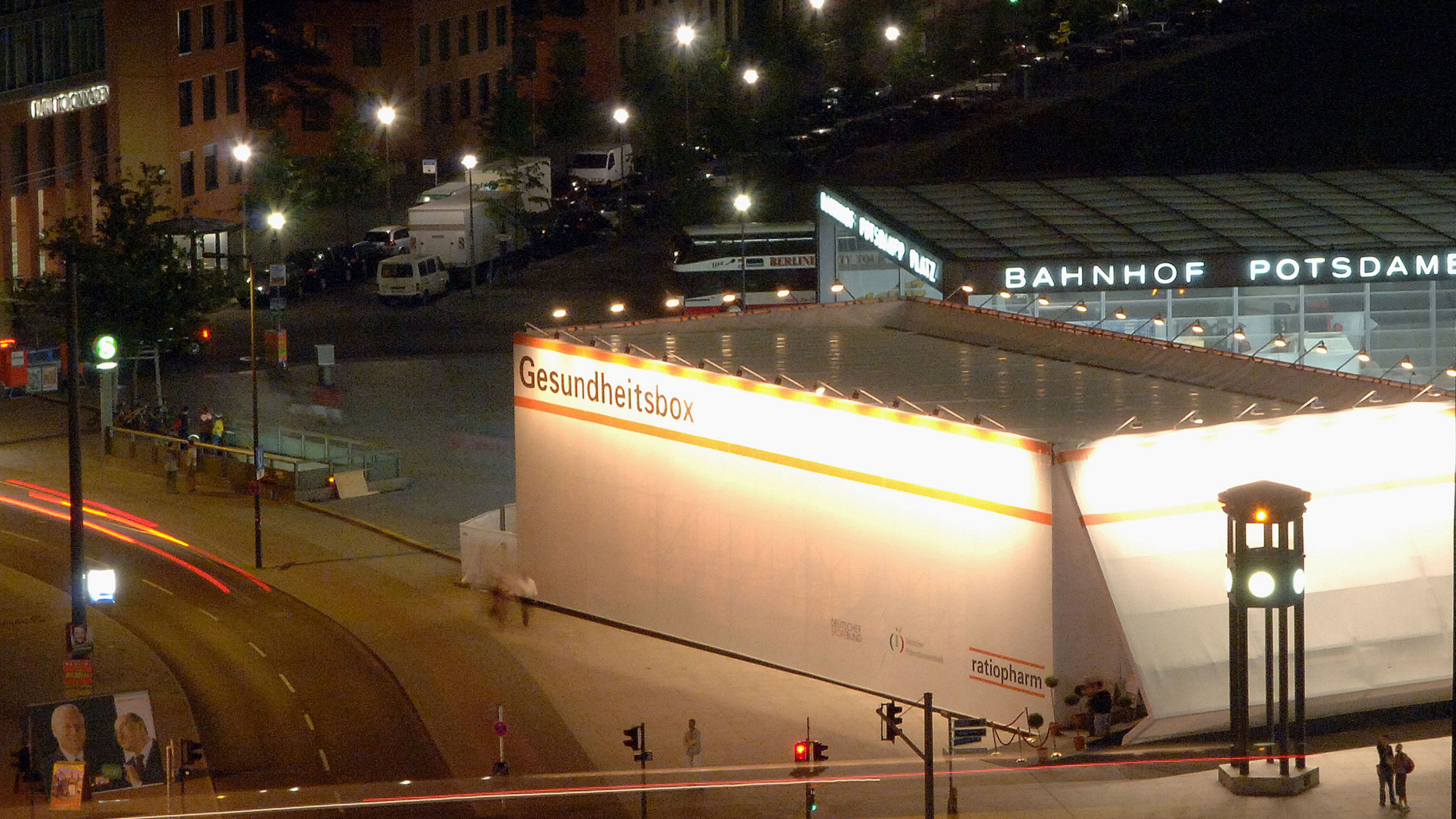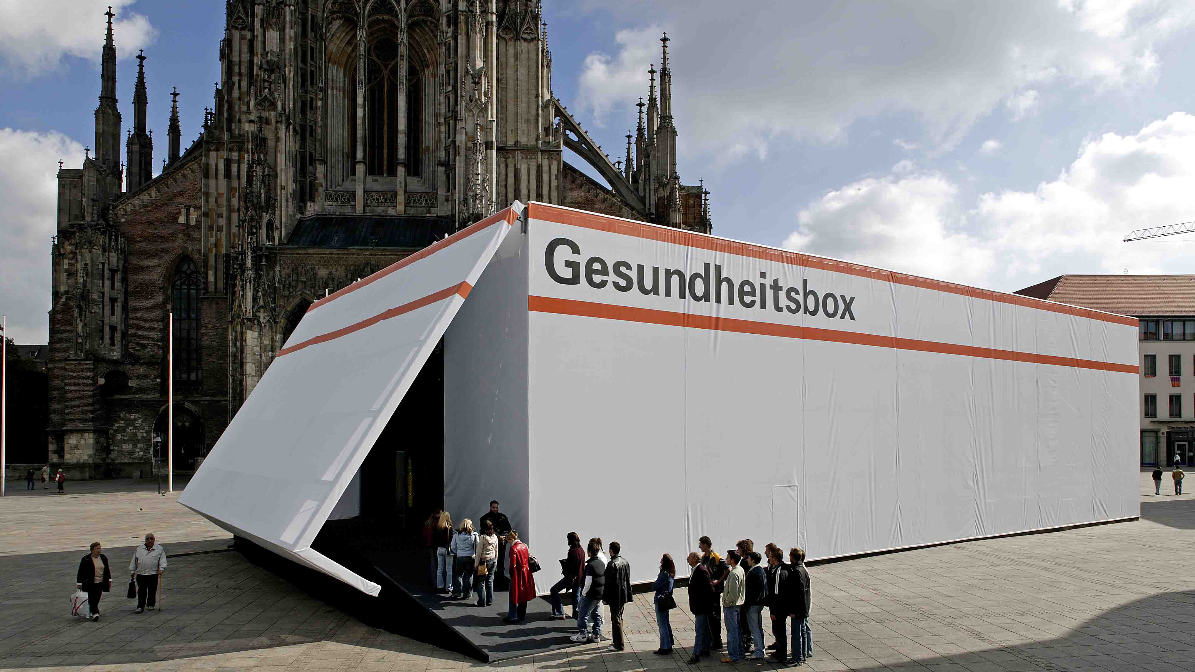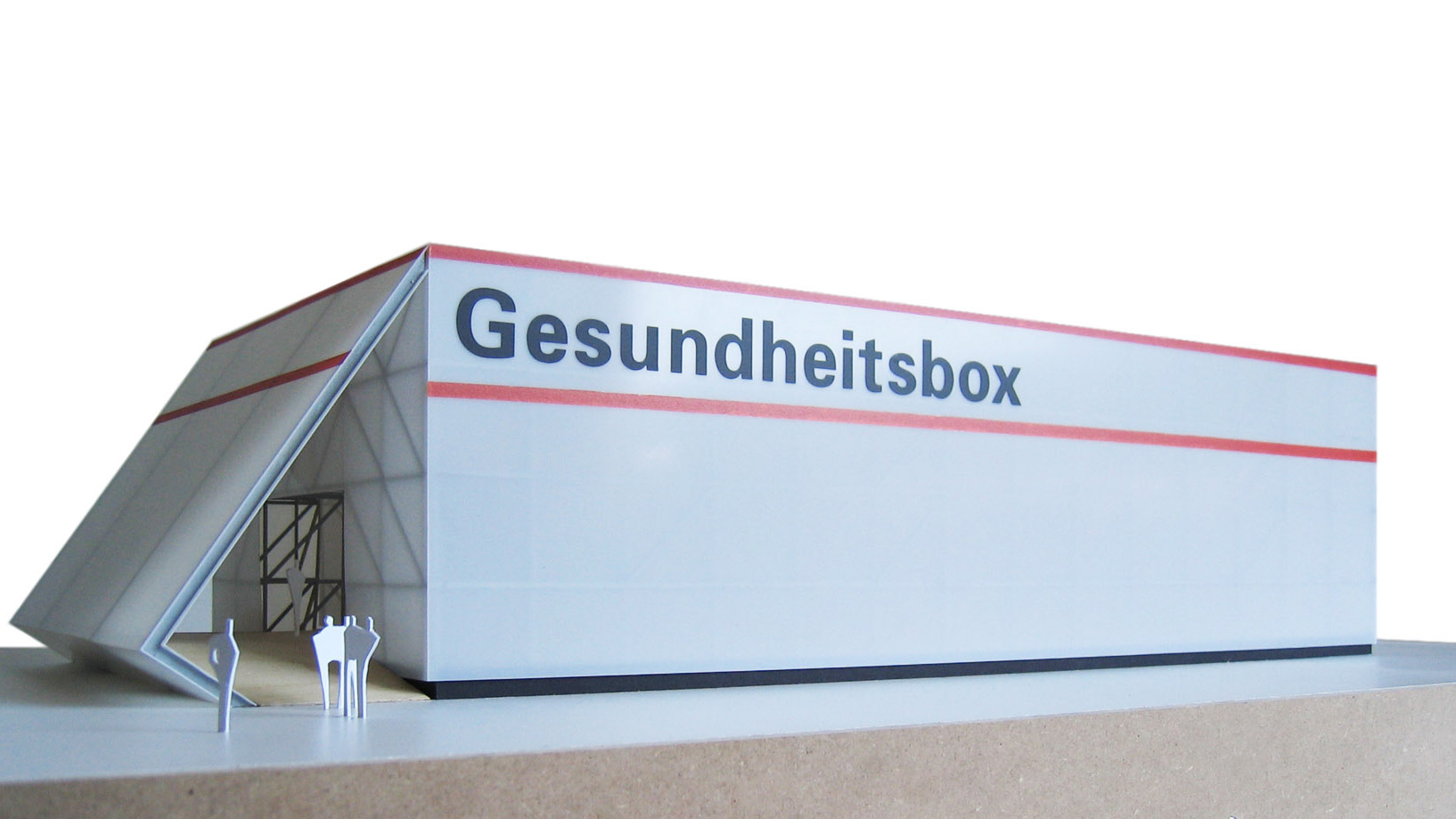 die temporäre „gesundheitsbox“ ist eine begehbare „tablettenschachtel“. sie wurde zum anlass des 30-jährigen bestehens des pharmakonzerns ratiopharm im rahmen einer bundesweiten präventionsinitiative in zusammenarbeit mit namhaften partnern aus gesundheit, sport und wissenschaft initiiert. hochstrasser.architekten war federführend für die gesamtproduktion und die ausstellungsgestaltung verantwortlich. im inneren der 30 x 15 m großen box wird gezielt über die grossen volkskrankheiten aufgeklärt. der besucher kann über untersuchungen seinen gesundheitszustand überprüfen. auf der galerieebene finden meetings und vorträge statt. konstruktiv wurde ein layher-gerüst für den „rohbau“ eingesetzt, grossformatige netzvinyle hüllen den baukörper ein. die innenfassade aus pvc-planen dient als leinwand und windschutz. mit einer bauzeit von knapp vier arbeitstagen ist eine lebendige erlebniswelt zum thema gesundheit und prävention entstanden. 2005 tourte die „gesundheitsbox“  von ulm durch die größten städte deutschlands: dresden, münchen, köln, berlin.