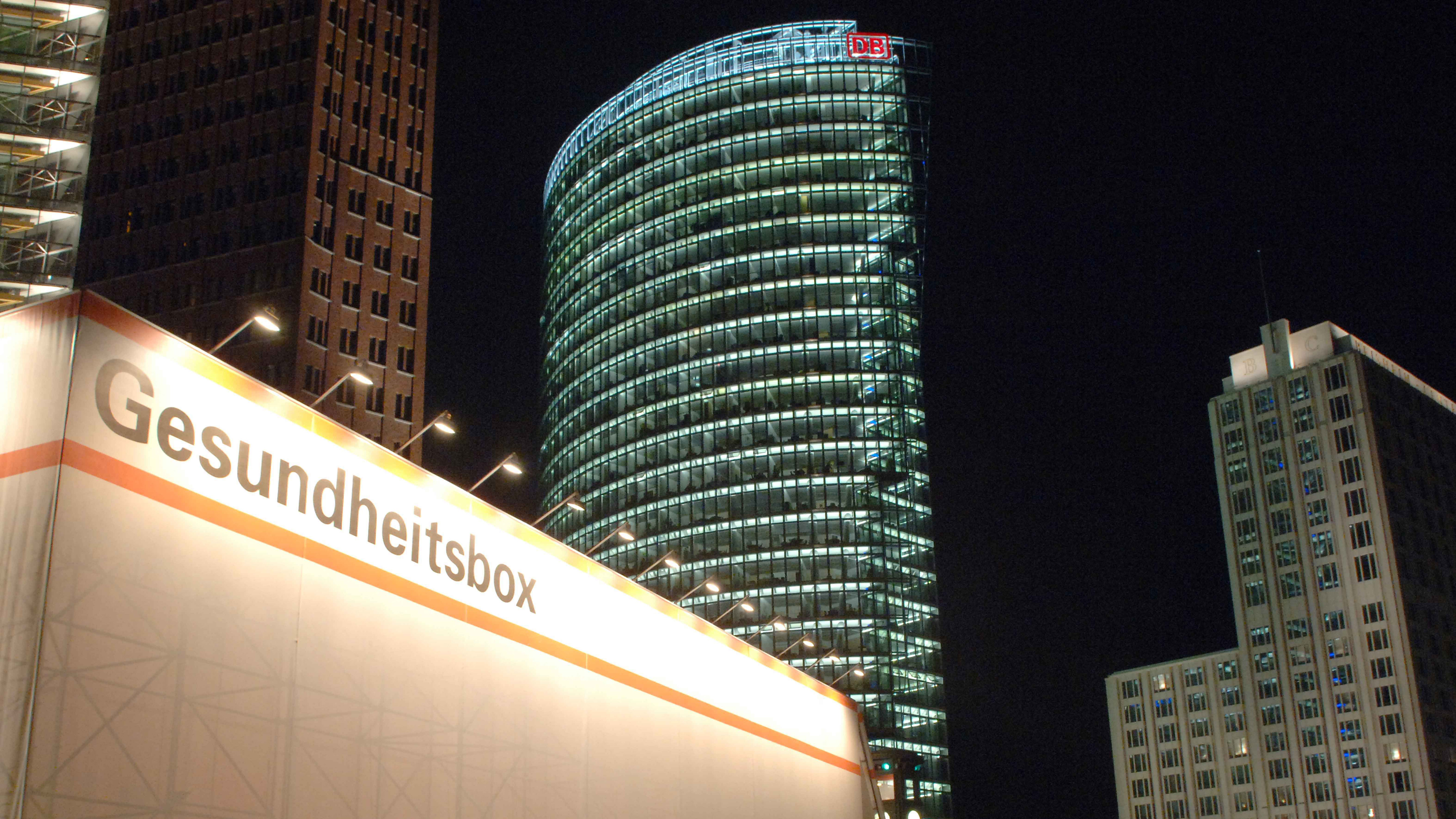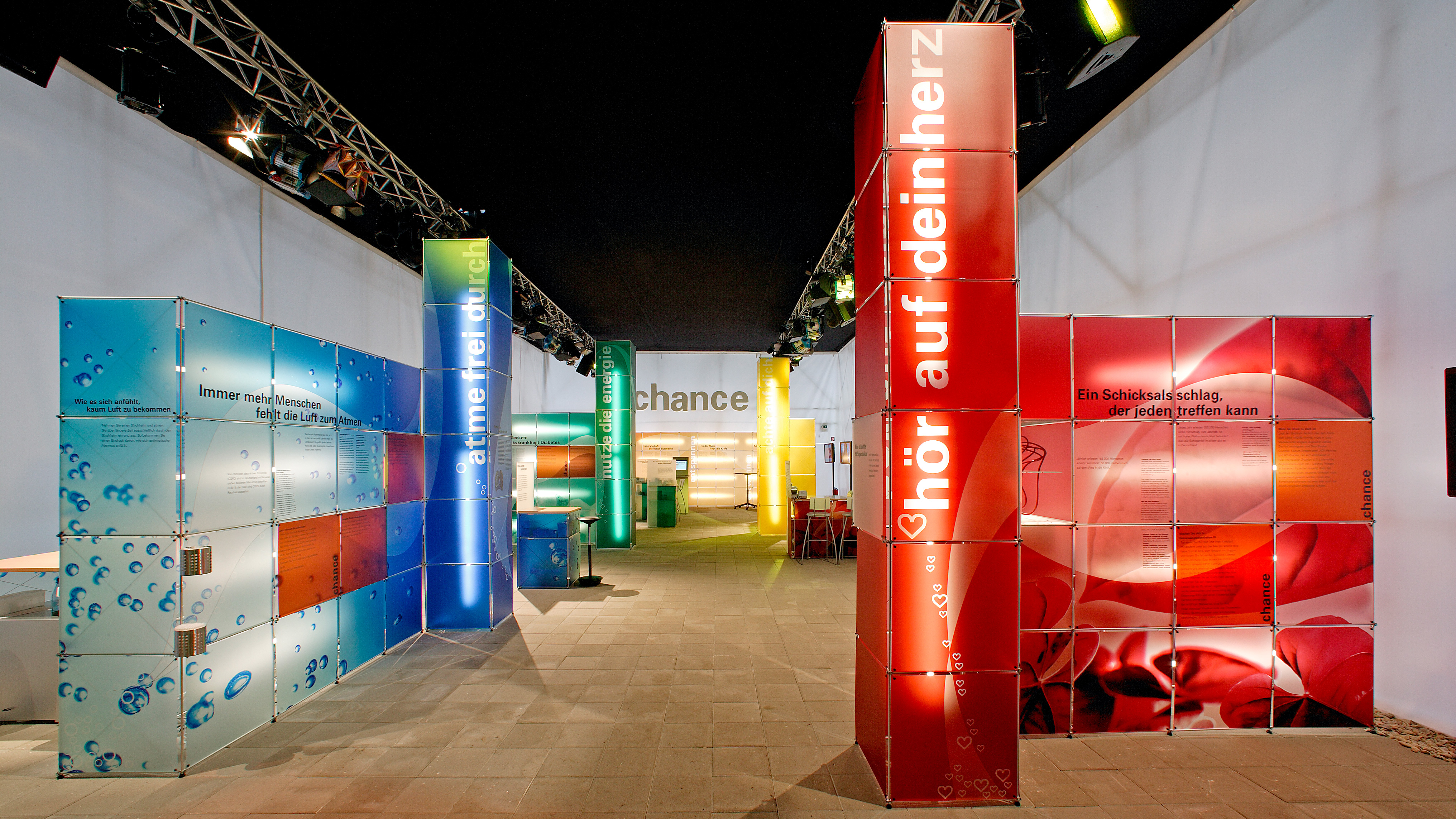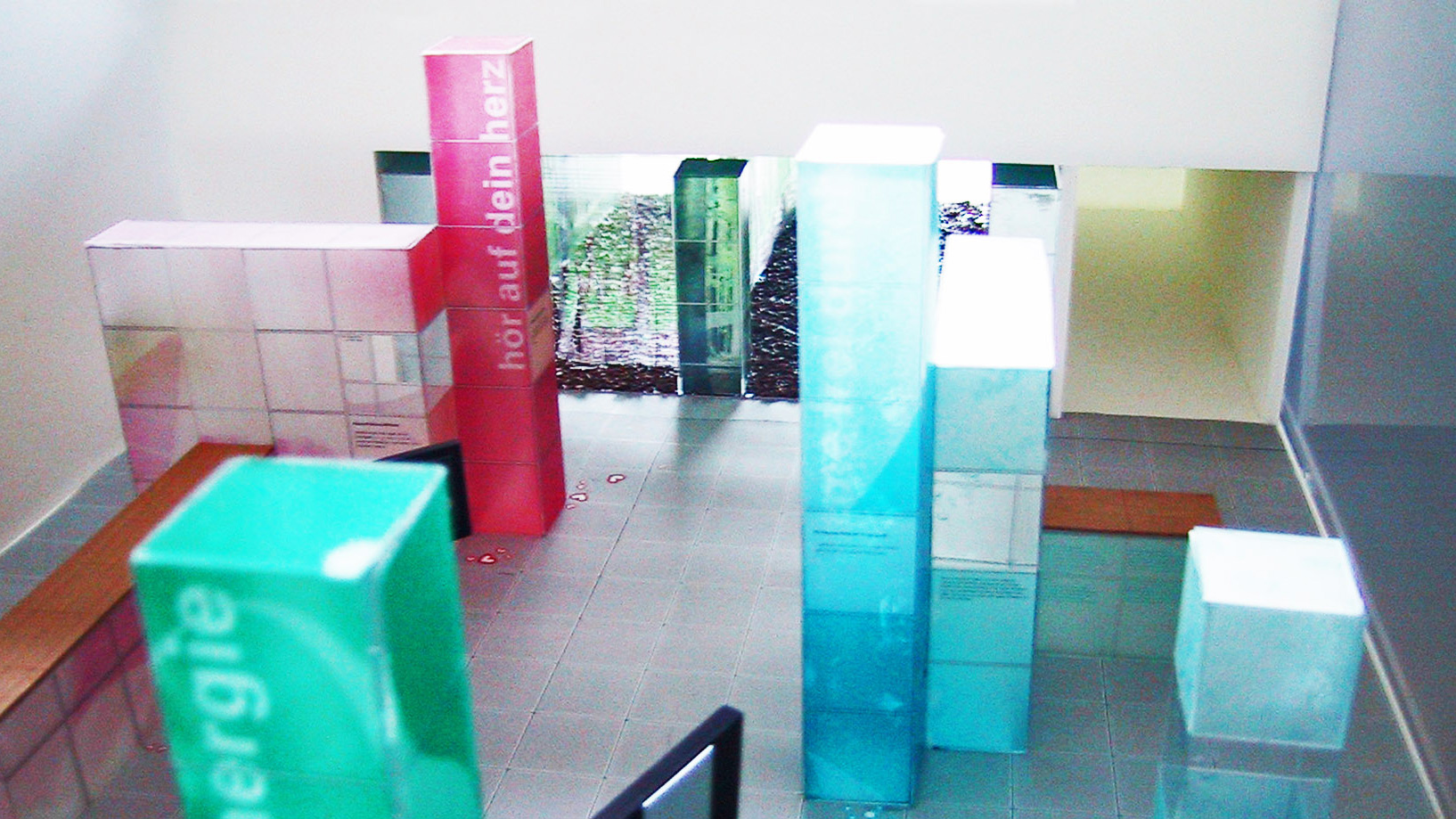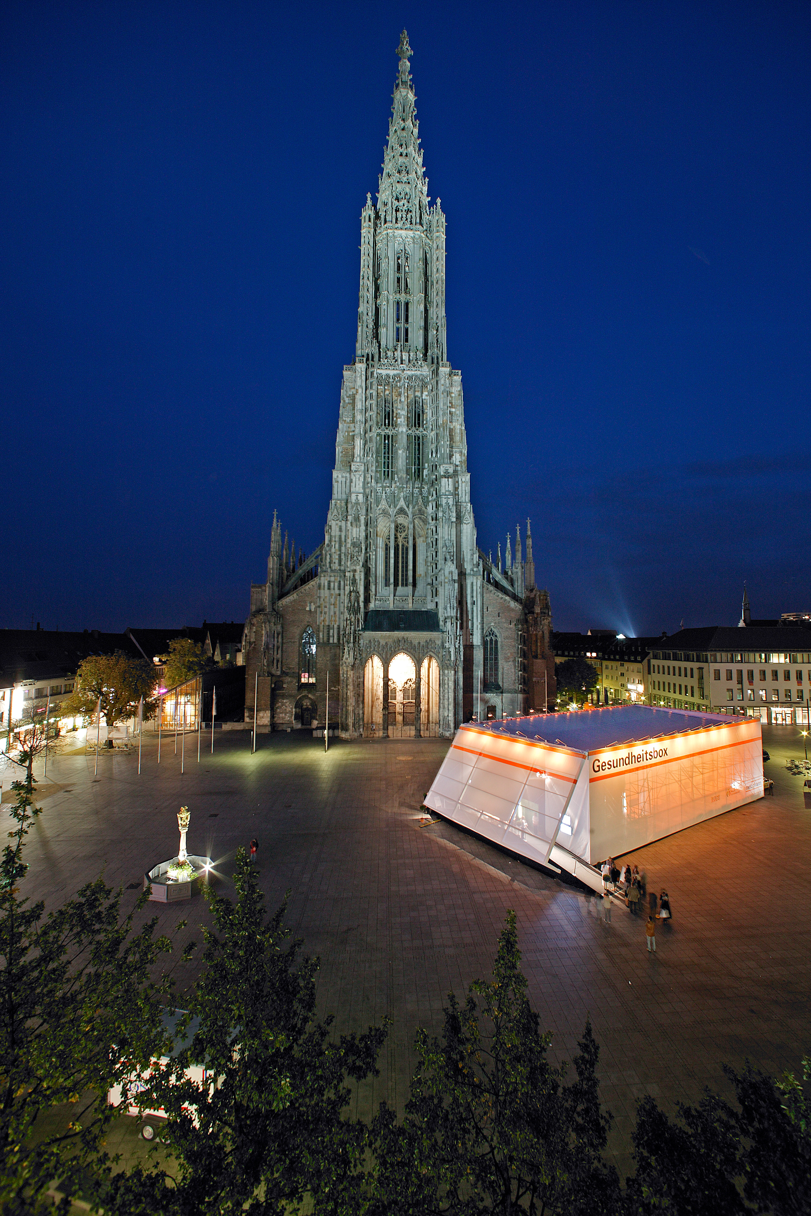 die temporäre „gesundheitsbox“ ist eine begehbare „tablettenschachtel“. sie wurde zum anlass des 30-jährigen bestehens des pharmakonzerns ratiopharm im rahmen einer bundesweiten präventionsinitiative in zusammenarbeit mit namhaften partnern aus gesundheit, sport und wissenschaft initiiert. hochstrasser.architekten war federführend für die gesamtproduktion und die ausstellungsgestaltung verantwortlich. im inneren der 30 x 15 m großen box wird gezielt über die grossen volkskrankheiten aufgeklärt. der besucher kann über untersuchungen seinen gesundheitszustand überprüfen. auf der galerieebene finden meetings und vorträge statt. konstruktiv wurde ein layher-gerüst für den „rohbau“ eingesetzt, grossformatige netzvinyle hüllen den baukörper ein. die innenfassade aus pvc-planen dient als leinwand und windschutz. mit einer bauzeit von knapp vier arbeitstagen ist eine lebendige erlebniswelt zum thema gesundheit und prävention entstanden. 2005 tourte die „gesundheitsbox“  von ulm durch die größten städte deutschlands: dresden, münchen, köln, berlin.