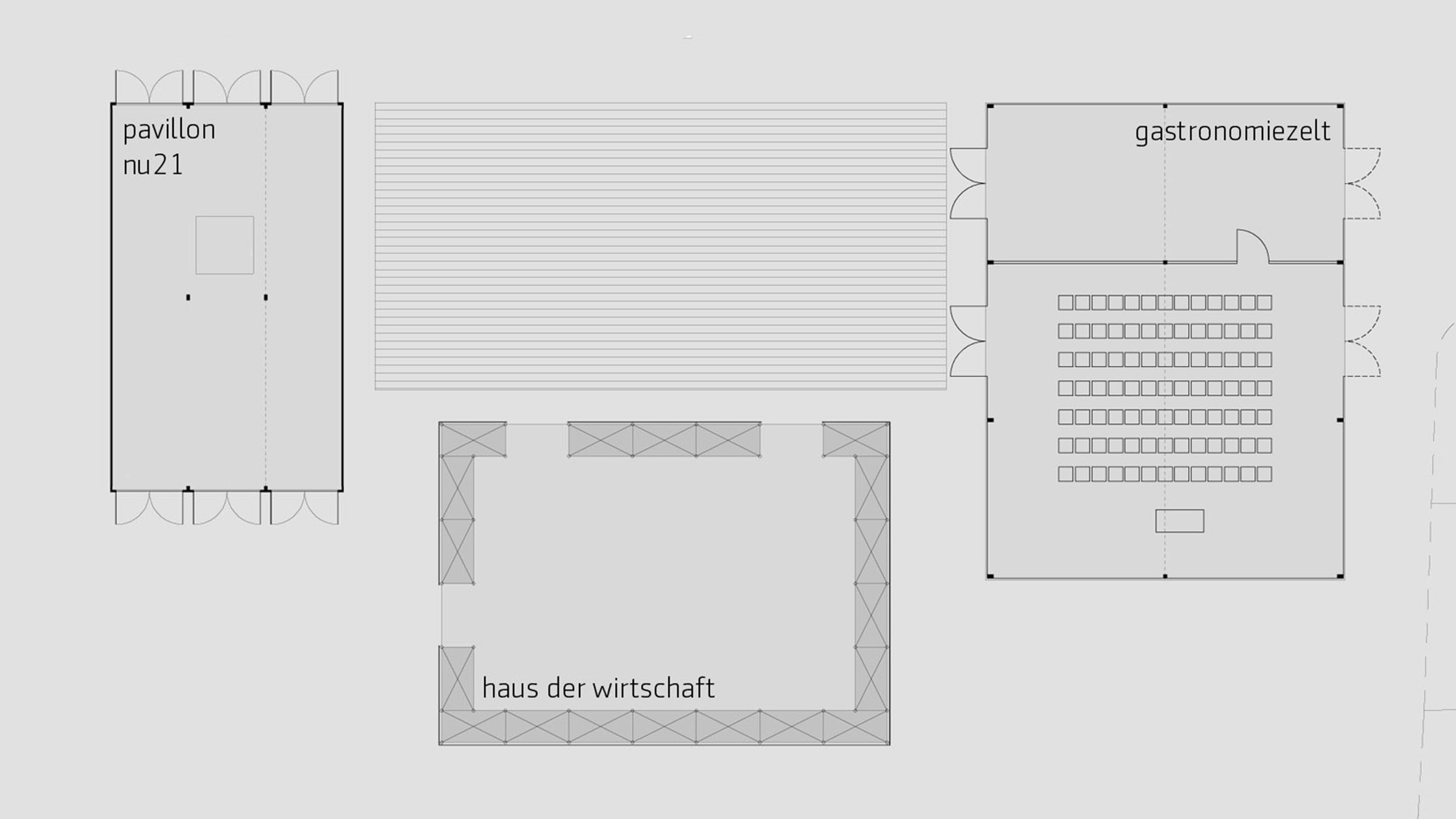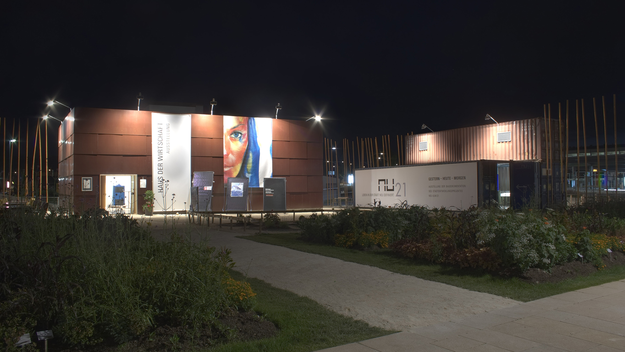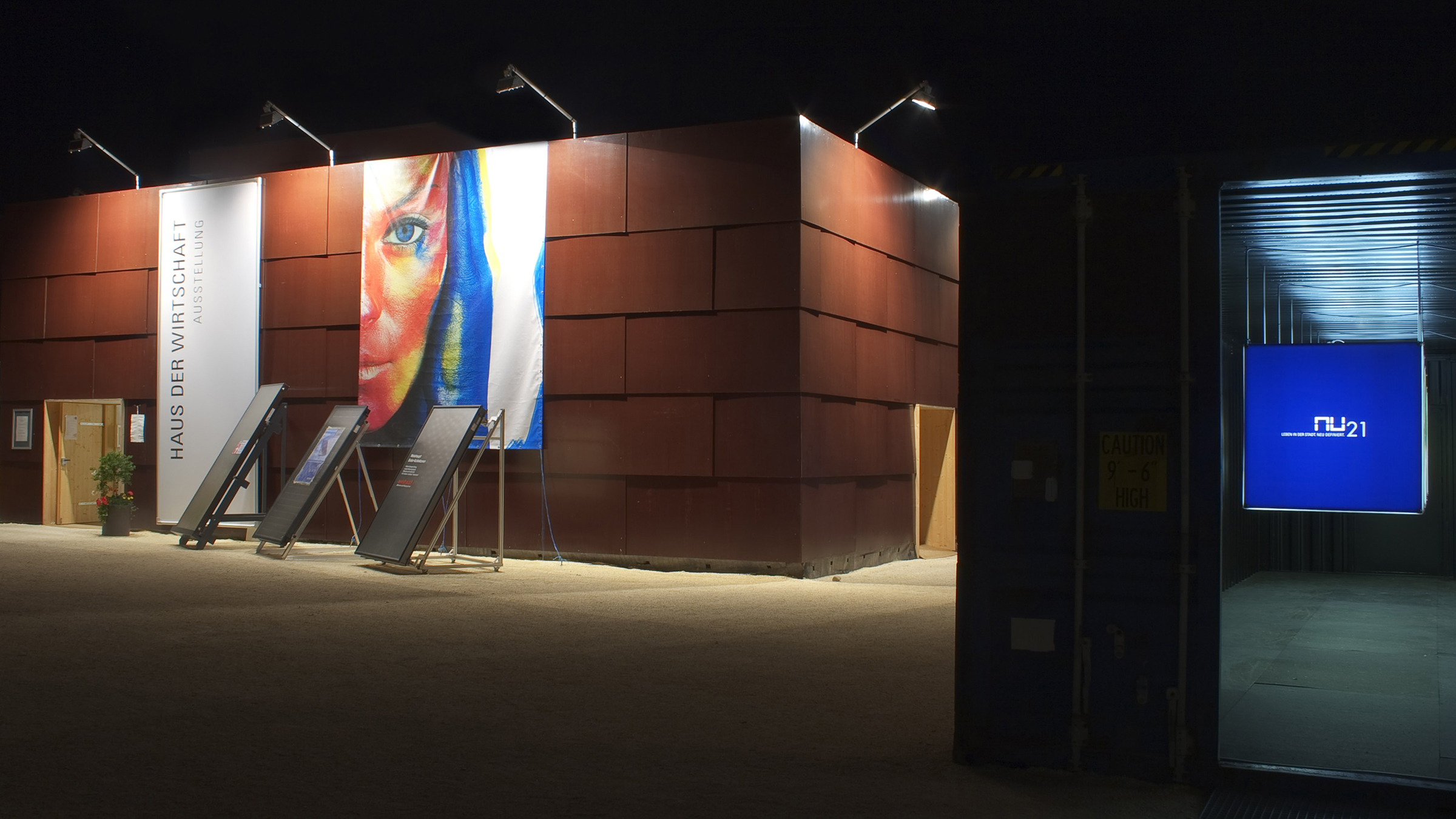 das temporäre „haus der wirtschaft“ wurde als präsentationsraum für die handwerker der region auf der landesgartenschau 2008 konzipiert. konstruktiv wurde ein layher-gerüst für den „rohbau“ eingesetzt, grossformatige, geschuppt eingebaute schaltafeln hüllen den baukörper ein. die innenfassade aus pvc-netzvinyl dient als leinwand und windschutz. in einer bauzeit von knapp acht arbeitstagen ist ein vielfältig bespielbarer aktionsraum entstanden, dessen wesentliche bauleistungen über sponsoring der beteiligten firmen erfolgte. wir selbst haben unsere leistung unentgeltlich erbracht.