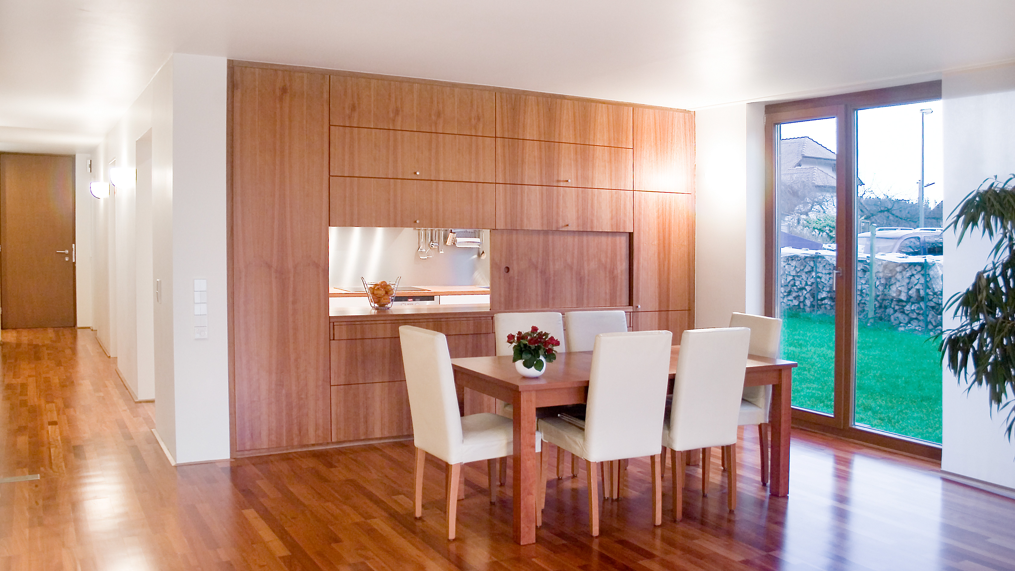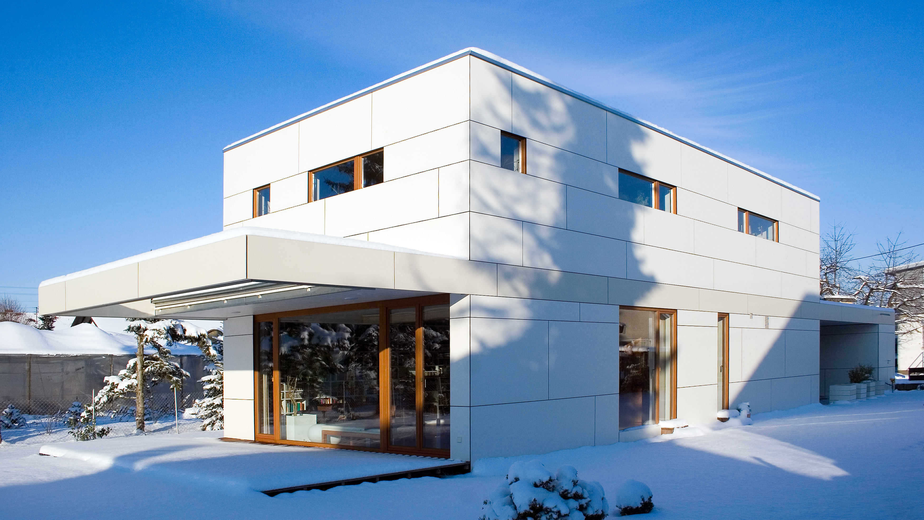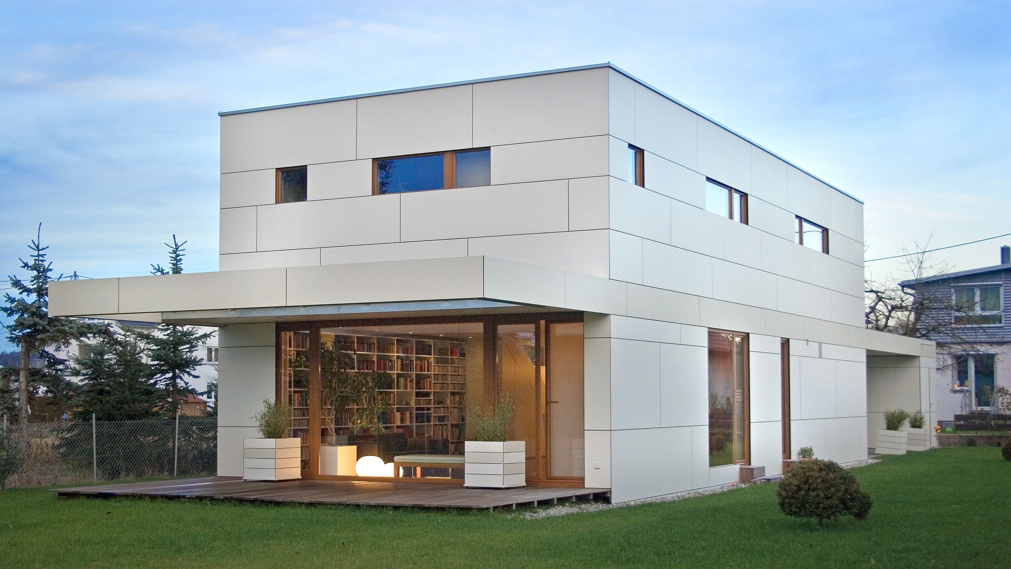 ein langes, schmales grundstück in einer gewachsenen dörflichen struktur war der ausgangspunkt für den schlichten, strukturiert gegliederten entwurf dieses wohnhauses. die lange und schmale zufahrt von osten bildet an deren ende den eckpunkt für das gebäude, welches sich längs der ost-west-achse entwickelt und somit nach süden und westen freiräume schafft. der auftakt des gebäudes im osten bildet der kellerersatzraum, der über den überdachten carport zum haus hin überleitet. hier befindet sich auch der eingang zum haus. im westen öffnet sich der wohn- und essbereich komplett zur angrenzenden, überdachten holzterrasse und dem garten. der vom geräteraum bis zur terrasse durchlaufende bügel zeichnet sich auch farblich differenziert in der fassade ab. die räume sind an dem an der außenwand liegenden flur mit treppe nach süden hin aufgereiht. durch das ganze haus, auch das bad, zieht sich das kirschholzparkett. sämtliche schränke und die küche sind maßgefertigt und wie die wände in weiß gehalten. das haus ist auf einer tragenden betonbodenplatte in holzständerweise erbaut und nicht unterkellert. die vorgehängte, hinterlüftete fassade besteht aus unsichtbar befestigten hpl-fassadenplatten, die in zwei cremefarbenen, hellen farbtönen gehalten sind.
