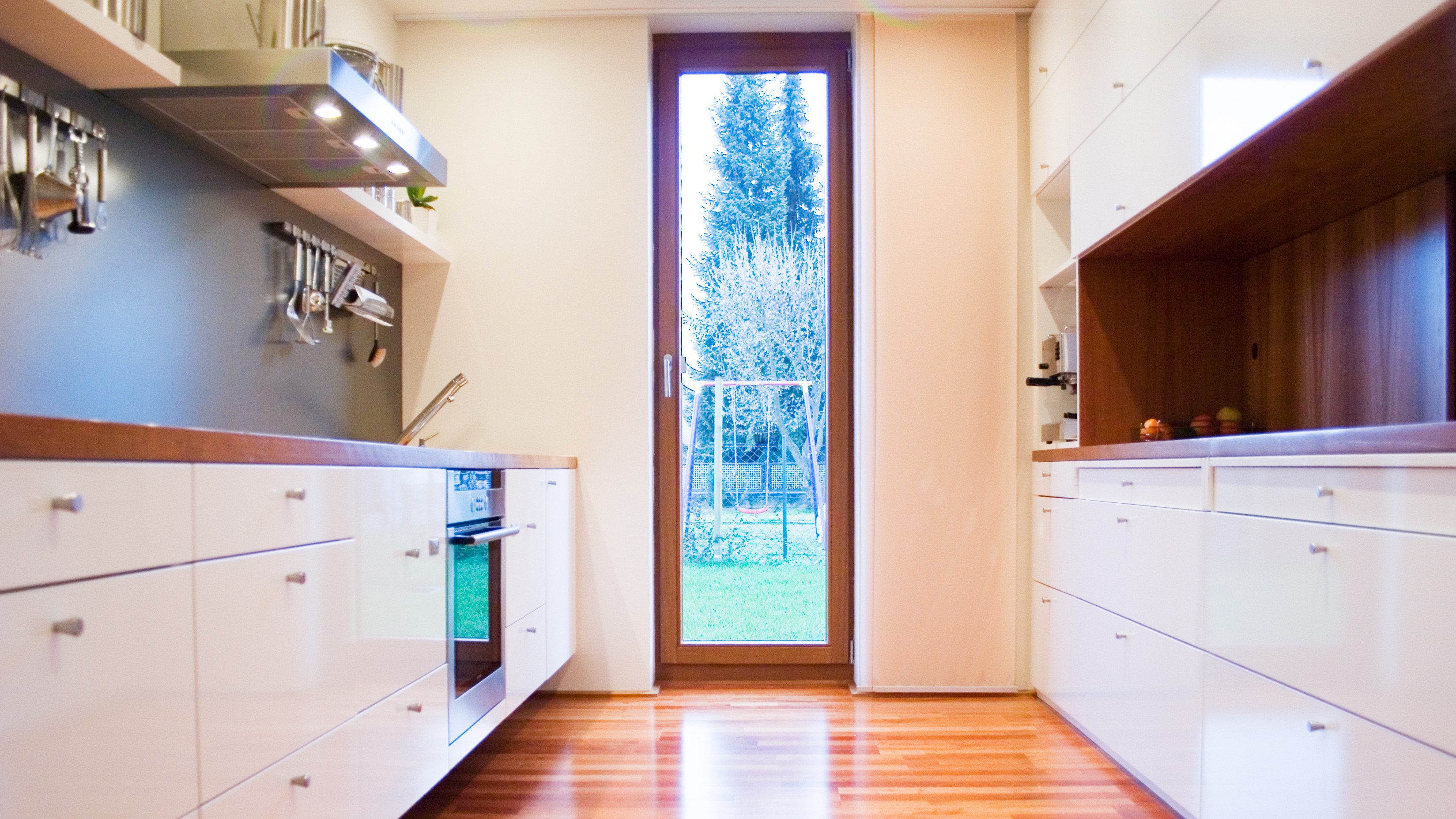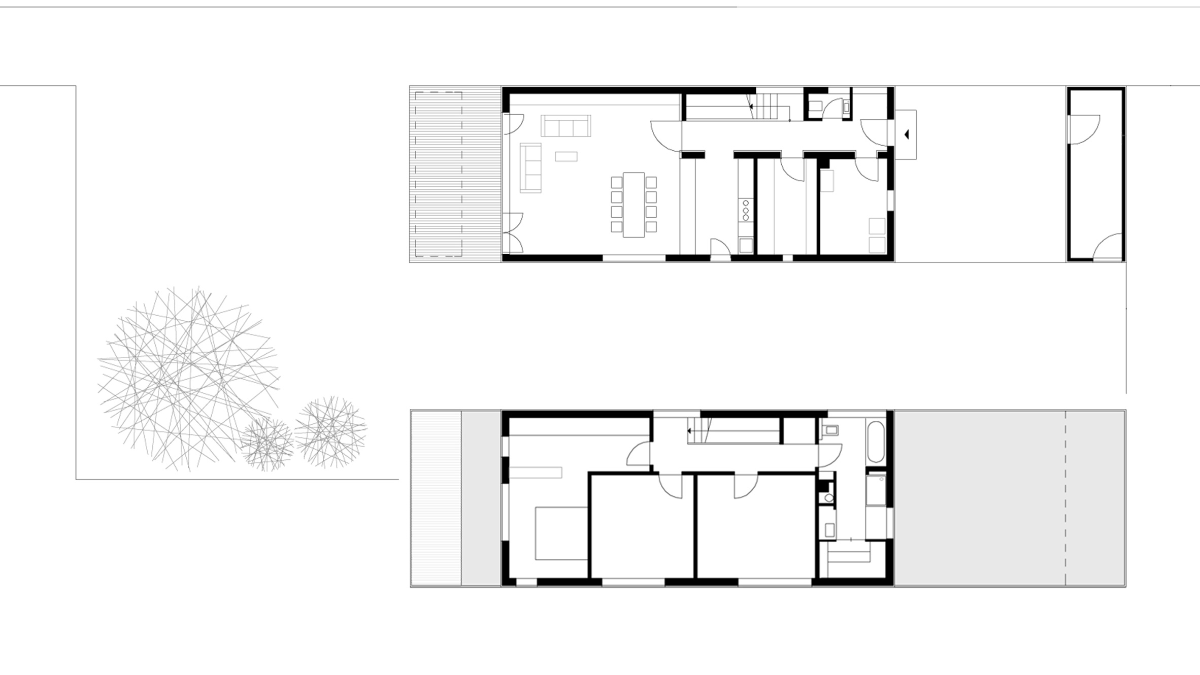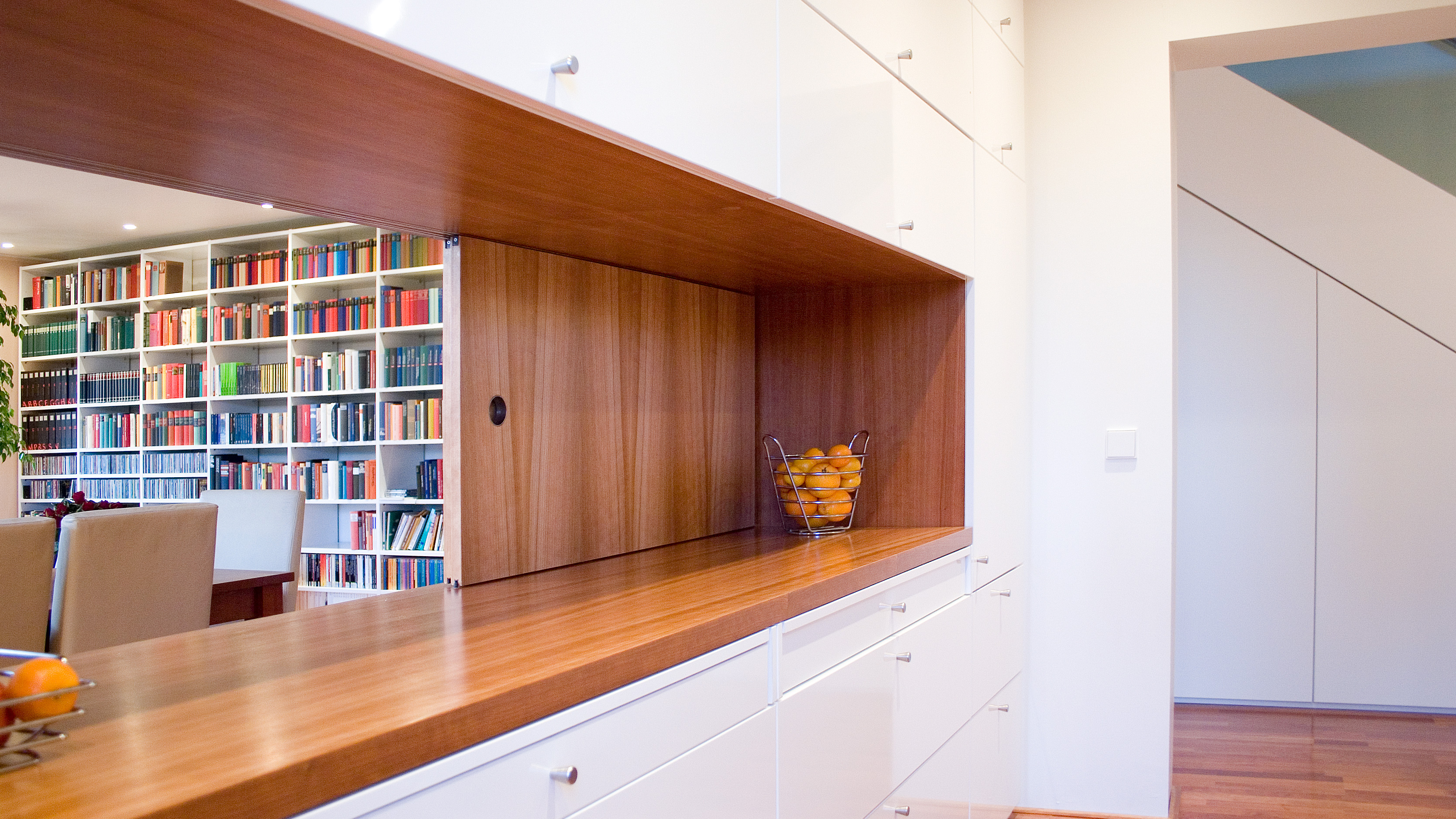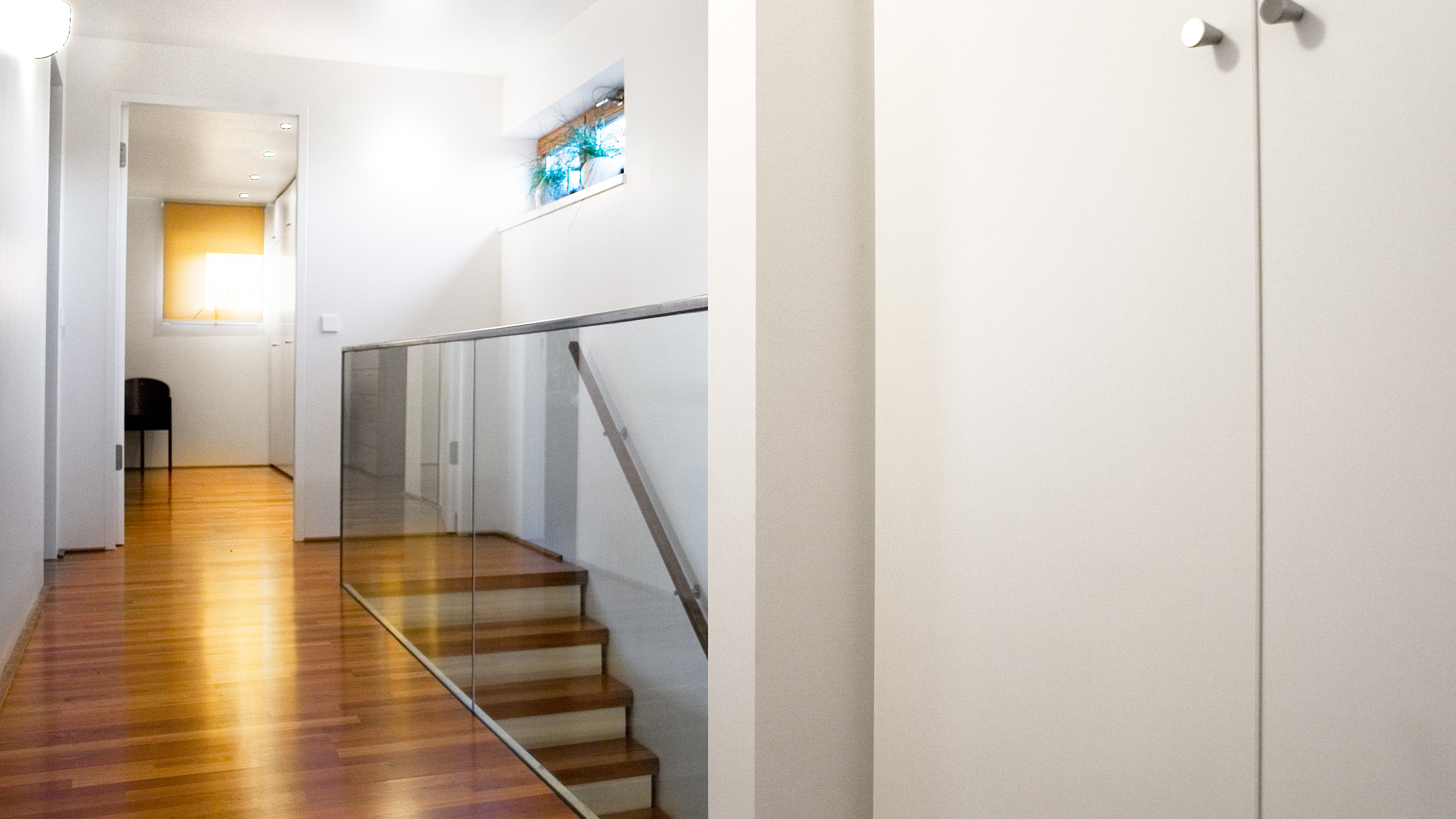 ein langes, schmales grundstück in einer gewachsenen dörflichen struktur war der ausgangspunkt für den schlichten, strukturiert gegliederten entwurf dieses wohnhauses. die lange und schmale zufahrt von osten bildet an deren ende den eckpunkt für das gebäude, welches sich längs der ost-west-achse entwickelt und somit nach süden und westen freiräume schafft. der auftakt des gebäudes im osten bildet der kellerersatzraum, der über den überdachten carport zum haus hin überleitet. hier befindet sich auch der eingang zum haus. im westen öffnet sich der wohn- und essbereich komplett zur angrenzenden, überdachten holzterrasse und dem garten. der vom geräteraum bis zur terrasse durchlaufende bügel zeichnet sich auch farblich differenziert in der fassade ab. die räume sind an dem an der außenwand liegenden flur mit treppe nach süden hin aufgereiht. durch das ganze haus, auch das bad, zieht sich das kirschholzparkett. sämtliche schränke und die küche sind maßgefertigt und wie die wände in weiß gehalten. das haus ist auf einer tragenden betonbodenplatte in holzständerweise erbaut und nicht unterkellert. die vorgehängte, hinterlüftete fassade besteht aus unsichtbar befestigten hpl-fassadenplatten, die in zwei cremefarbenen, hellen farbtönen gehalten sind.