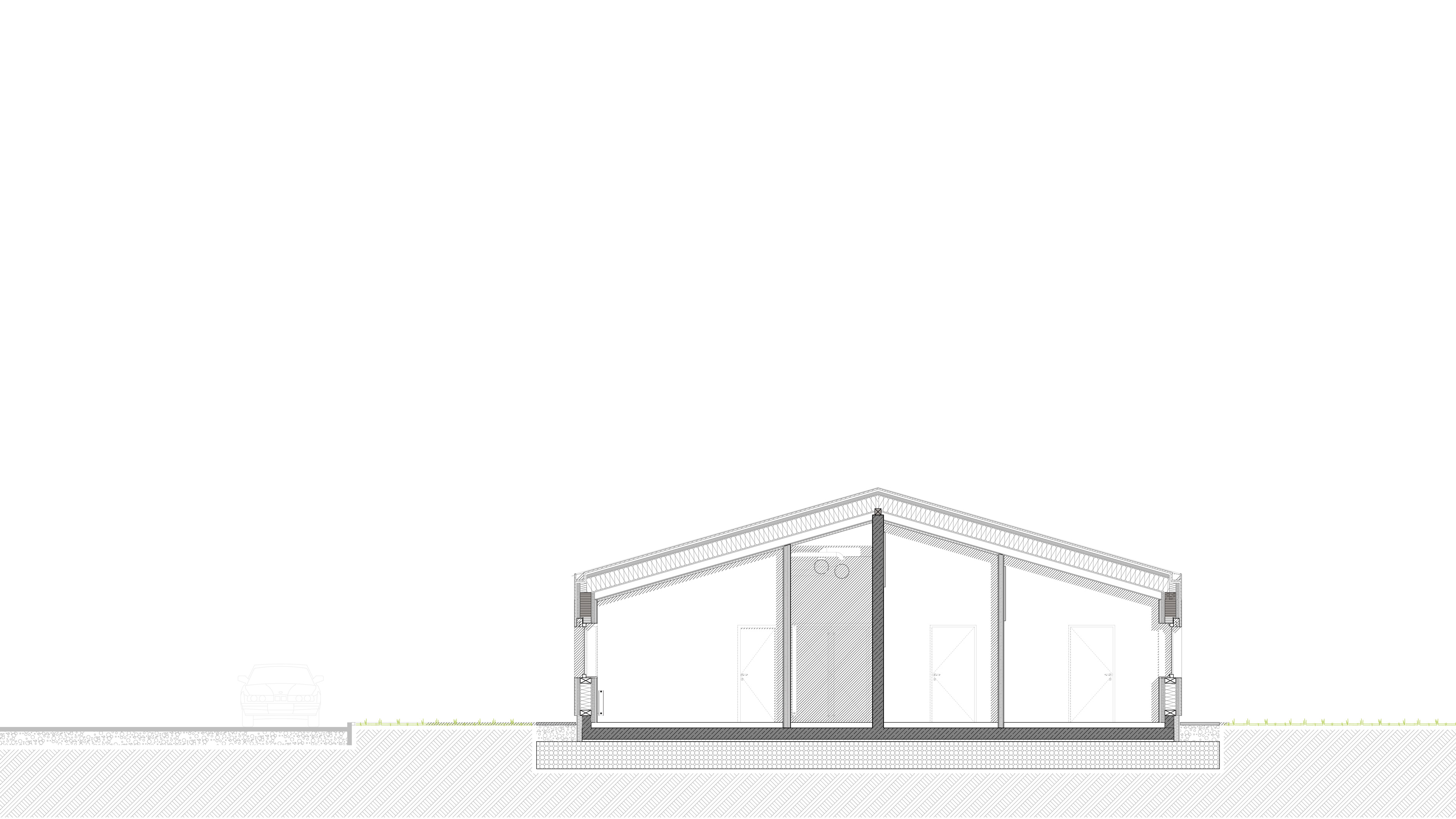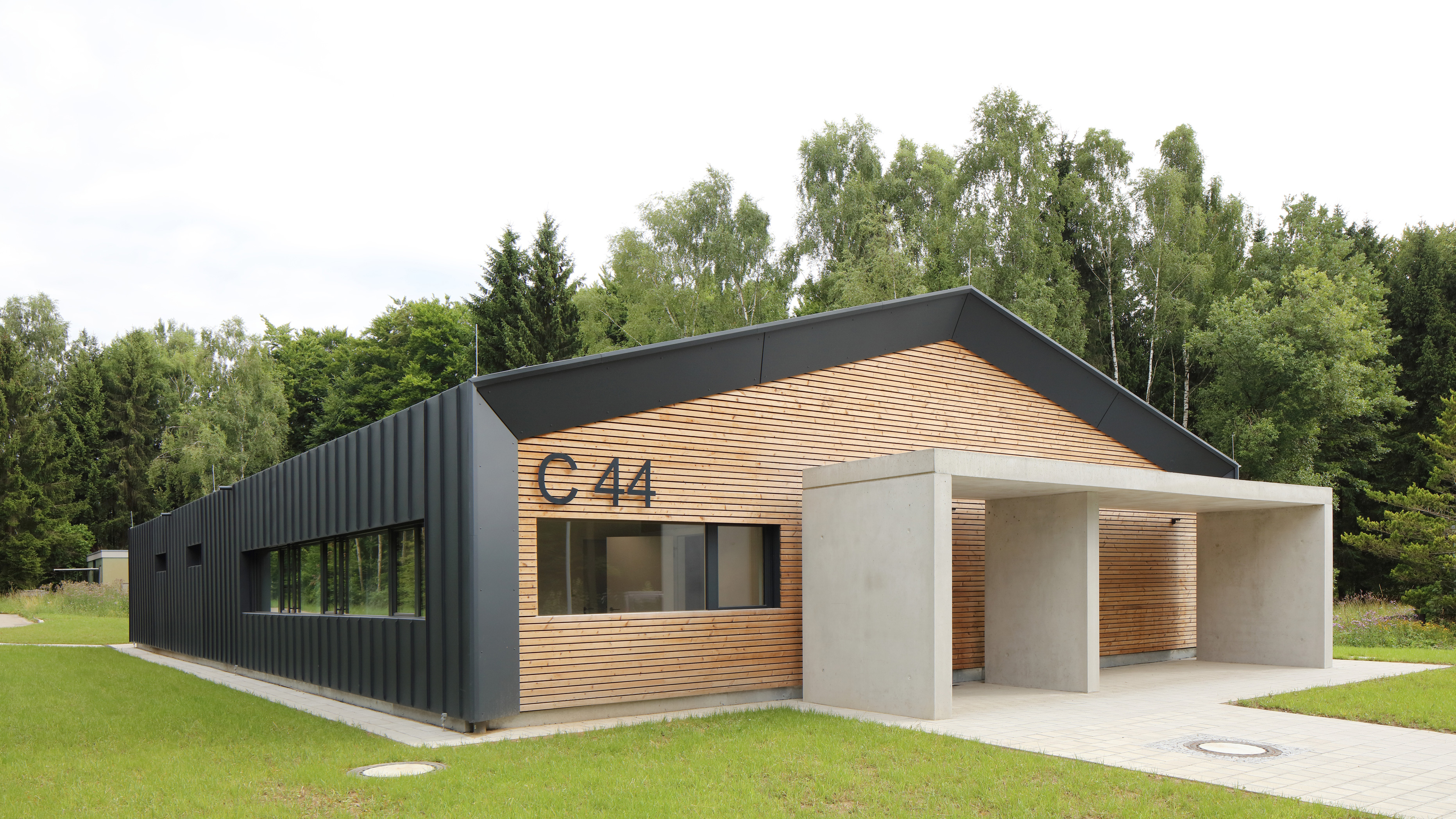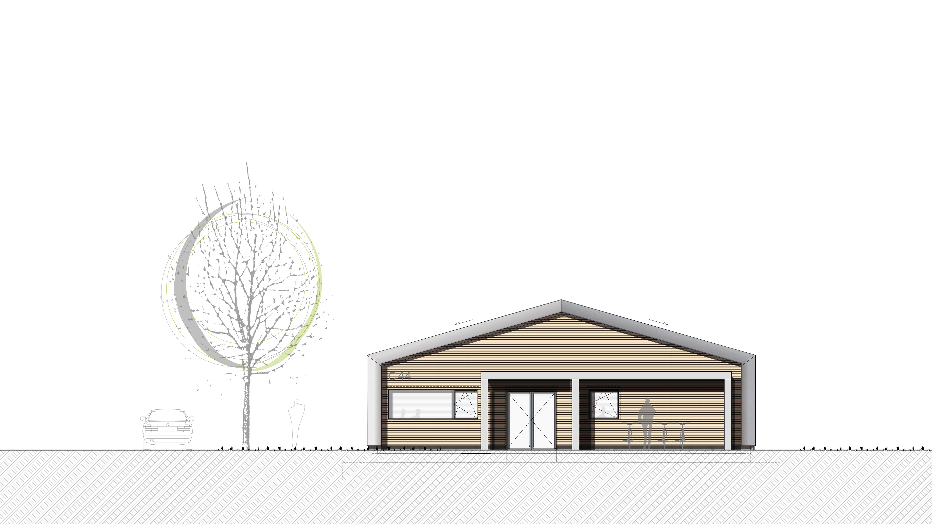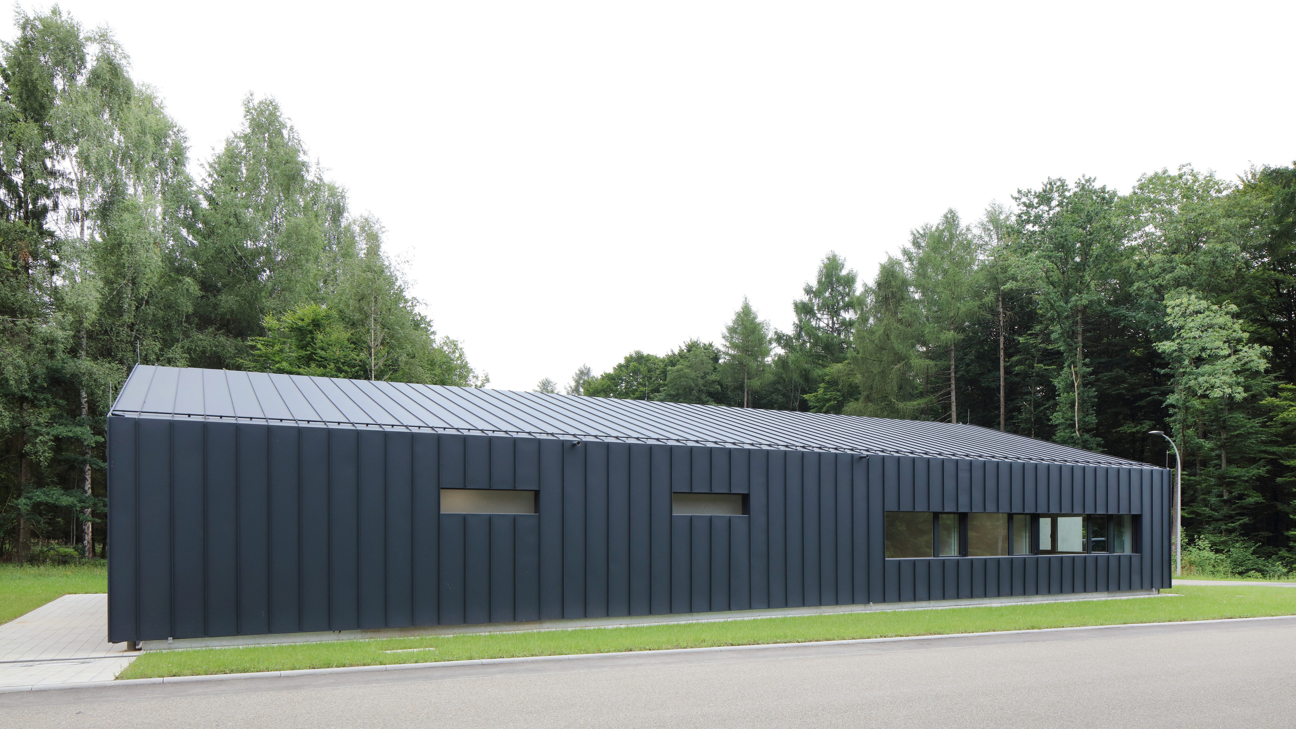 der neubau besteht aus einem nichtunterkellerten eingeschossigen baukörper mit satteldach. das gebäude besticht durch seine geradlinige form, ohne vor- und rücksprünge. einzig im eingangsbereich gibt es ein vordach, das sich formal vom hauptgebäude löst. traufseiten und dach erhalten eine hinterlüftete fassade aus aluminium-doppelstehfalz-blech, die sich wie ein „regenschirm“ über das haus stülpt. die giebelseiten werden mit einer witterungsbeständigen holzfassade verkleidet.