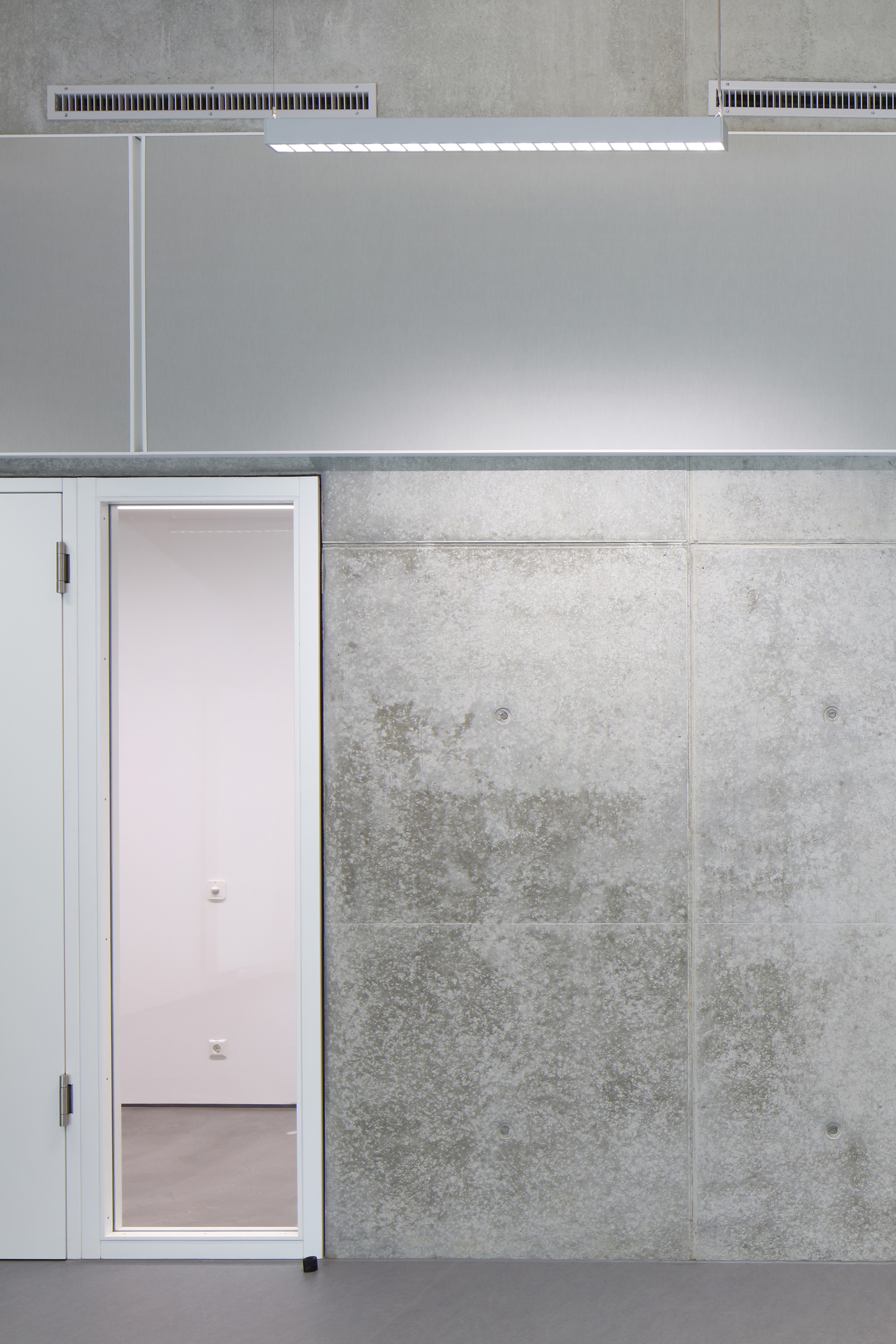 das gebäude ist als 2-spänner konzipiert. über einen durchgehenden flur werden alle räume erschlossen. die büros sind l-förmig um zentrale funktionsräume angeordnet, der aufenthalts-/besprechungsraum befindet sich in der mitte des gebäudes und öffnet sich mit einer großzügigen verglasung zur natur. im nördlichen teil des gebäudes befinden sich die lager und technikräume mit separaten zugängen von außen.
