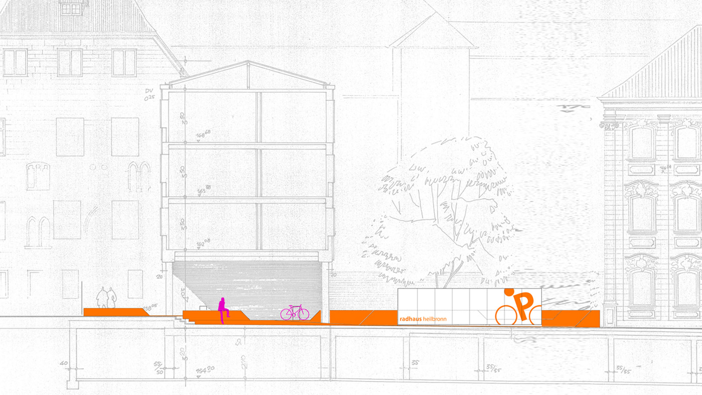 die lage der stadt heilbronn am neckarradweg lädt fahrradfahrer zu einem besuch der innenstadt ein. im zentral gelegenen historischen hof des rathauses entstehen 8 fahrradboxen, die ein einschließen der fahrräder samt gepäck ermöglichen. das sich im hof befindende „radhaus“ wird über eine rampenanlage mit sitzgelegenheiten an den vorgelagerten marktplatz angeschlossen. die anlage schafft zusätzlich zur parkmöglichkeit von fahrrädern identität, attraktivität und belebt den ort. durch die verwendung transluzenter materialien bei der konstruktion der fahrradgarage wird vandalismus vorgebeugt.