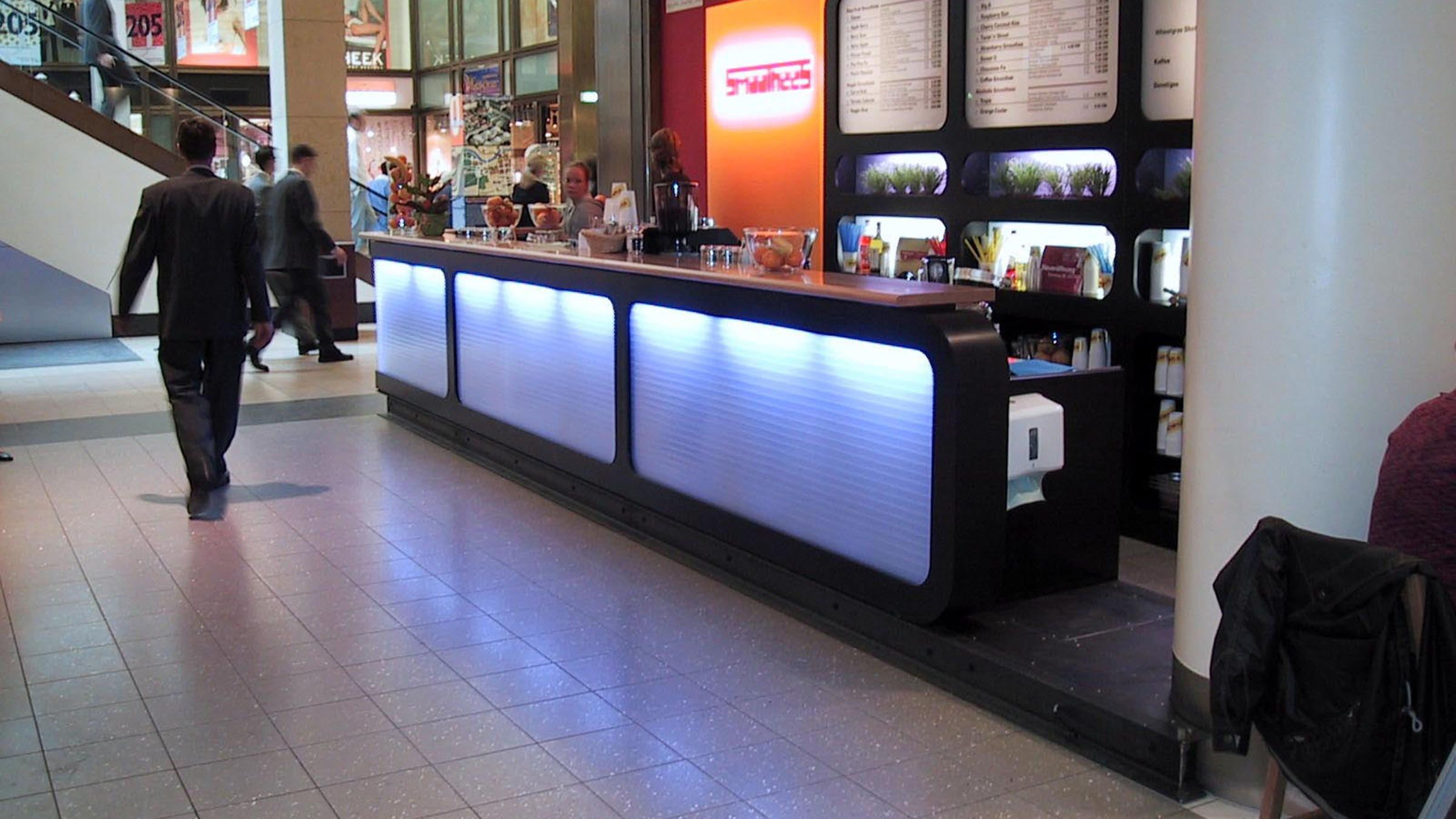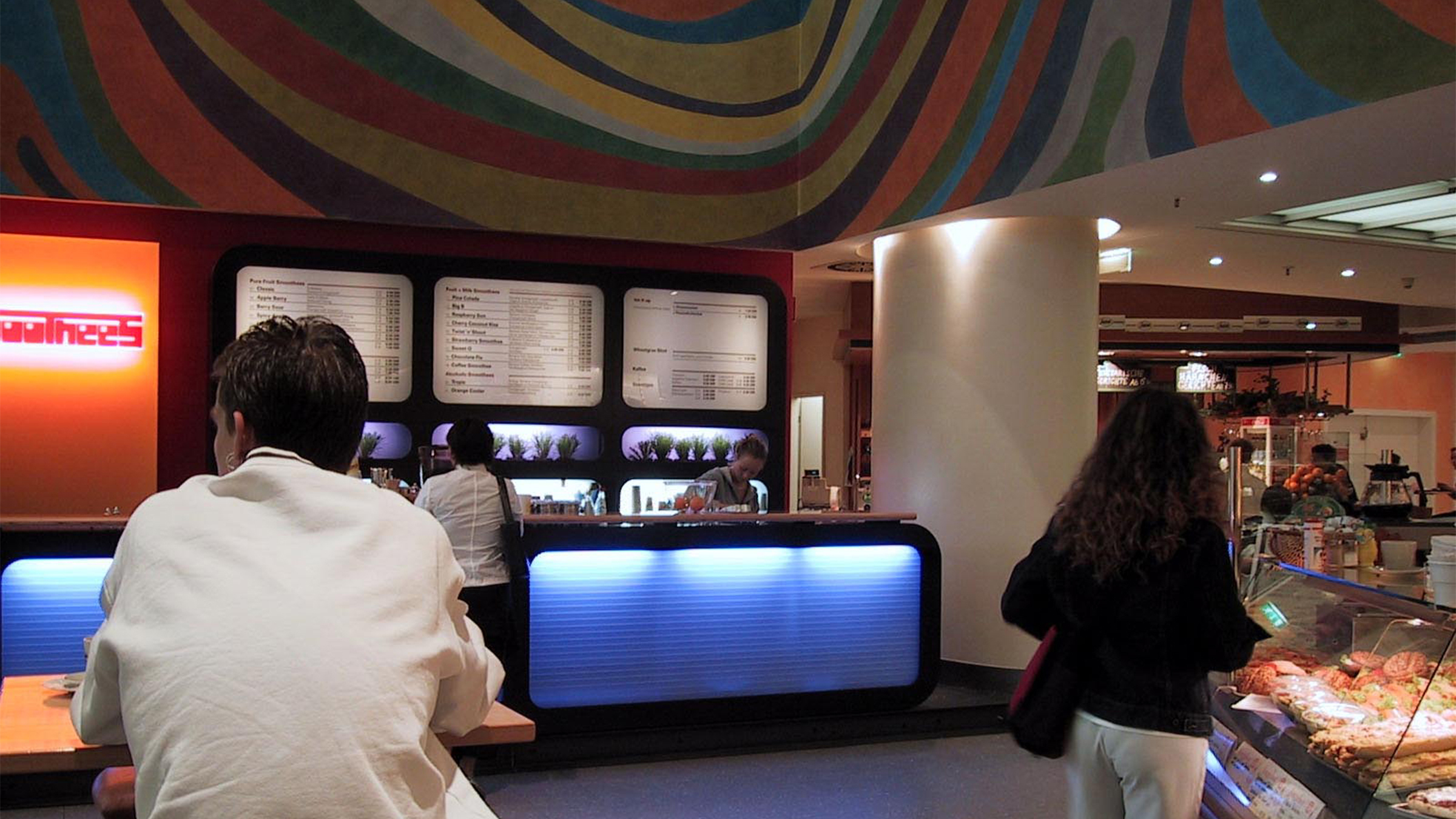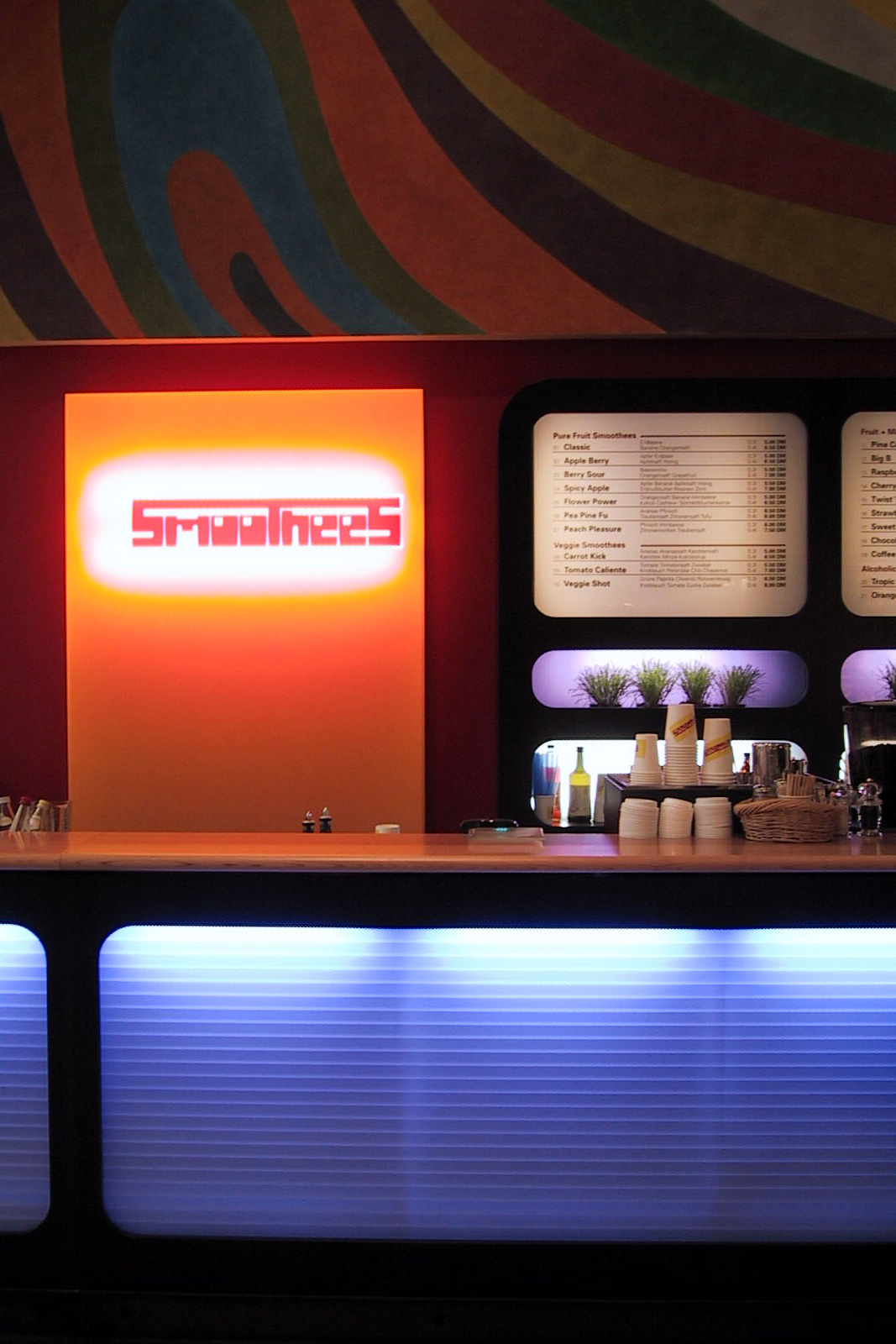 als auftakt und erster baustein der geplanten kette entstand im quartier 205 in der berliner friedrichstrasse eine saftbar mit innovativem angebot an frisch zubereiteten frucht- und gemüsegetränken. an zentraler stelle in der unterirdischen shopping zone wurde das wandgemälde von sol lewitt sowohl graphisch wie auch gestalterisch in die konzeption der bar eingebunden. das leistungsbild umfasste die baurechtlichen abstimmungen, die umsetzung vor ort, sowie die entwicklung von formalen und graphischen leitdetails, die an den unterschiedlichsten orten reproduzierbar sind.