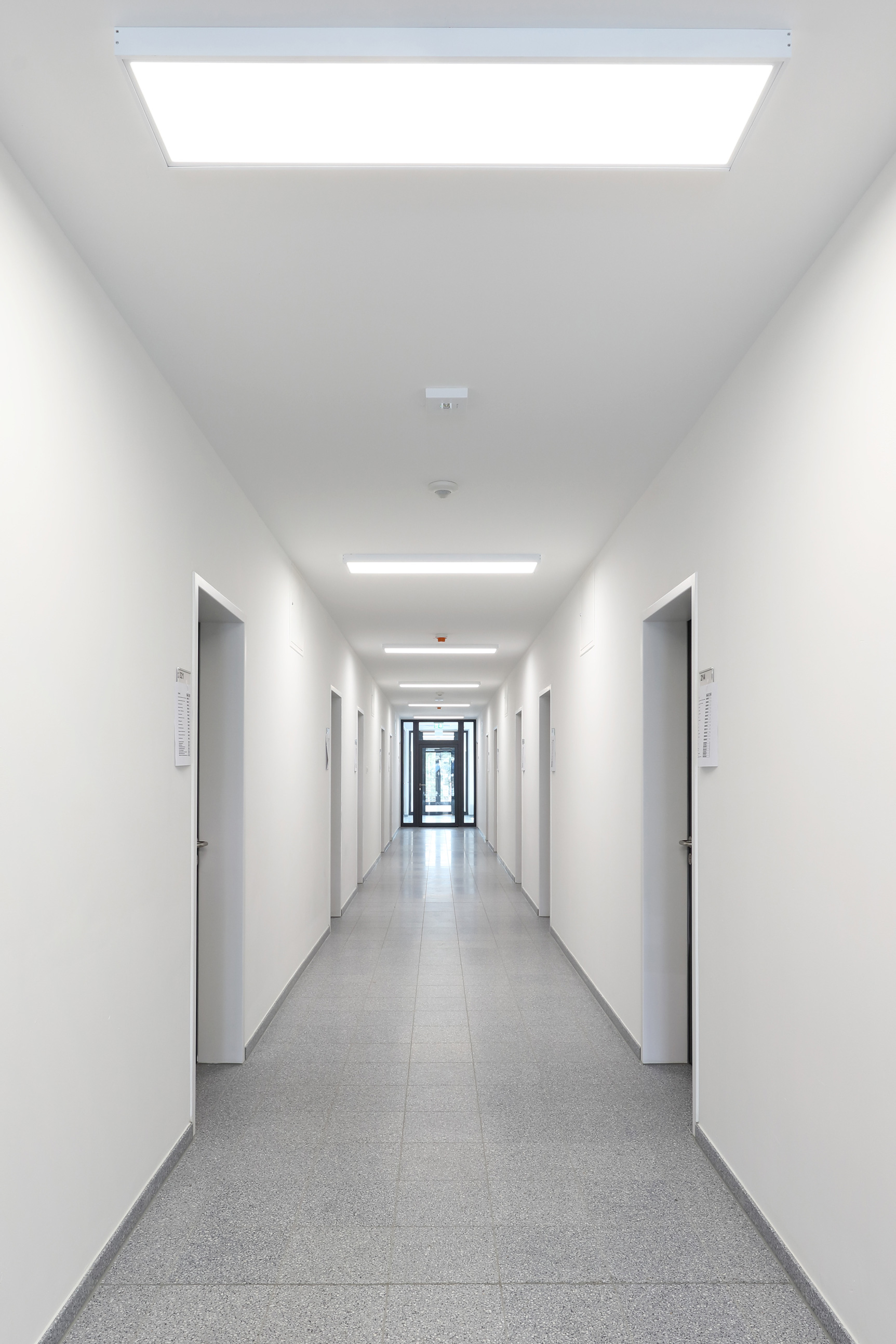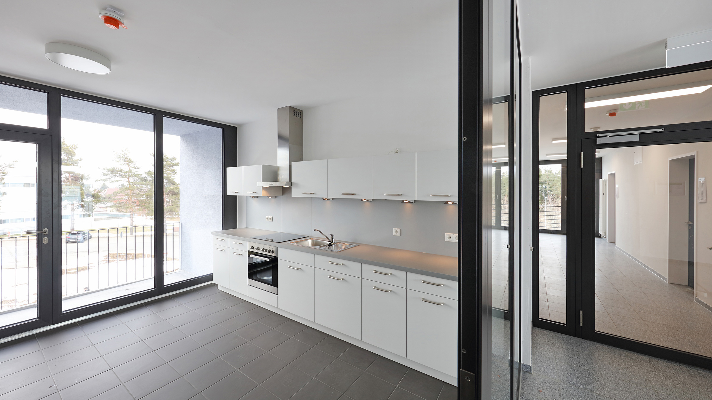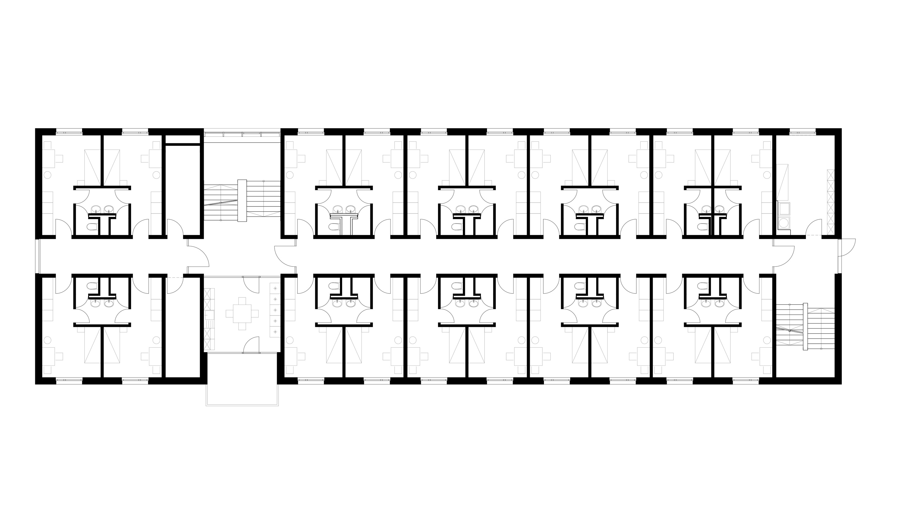 die beiden 3-geschossigen gebäude beinhalten insgesamt 122 zimmer die als 2-spänner erschlossen werden. im gebäude s1 befinden sich sicherheitsräume, die besonderer baulicher behandlung bedurften.