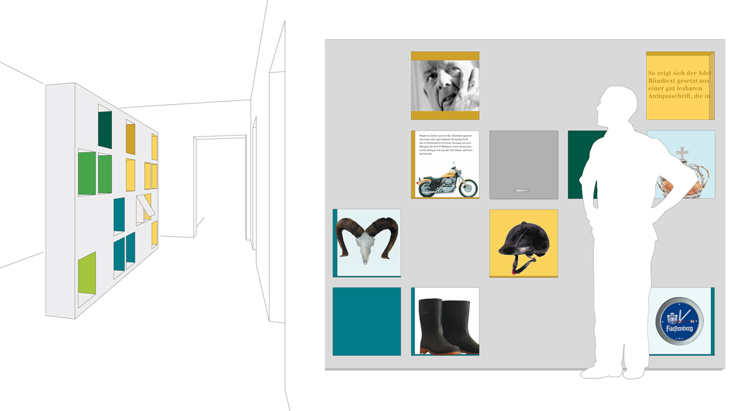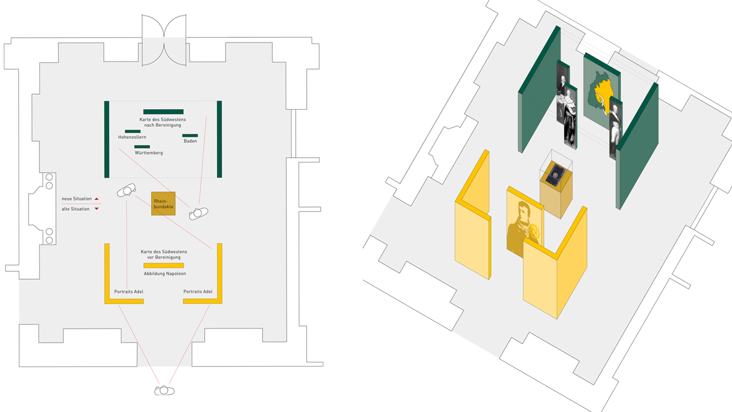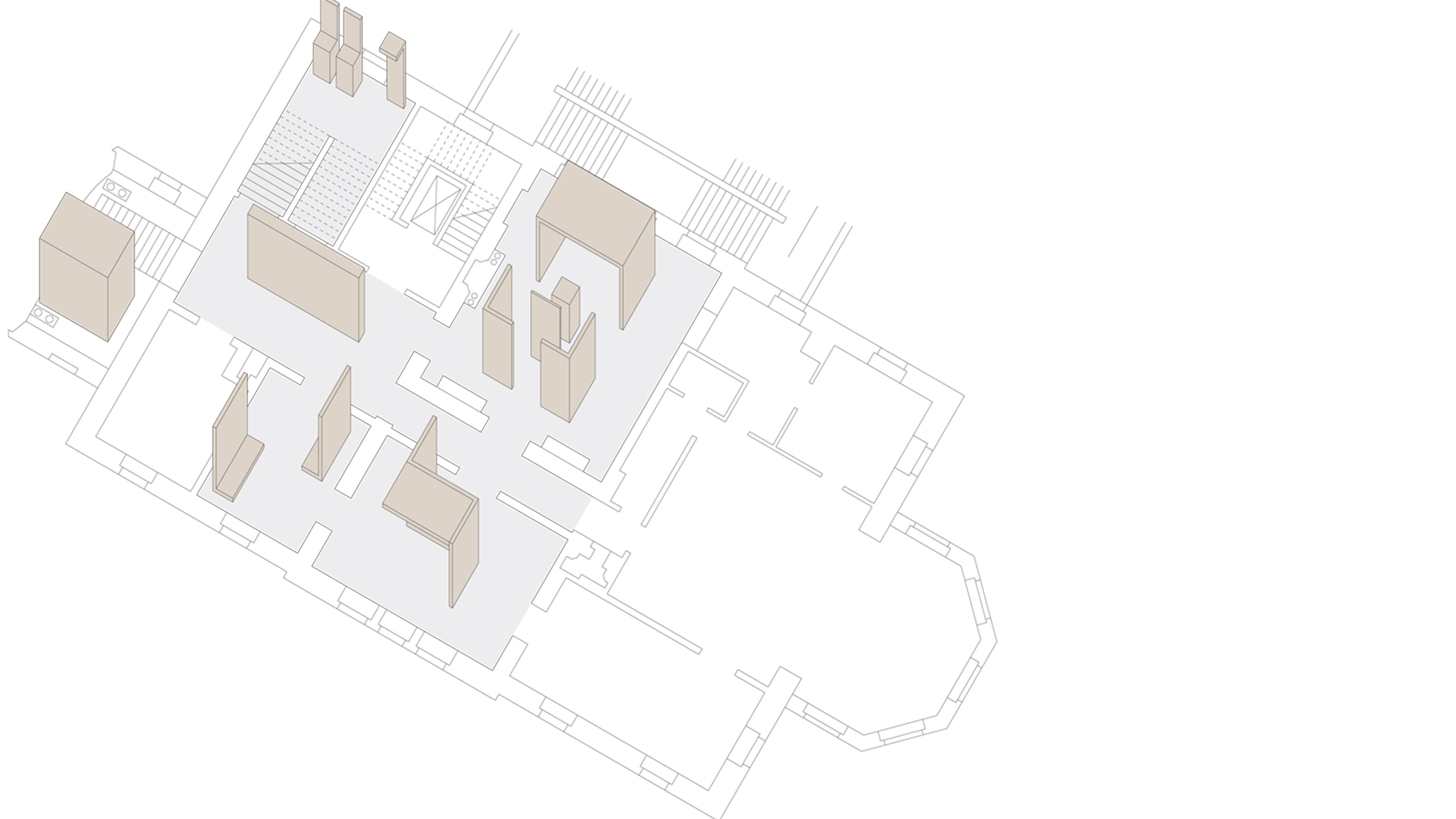 die ausstellungsarchitektur bezieht das gebäude als exponat in die präsentation mit ein. gleichzeitig hält es distanz zum historischen formenreichtum der bestehenden innenarchitektur. zudem bildet die ausstellungsarchitektur durch den einsatz ruhiger und farbiger flächen einen belebenden gegenpol zu den detailreichen oberflächen der räume und verstellt dabei nicht den blick auf diese.