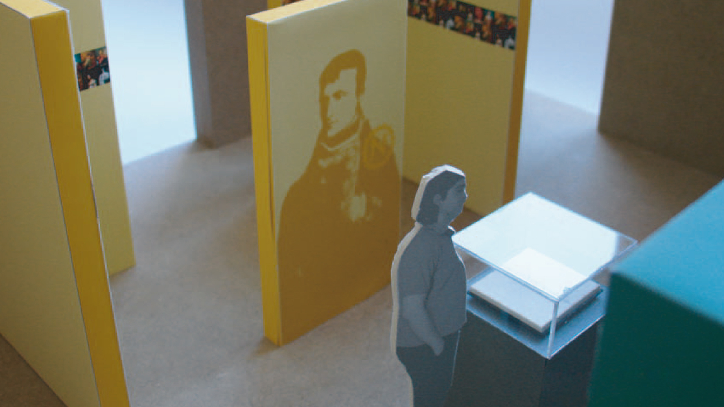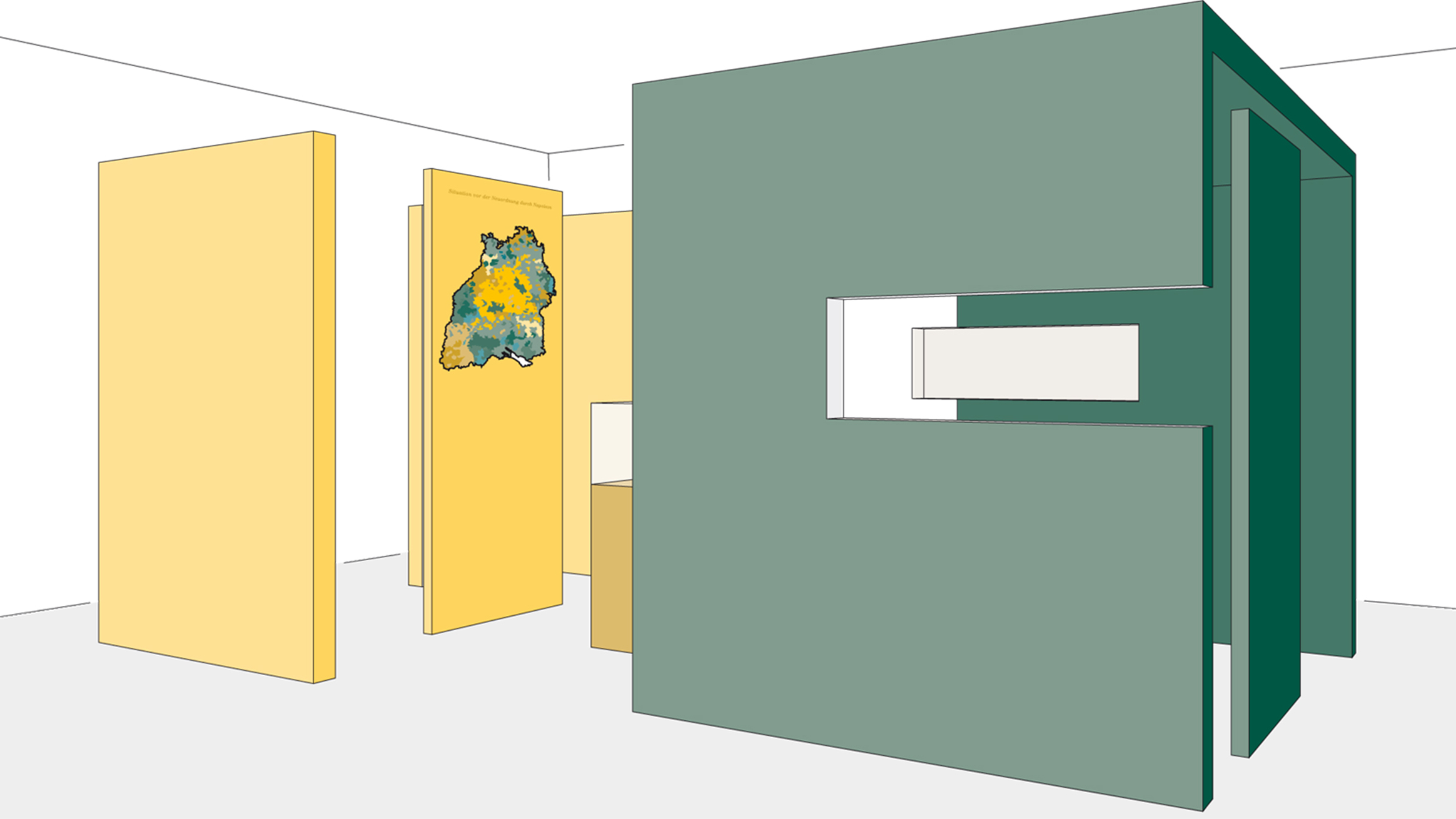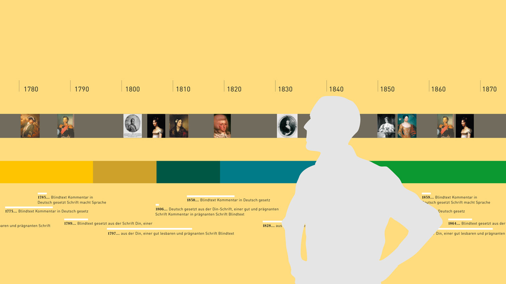 die ausstellungsarchitektur bezieht das gebäude als exponat in die präsentation mit ein. gleichzeitig hält es distanz zum historischen formenreichtum der bestehenden innenarchitektur. zudem bildet die ausstellungsarchitektur durch den einsatz ruhiger und farbiger flächen einen belebenden gegenpol zu den detailreichen oberflächen der räume und verstellt dabei nicht den blick auf diese.