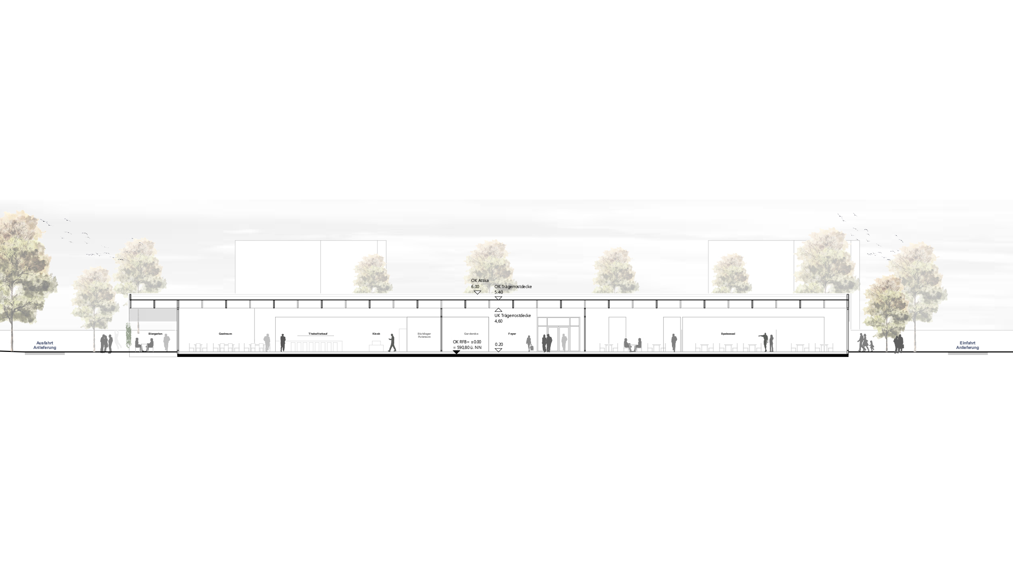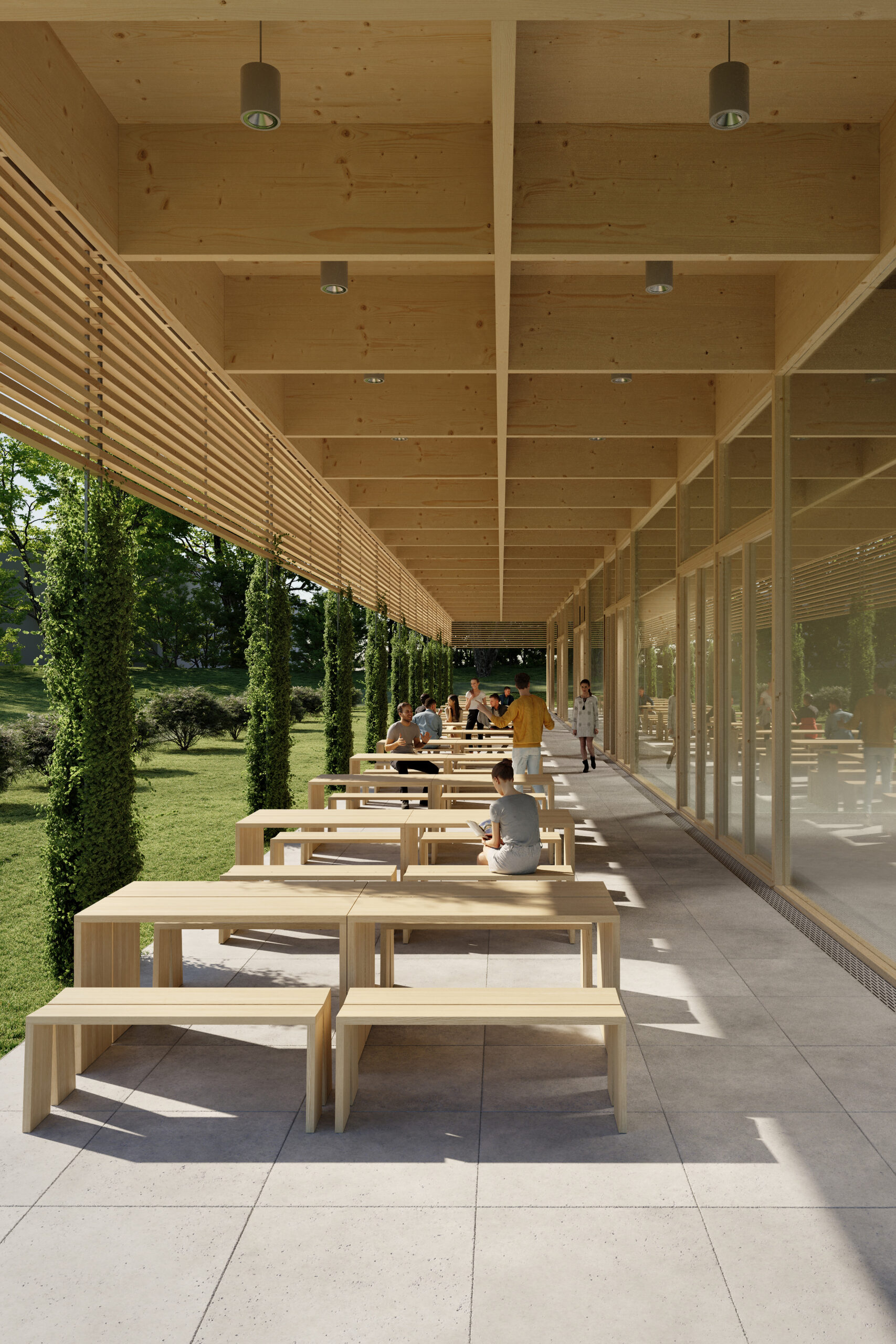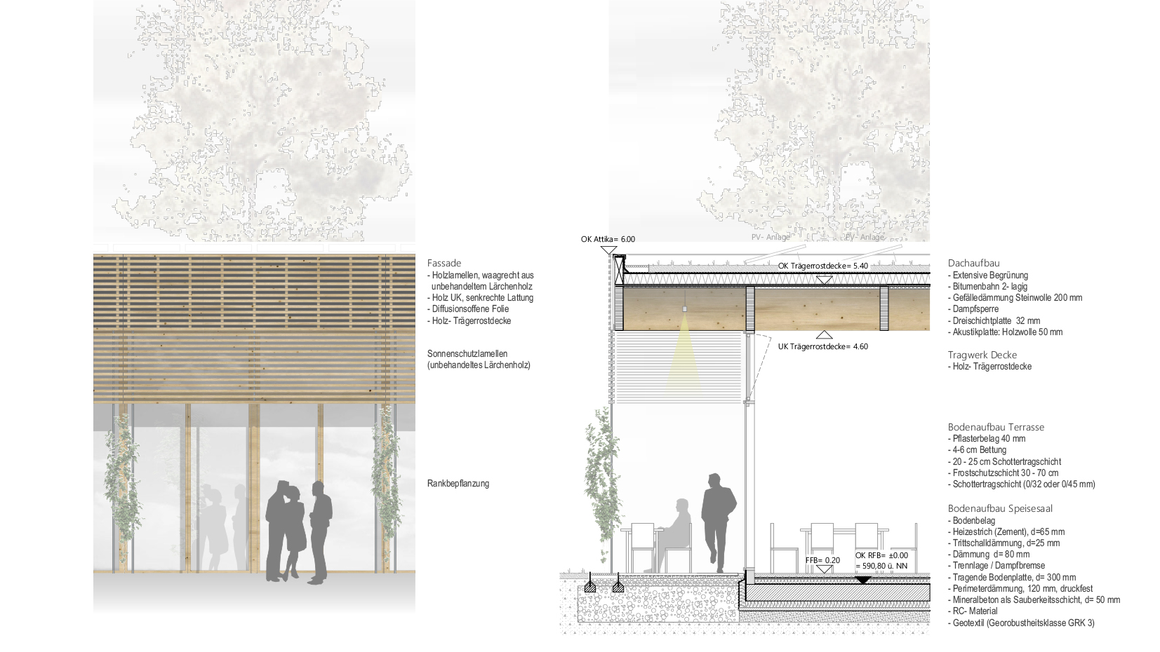 der baukörper mit knapp 6 metern höhe ist bestimmt durch sein holztragwerk und überspannt mit einem durchgängigen trägerrost die stützenfreien aufenthaltsräume. die großflächigen glasfassaden öffnen sich einladend nach süden und westen.