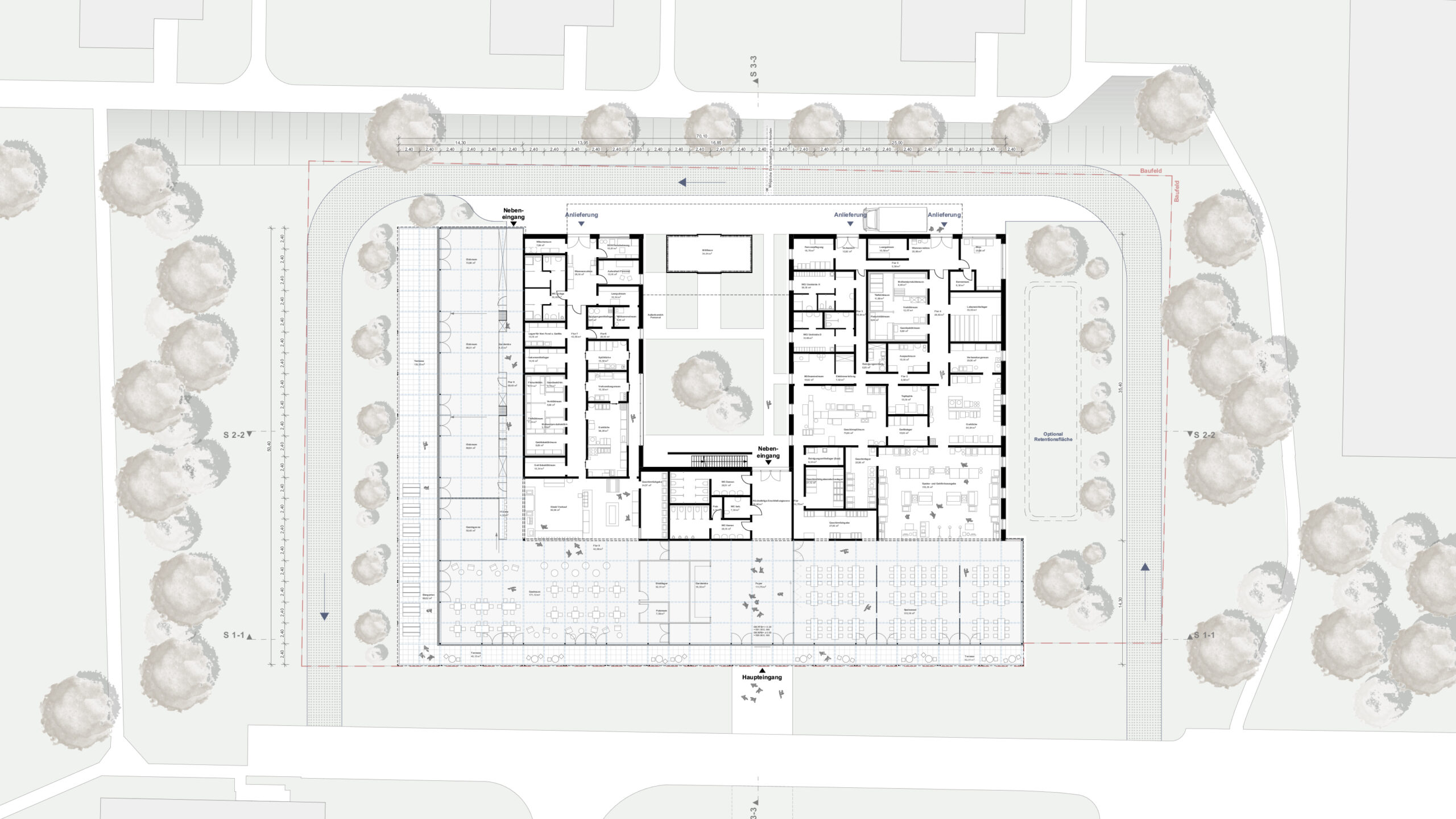 die übergeordneten nutzungen werden in einem gebäudeteil in l-form zusammengefasst.
