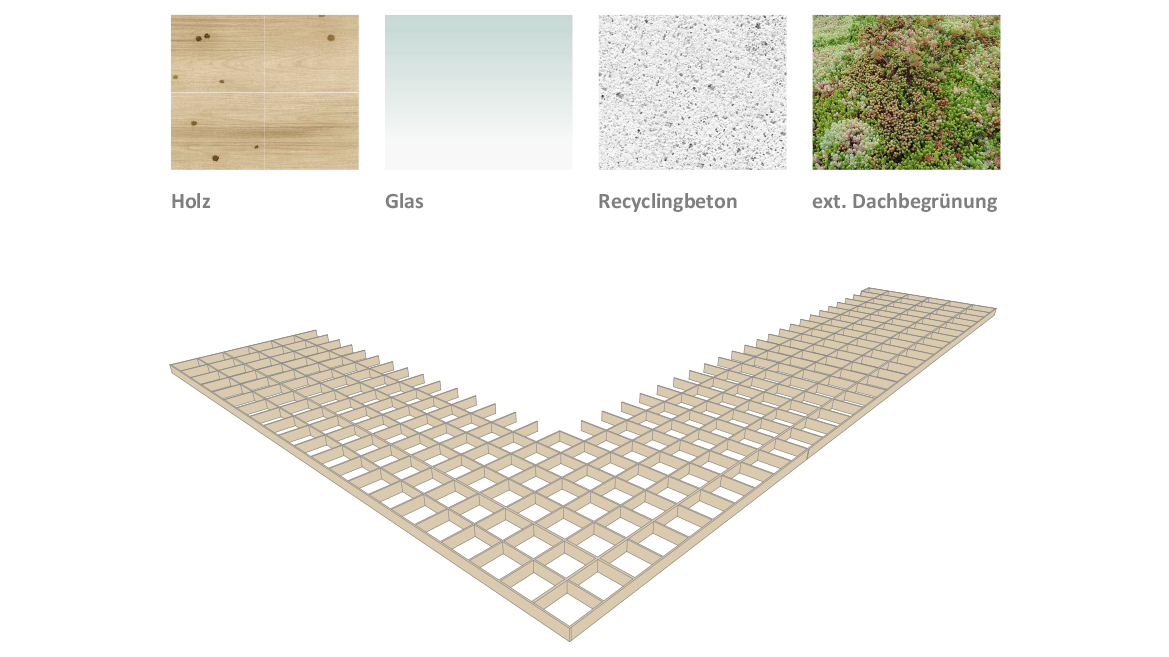 der massive baukörper soll aus recyclingbeton mit außenliegender dämmung bestehen. um die wertigkeit und eigenschaft des betons auch nach außen sichtbar zu machen, sollen vorgehängte recycling-beton fertigteile das architektonische bild vervollständigen.