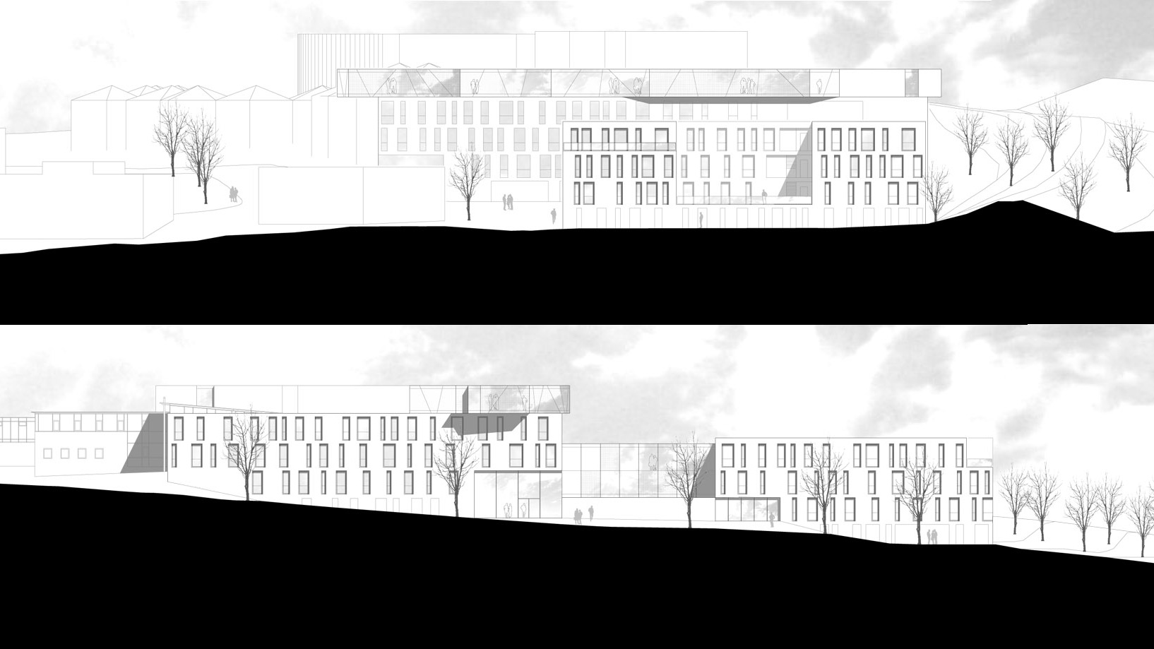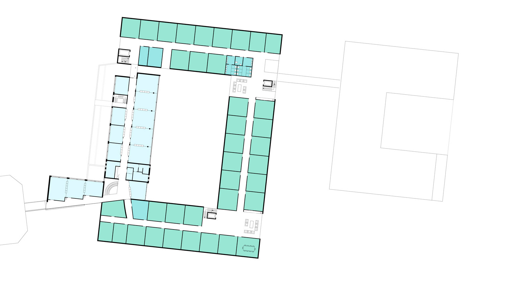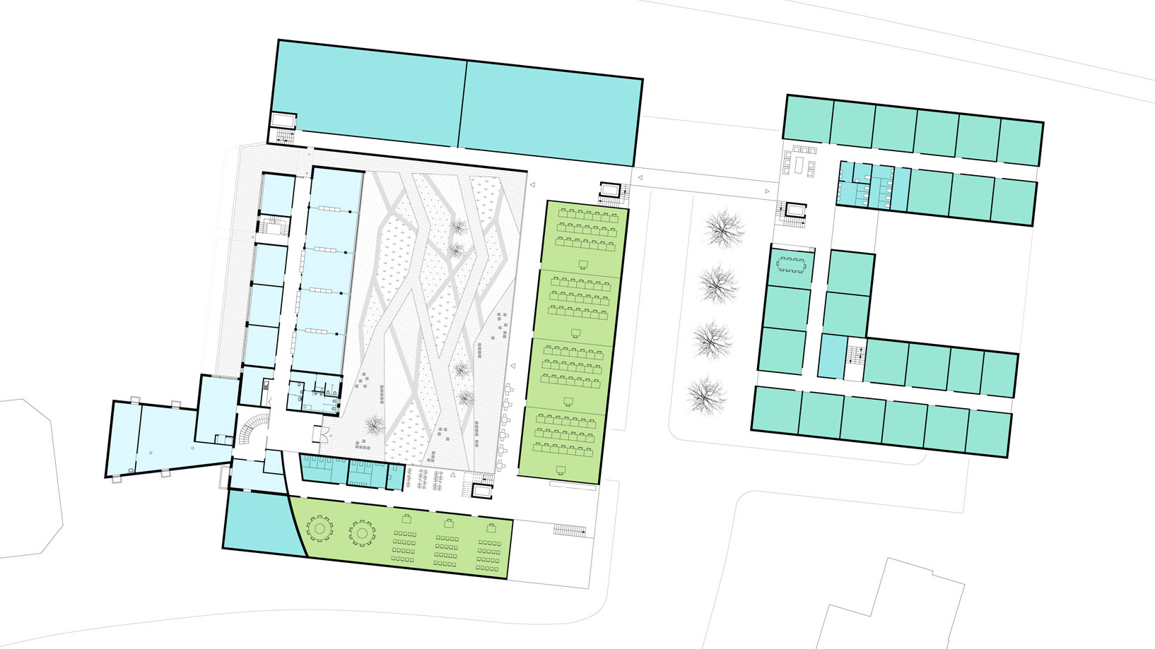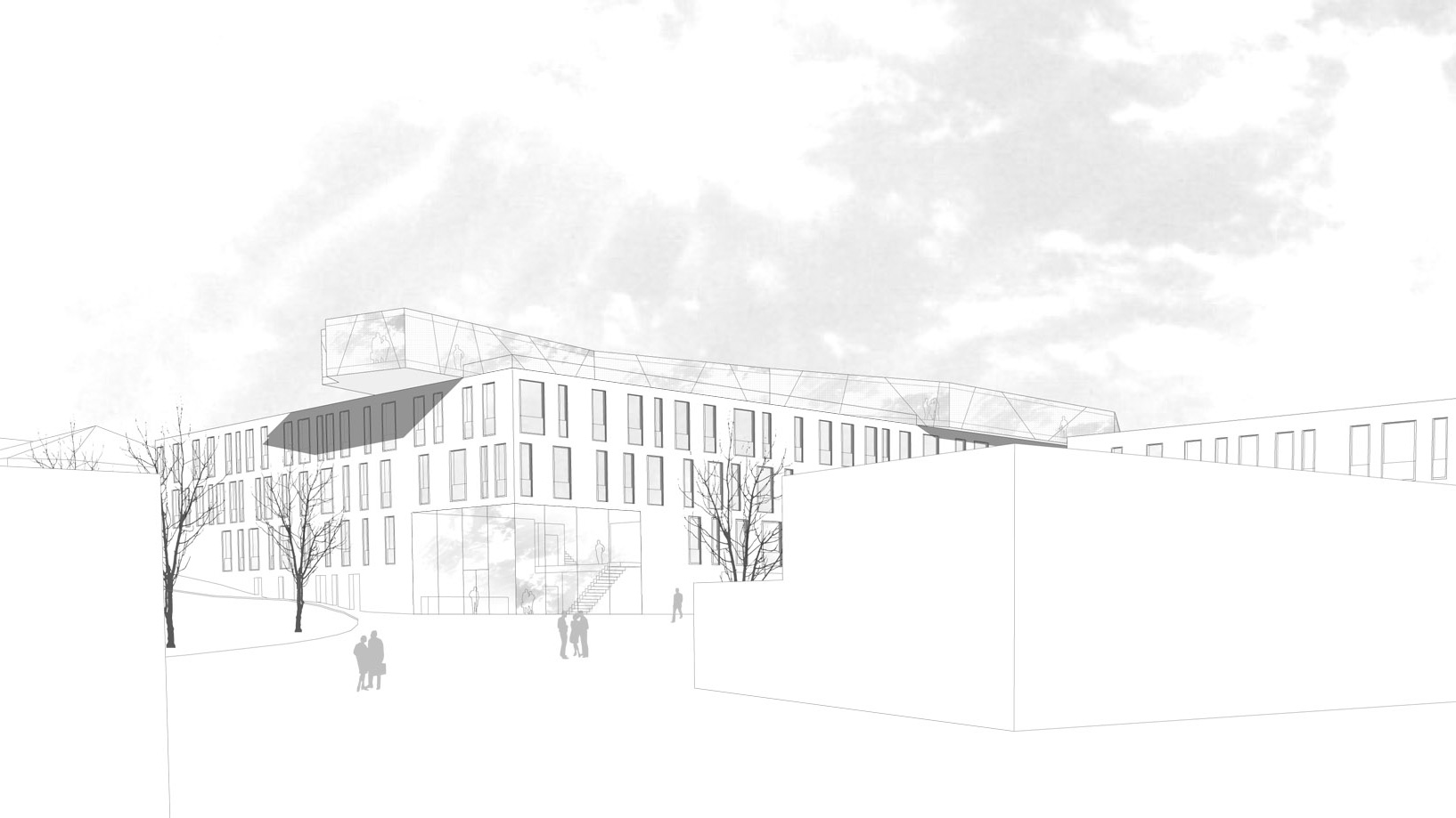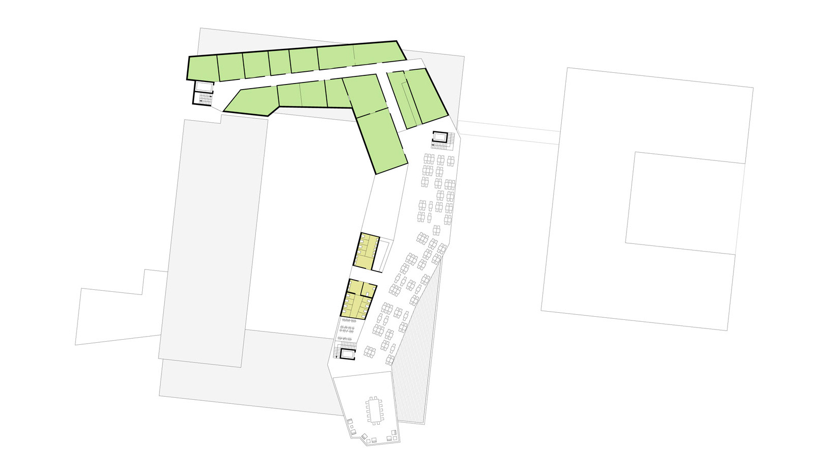 leitmotiv des entwurfs ist die verbindung von natur und technik. die innenhofgestaltung greift dieses thema bildlich auf. der kräutergarten stellt abstrakt die symbiose von natur und technik dar. die natur in form der pflanzbeete wird durch die an leiterbahnen erinnernden verbindungswege gerahmt. die freiform des sich auf dem dach befindenden restaurants nimmt das motiv der leiterbahn wieder auf.