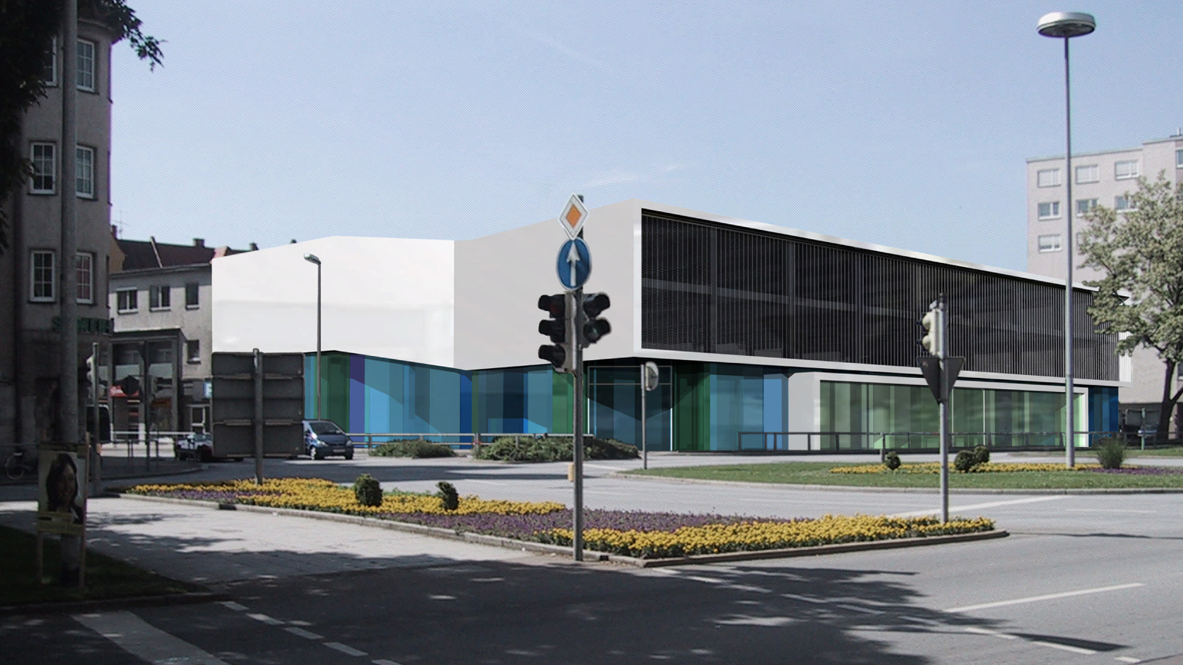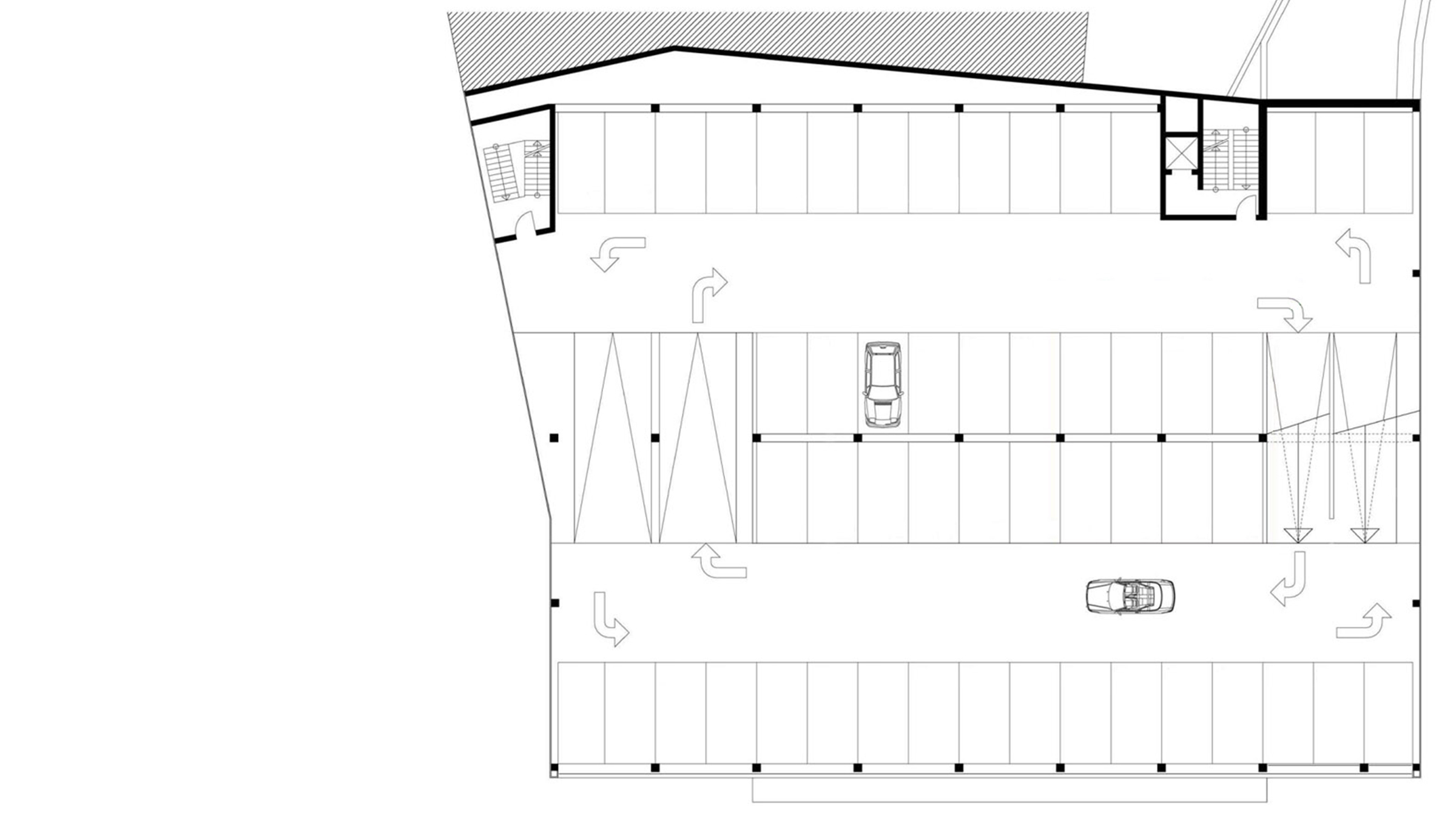 das vollverglaste sockelgeschoss trägt den skulpturalen baukörper der parkdecks. um einblicke nur dort zuzulassen, wo dies gewünscht ist, ist die verglasung transparent und teilweise mattiert geplant und eignet sich als informations- und werbemedium. der in die glasfassade eingestellte baukörper markiert den platzseitigen zugang. der erhöhte parkhauskörper ist an ost- und westseite mit geschlossenen aluminiumpaneelen verkleidet. die nordfassade, das gesicht zur stadt, besteht aus mattiertem glas und ist mit edelstahlgewebe verkleidet.