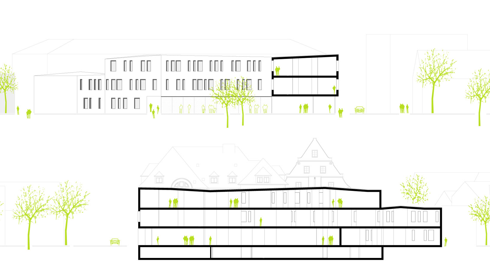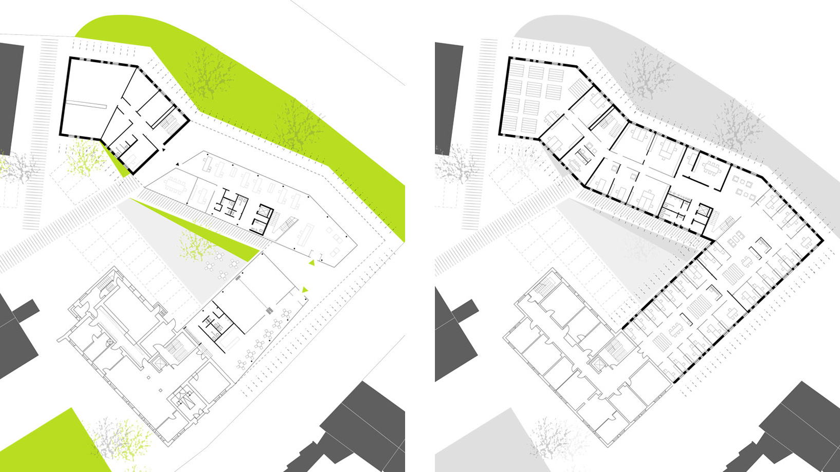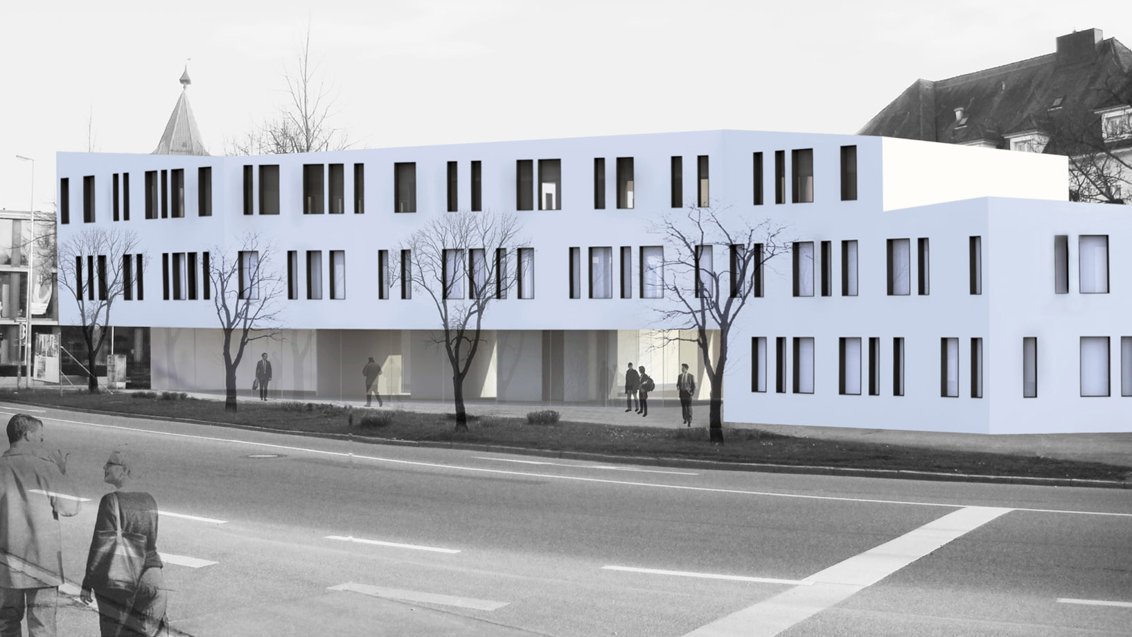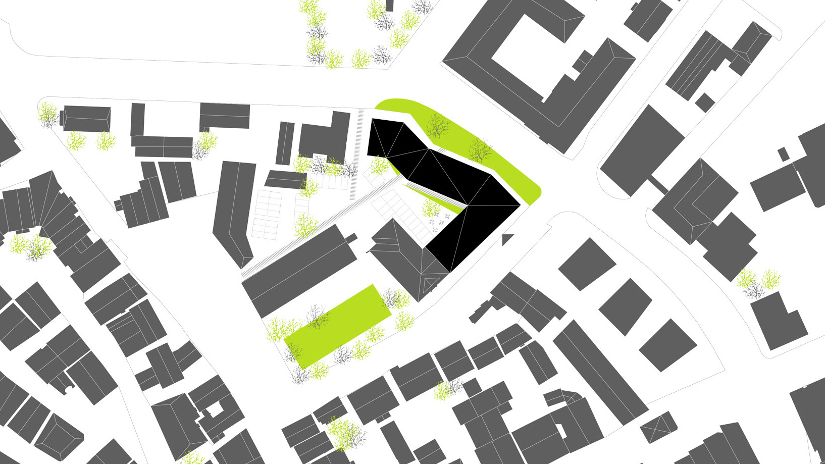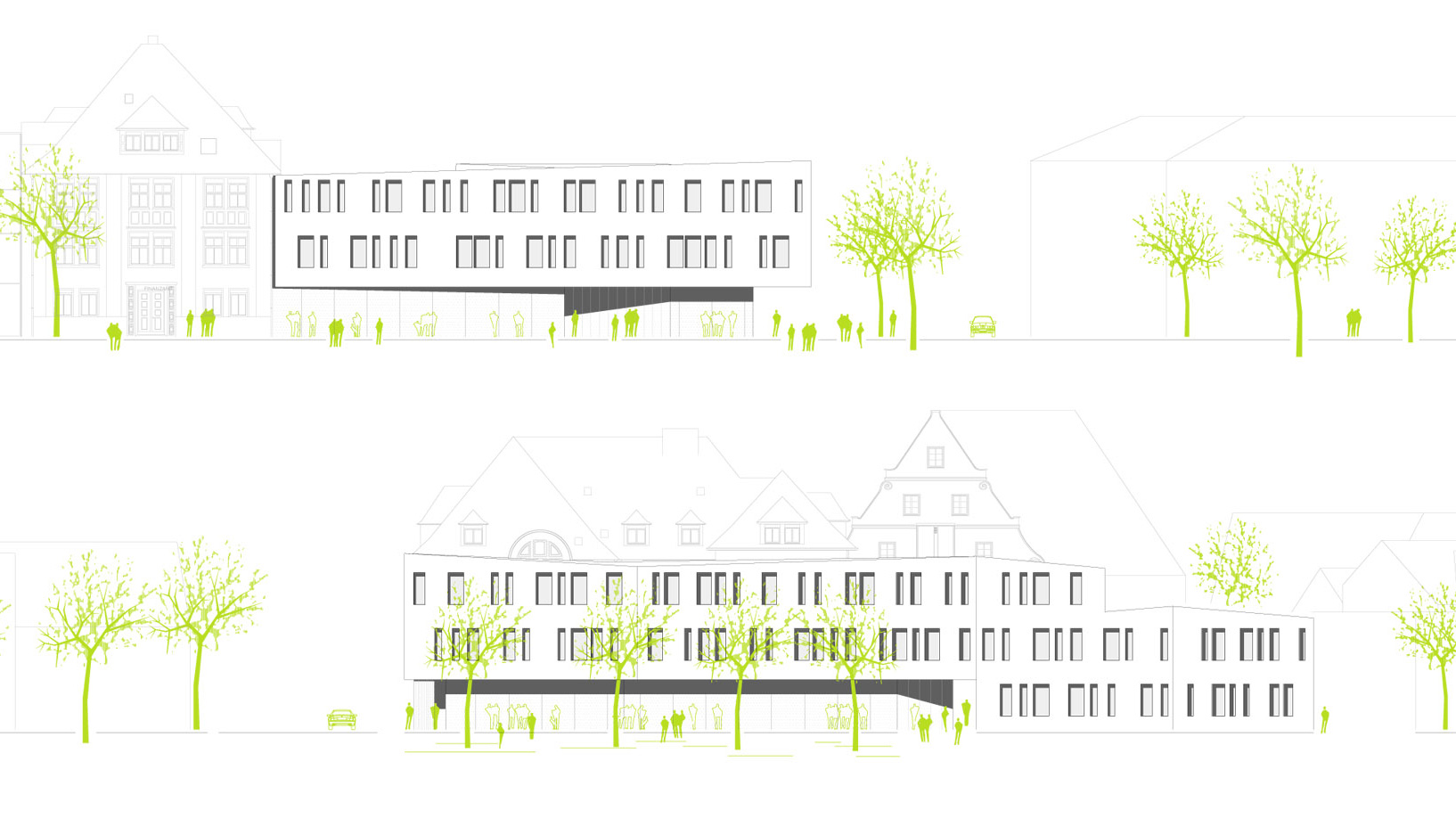 das baufeld liegt im bereich der ehemaligen stadtmauer. die leitidee des entwurfs ist die die vermittlung zwischen der dicht bebauten altstadt und der lockeren bebauung der stadtergänzung sowie die ergänzung der bestehenden bauten des baufeldes zu einem quartierprägenden ensemble. der neubau ist horizontal in zwei zonen gegliedert. die strukturierung der erdgeschosszone in einzelne baukörper ist für die verschiedenen fußgängerströme durchlässig und vermittelt gleichzeitig zwischen neubau und der angrenzenden, villenartigen bebauung. die dynamische dachform hat eine vermittelnde funktion zwischen altstadt und stadtergänzung und ist eine moderne interpretation der historischen satteldachformen der altstadt.