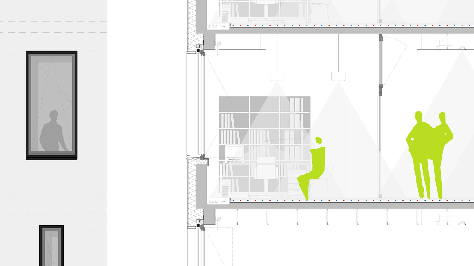 die offene erdgeschosszone nimmt die öffentlichen und repräsentativen nutzungen auf. durch ihre offene struktur und die komplett verglaste fassade schafft sie übergänge zwischen innen- und außenraum. die obergeschosszone ist als kontrast dazu als geschlossener baukörper mit einer verputzten lochfassade mit stahlfensterrahmen ausgebildet. auch im innenbereich werden die materialien in bürobereichen und kombizonen sehr reduziert eingesetzt. es gibt drei vertikale haupterschließungen, die alle abteilungen auf kurzen wegen erschließen. die verkehrsflächen werden somit reduziert die offenheit und transparenz der repräsentativen bereiche im bürokonzept weiterverfolgt. großzügige meetingflächen sowie rückzugs- und ruhebereiche formen aufweitungen an zentralen stellen aus und bilden einschnitte in der strengen, aber flexibel und variabel einteilbaren zellenbürostruktur. die kombizone nimmt alle büroneben-, temporäre arbeits- und aktenablageflächen auf.