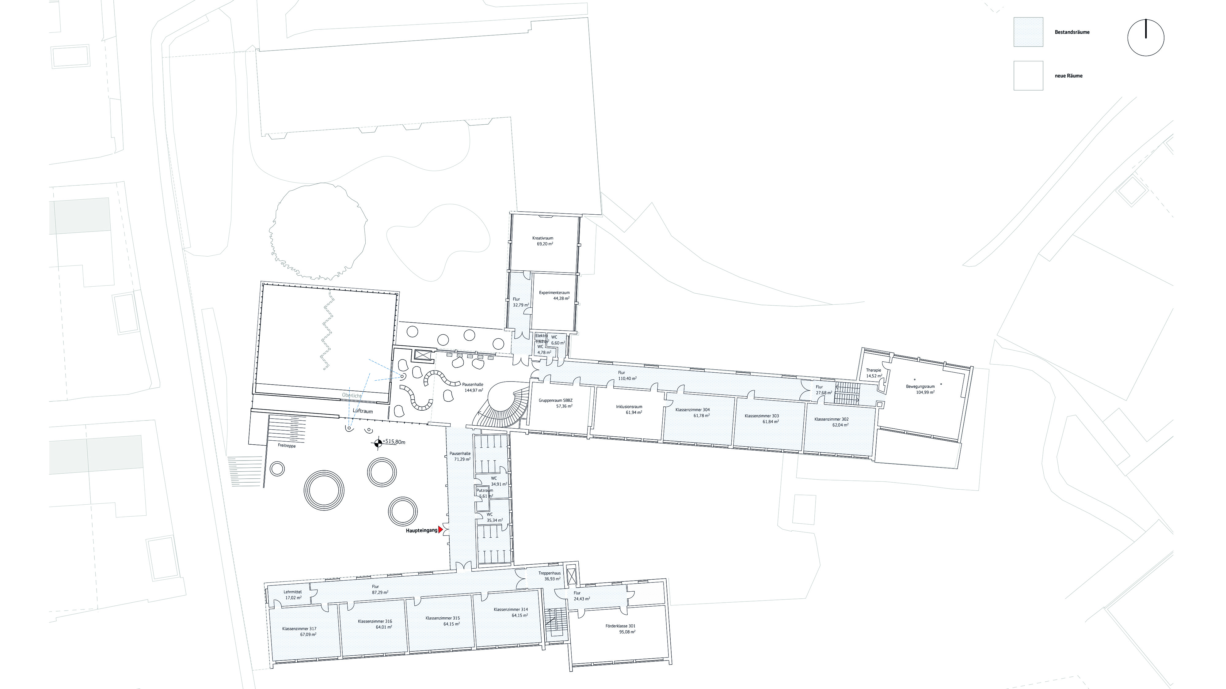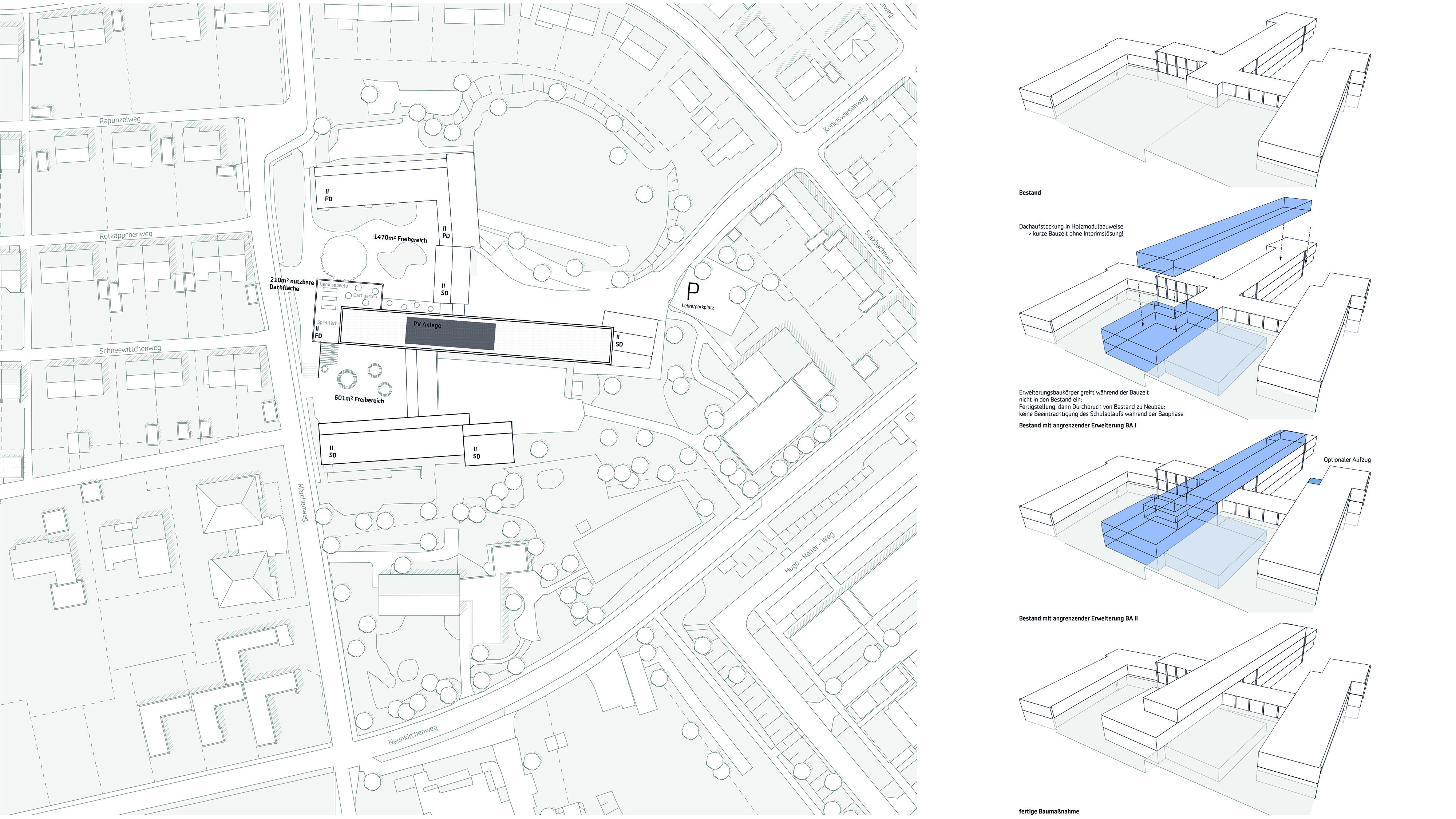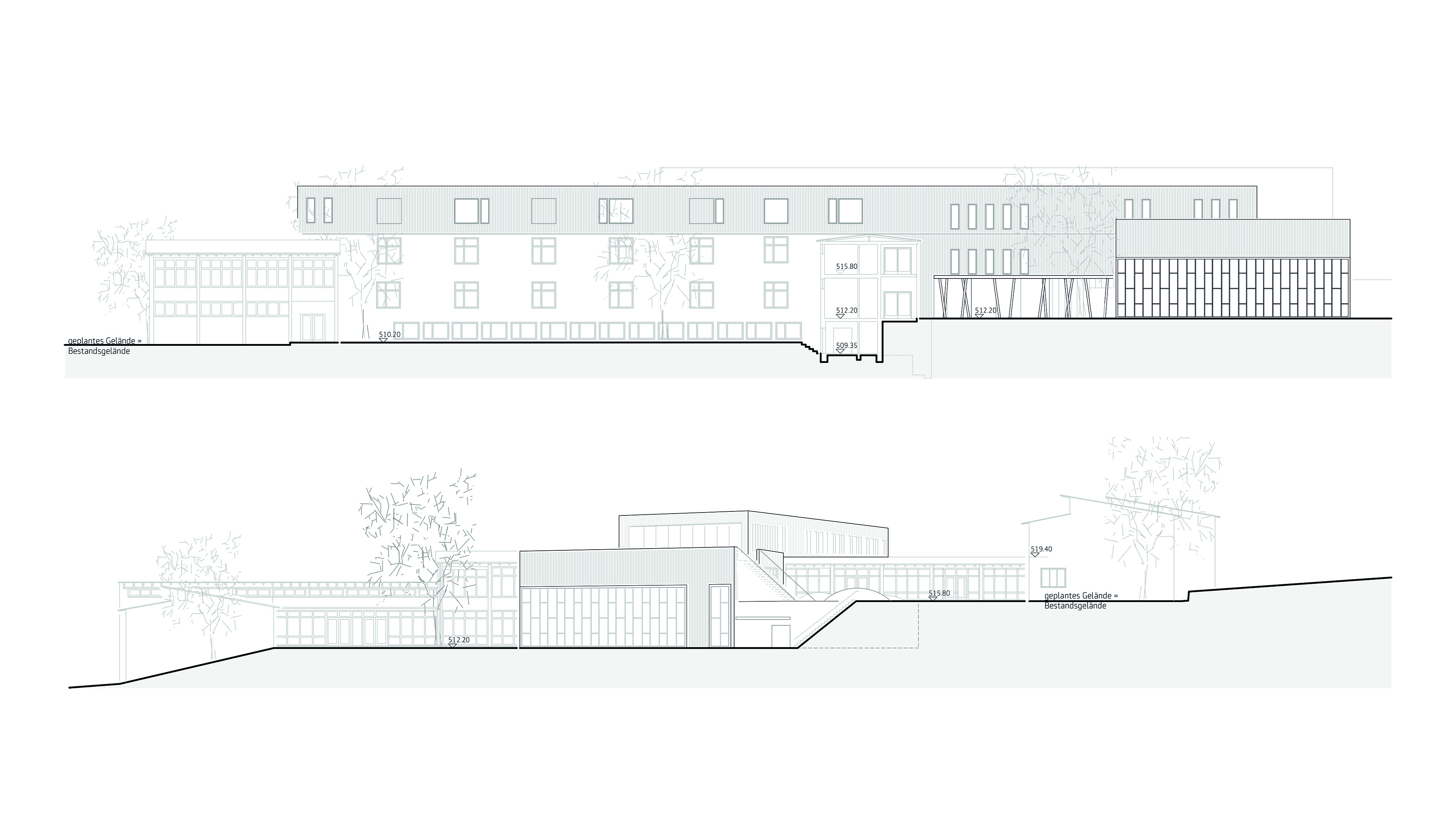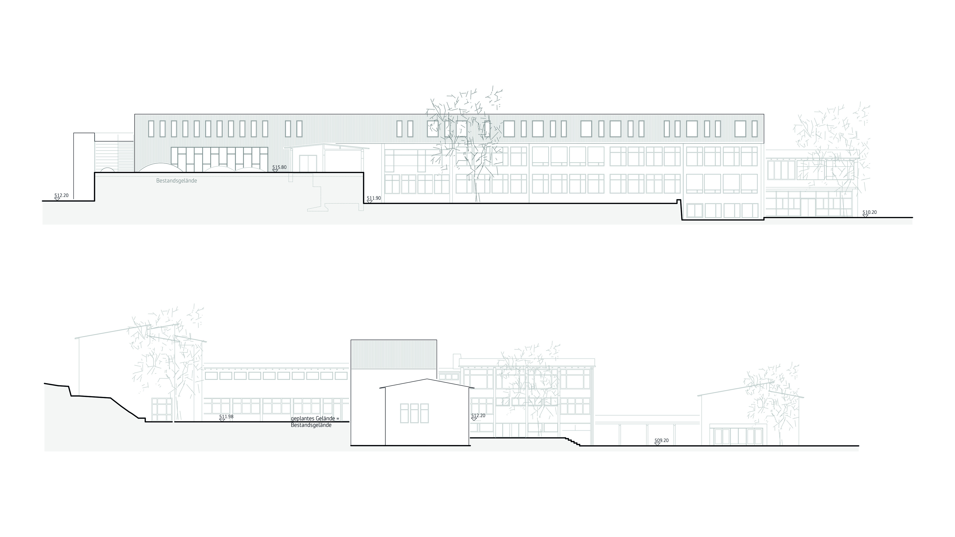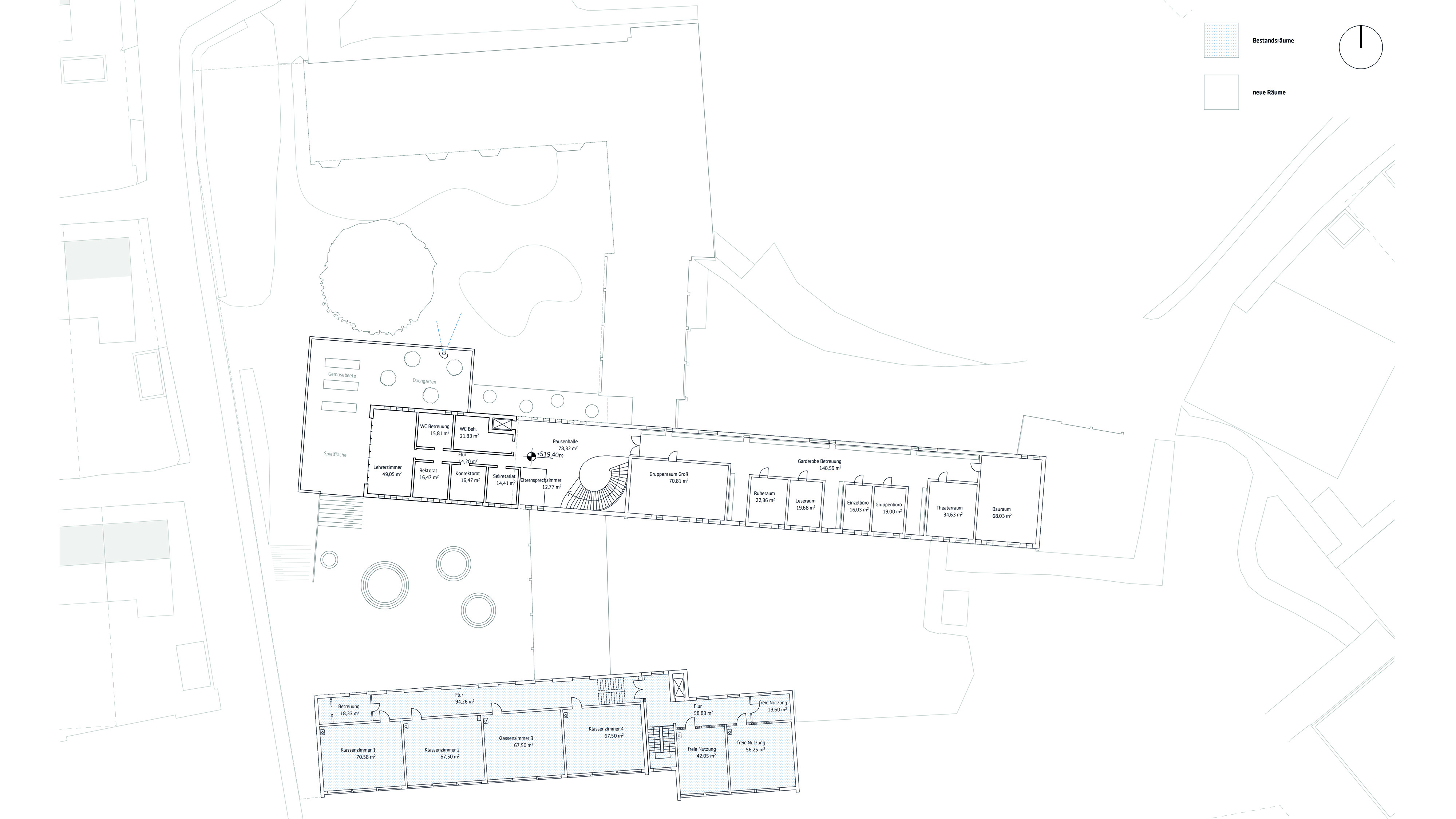 verknüpfung von unterschiedlichen höhenniveaus der freianlagen -> große zusammenhängende pausenhöfe
