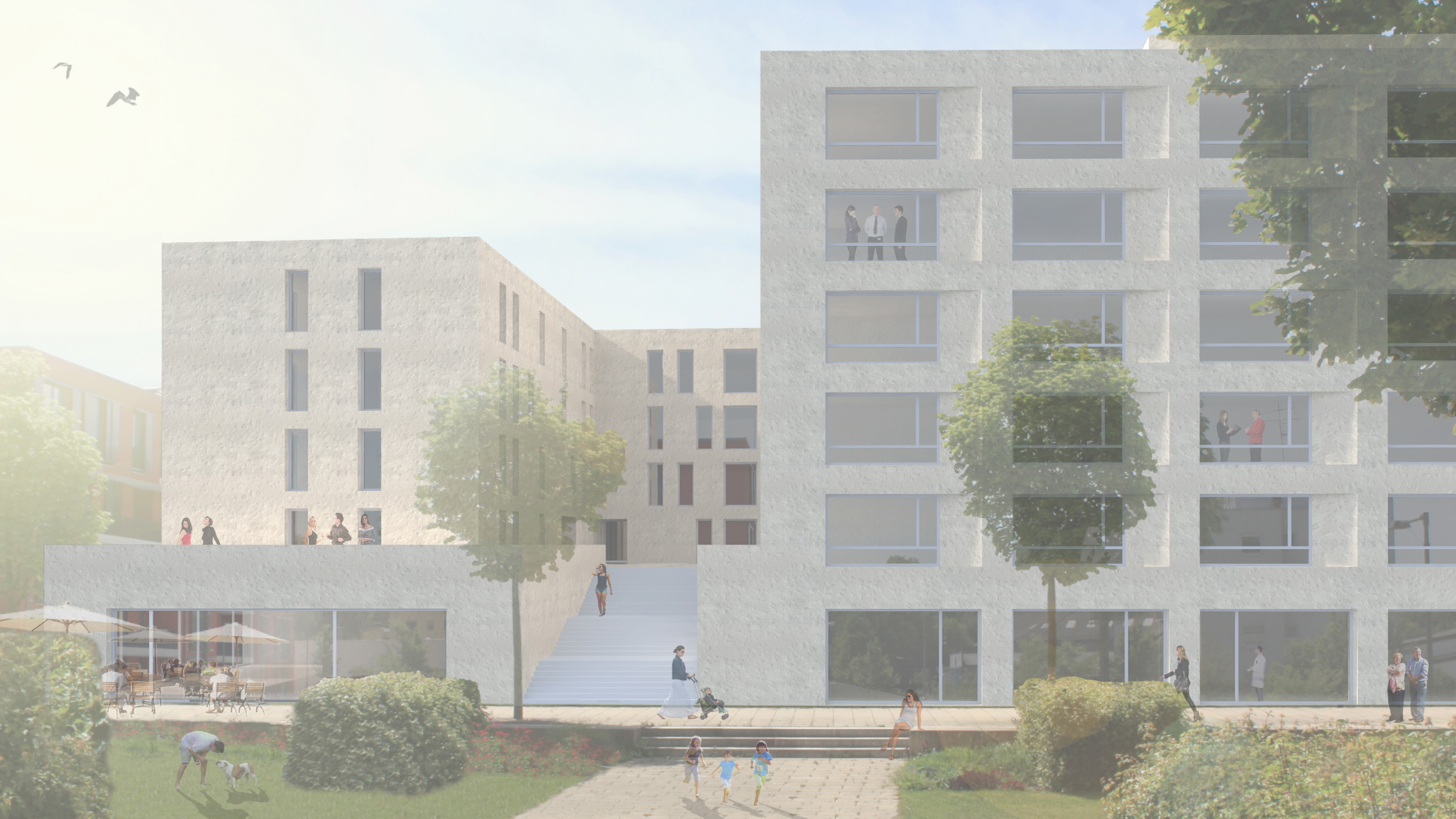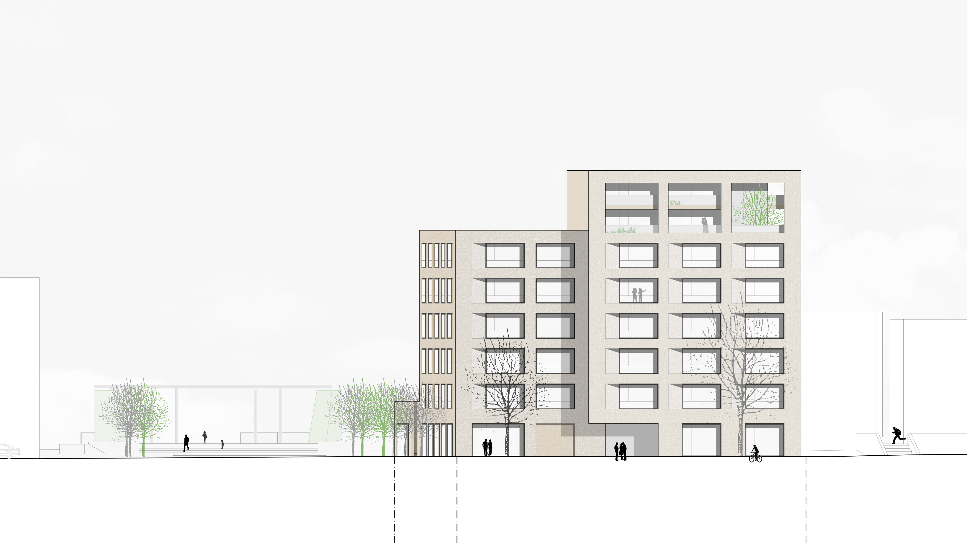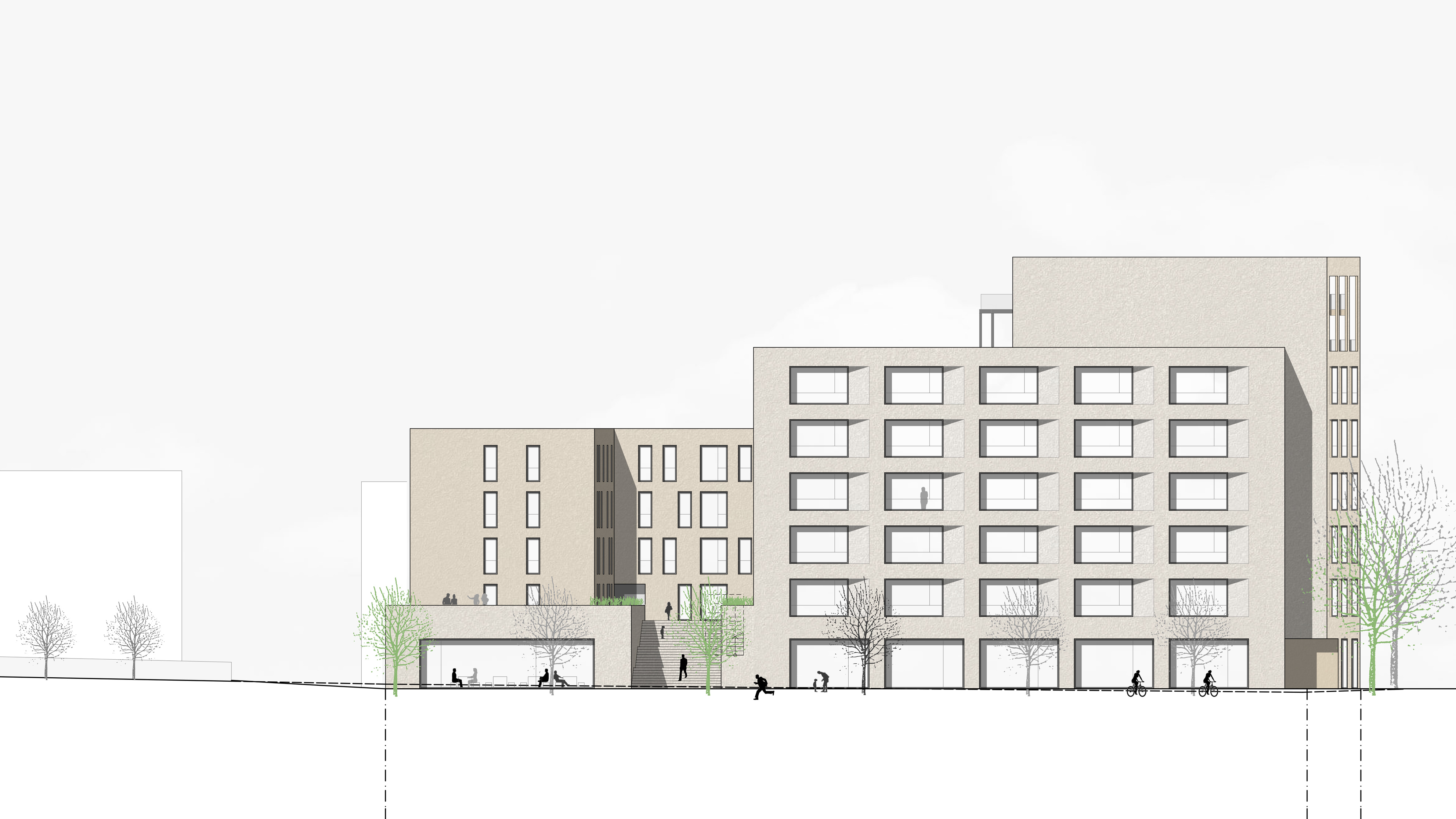 die klar gegliederte lochfassade fasst das gebäudeensemble formal zusammen, durch die geneigten leibungen entsteht ein lockeres spiel in der fläche. zur wohnbebauung hin löst sich die fassade in balkone und loggien auf. der geschützte innenhof als halböffentliche fläche lädt zum verweilen und zusammentreffen ein.