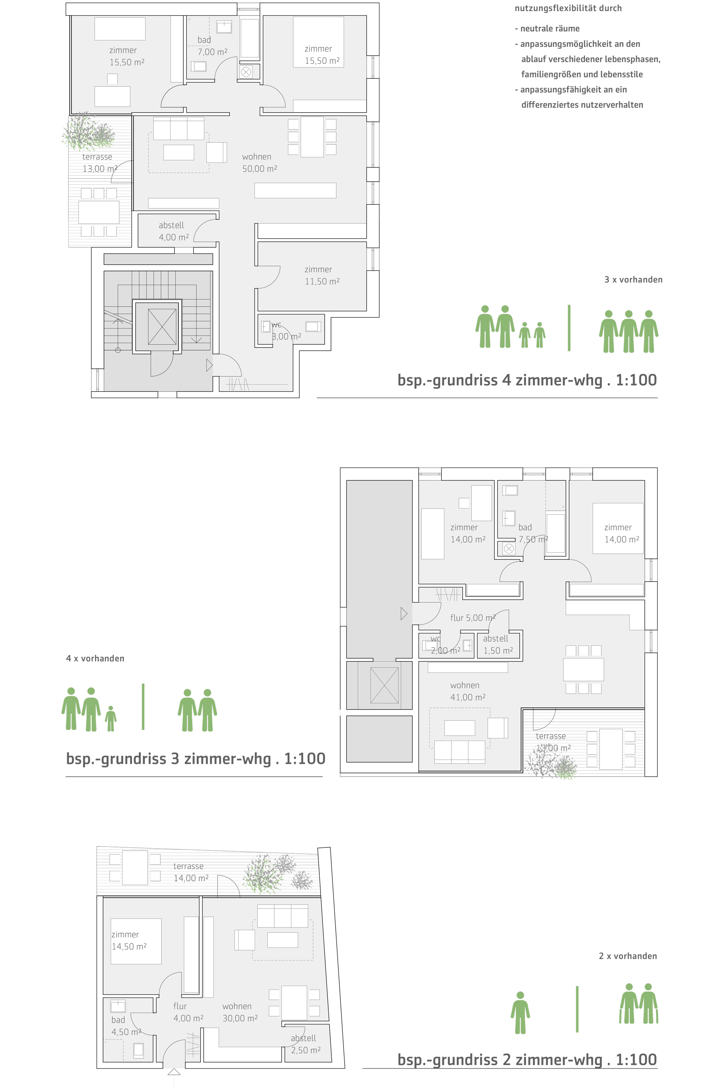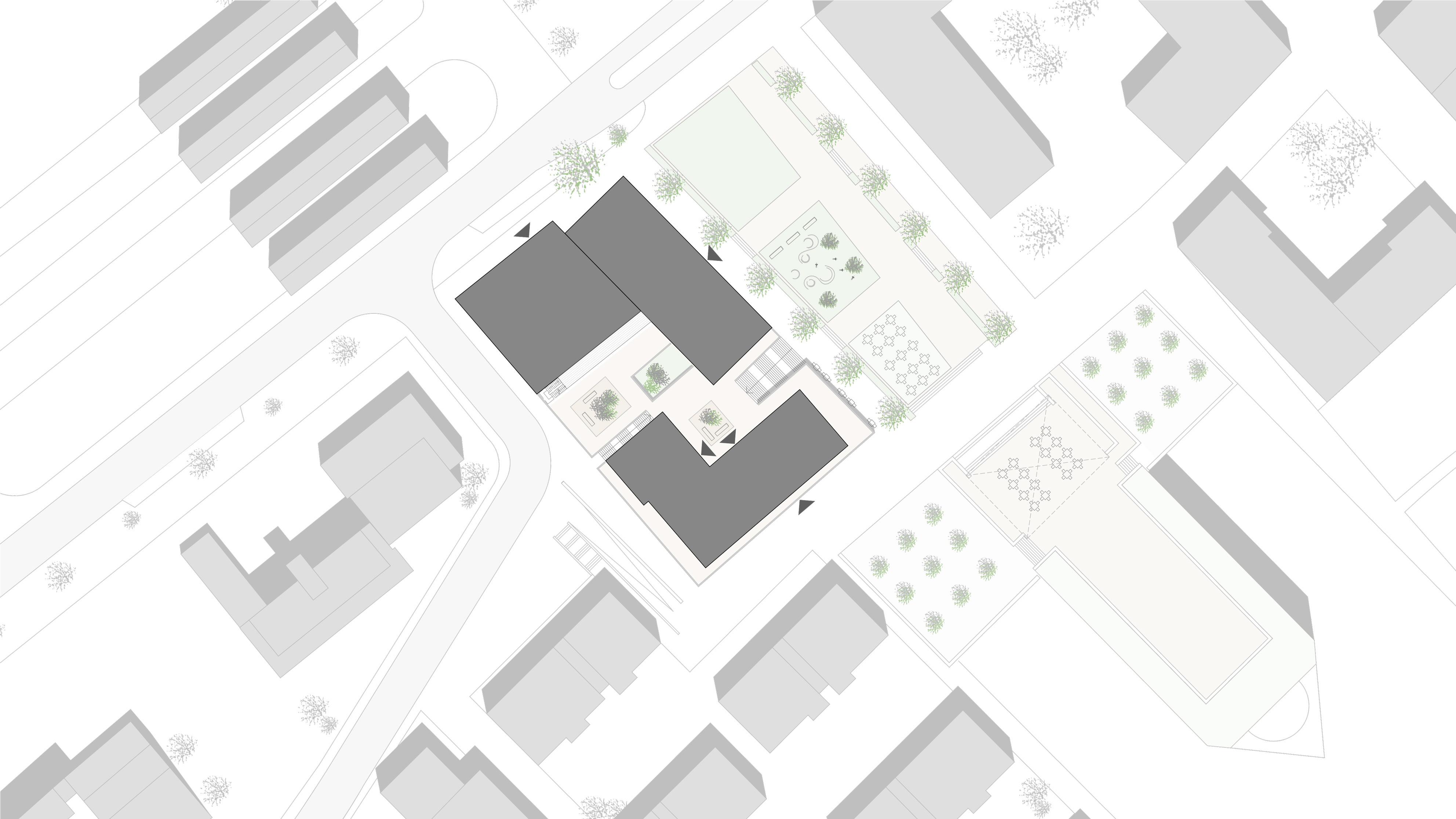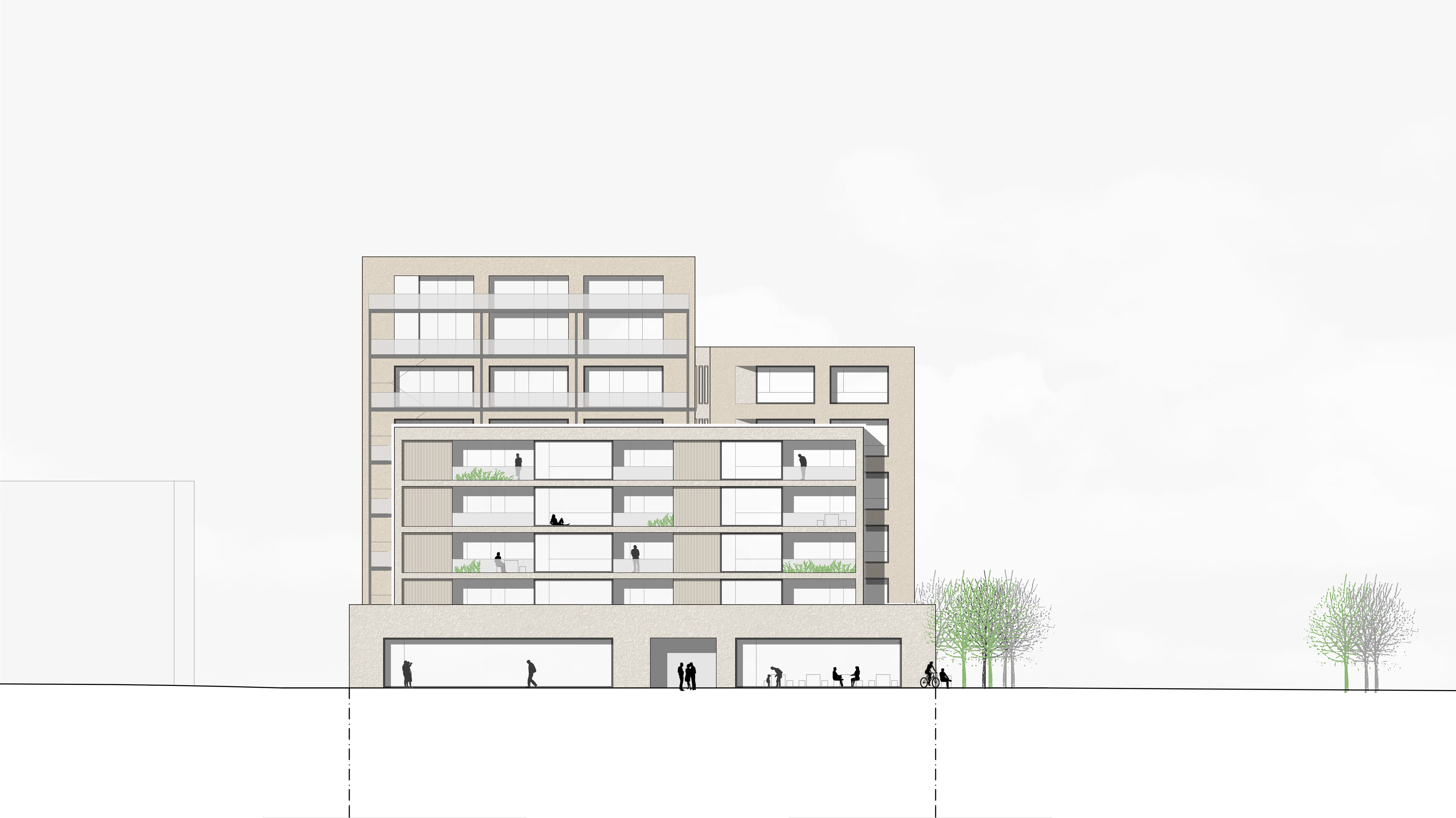 die klar gegliederte lochfassade fasst das gebäudeensemble formal zusammen, durch die geneigten leibungen entsteht ein lockeres spiel in der fläche. zur wohnbebauung hin löst sich die fassade in balkone und loggien auf. der geschützte innenhof als halböffentliche fläche lädt zum verweilen und zusammentreffen ein.