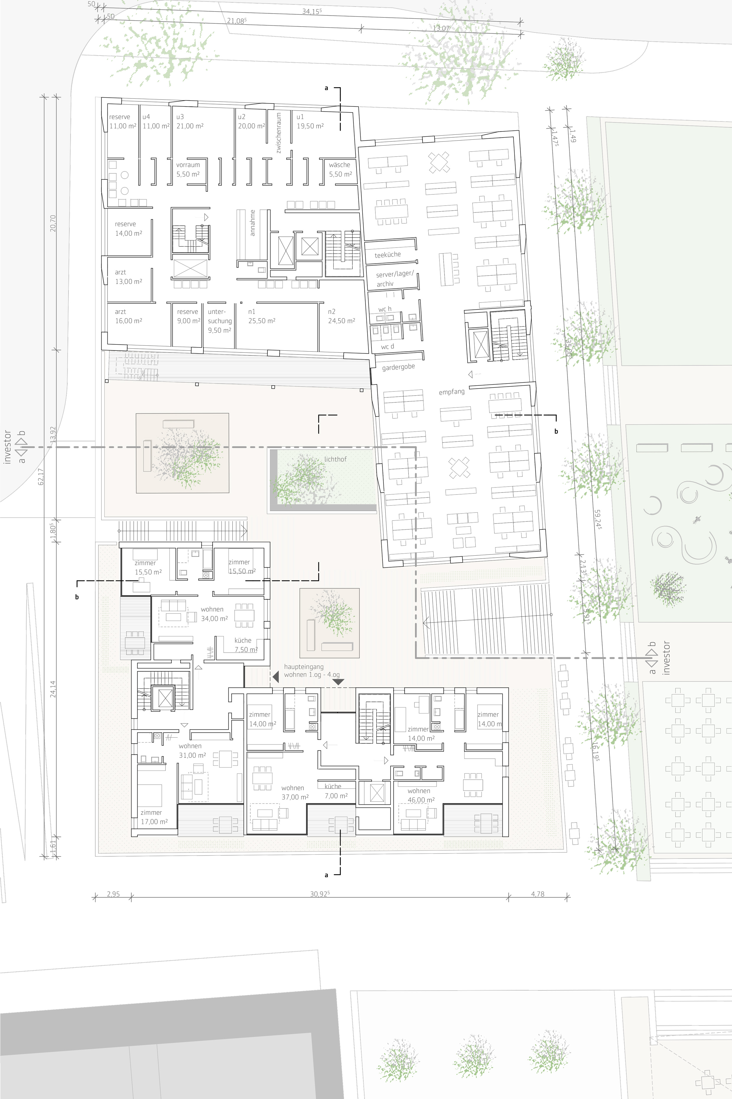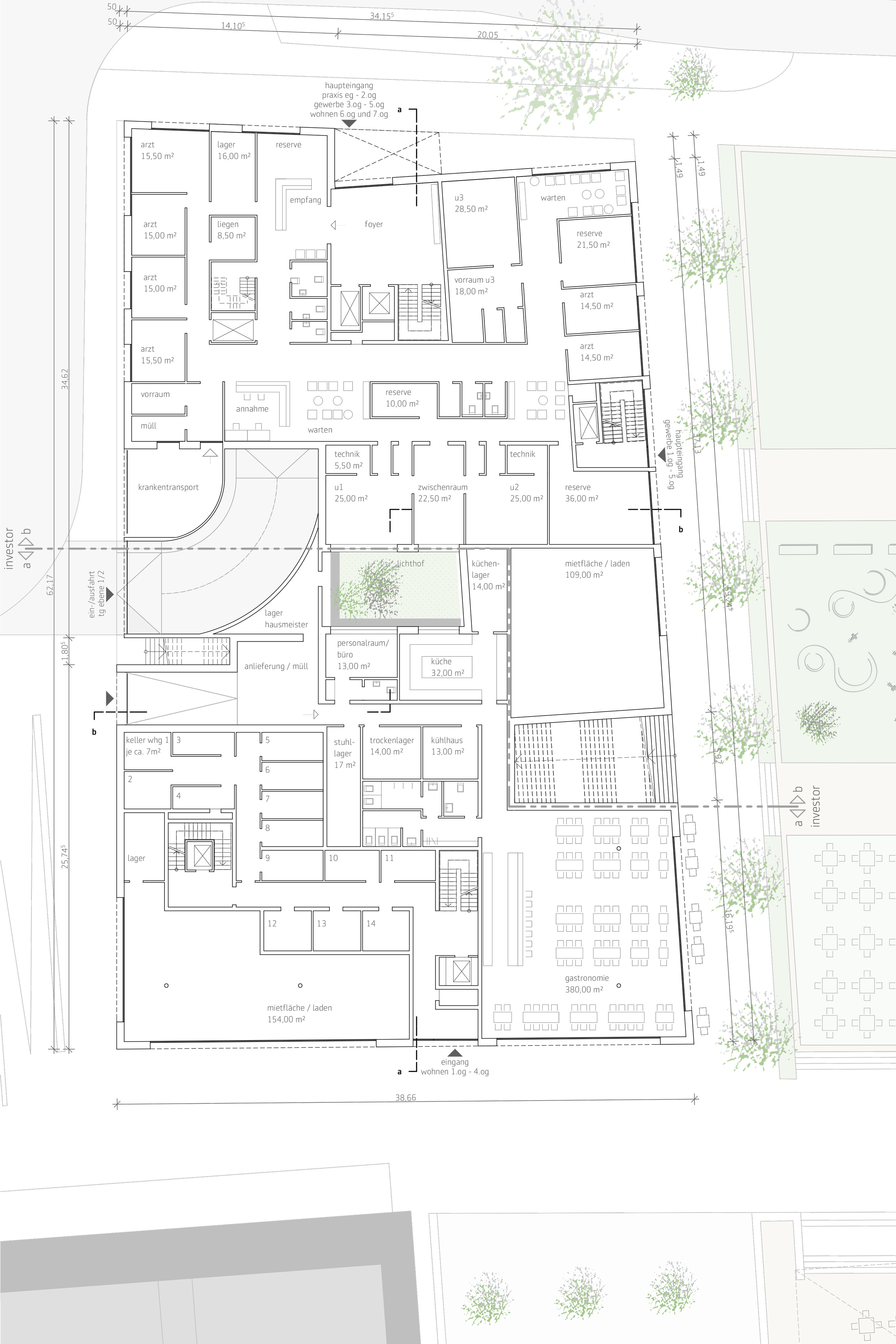 die sockelzone öffnet sich städtisch mit unterschiedlichen nutzungsmöglichkeiten. zum stadtplatz und der caponiere hin orientiert sich die gastronomie mit ca. 120 gastraumplätzen und der außengastronomie. zwei weitere mieteinheiten mit 110 bzw.150m² beleben die sockelzone zusätzlich. entlang der turmstraße sind u.a. die tiefgarageneinfahrt sowie der wirtschaftshof der praxis/klinik angeordnet. ein möglicher krankentransport kann hier ebenerdig erfolgen.