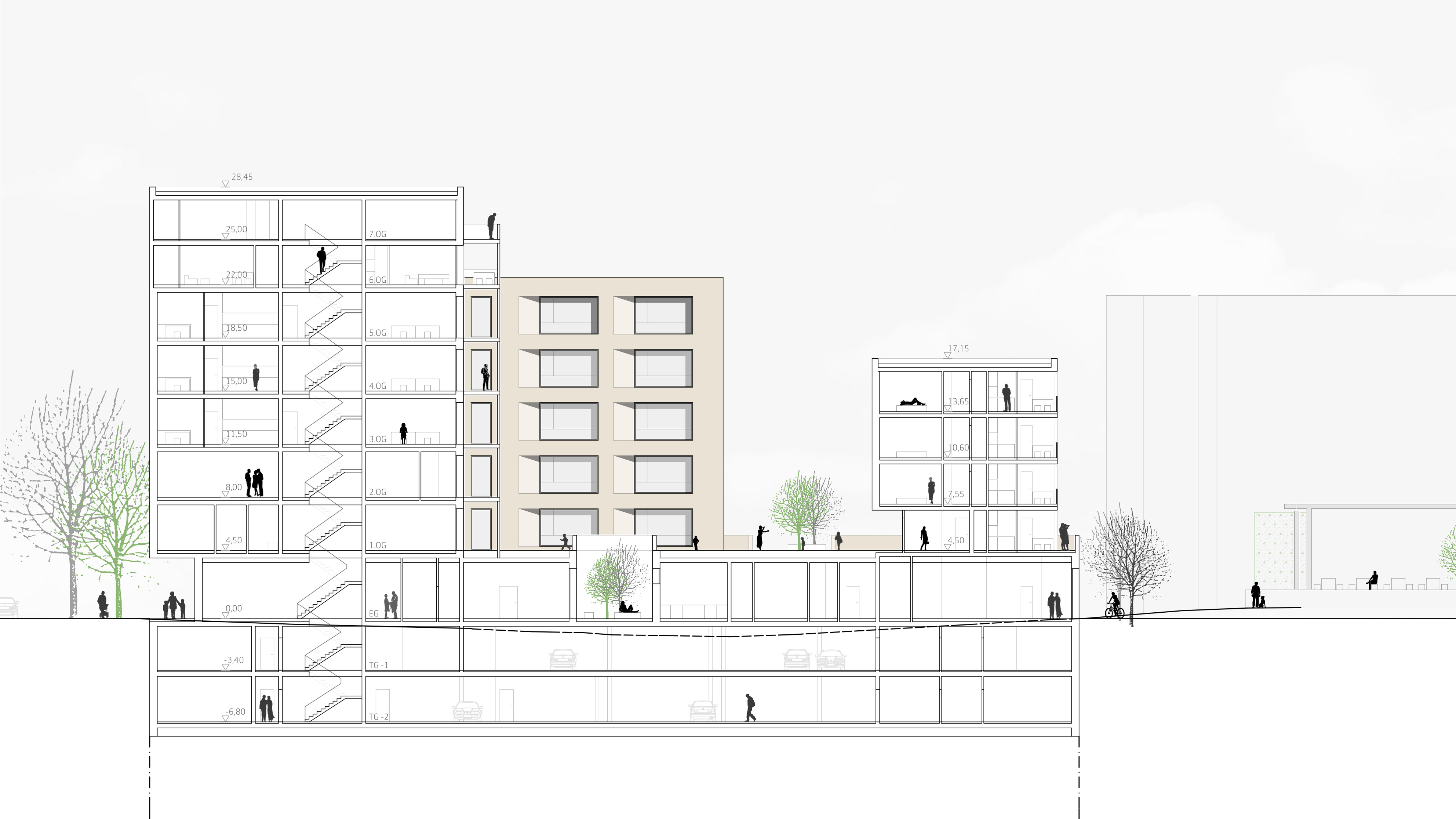 der vorschlag zur neubebauung des areals südlich der meininger allee in neu-ulm gliedert sich in eine zweigeschossige tiefgarage, ein durchgängiges sockelgeschoss mit halböffentlichen nutzungen sowie drei hochbauten mit gewerbe- und wohnnutzung sowie einem halböffentlichen innenhof.
