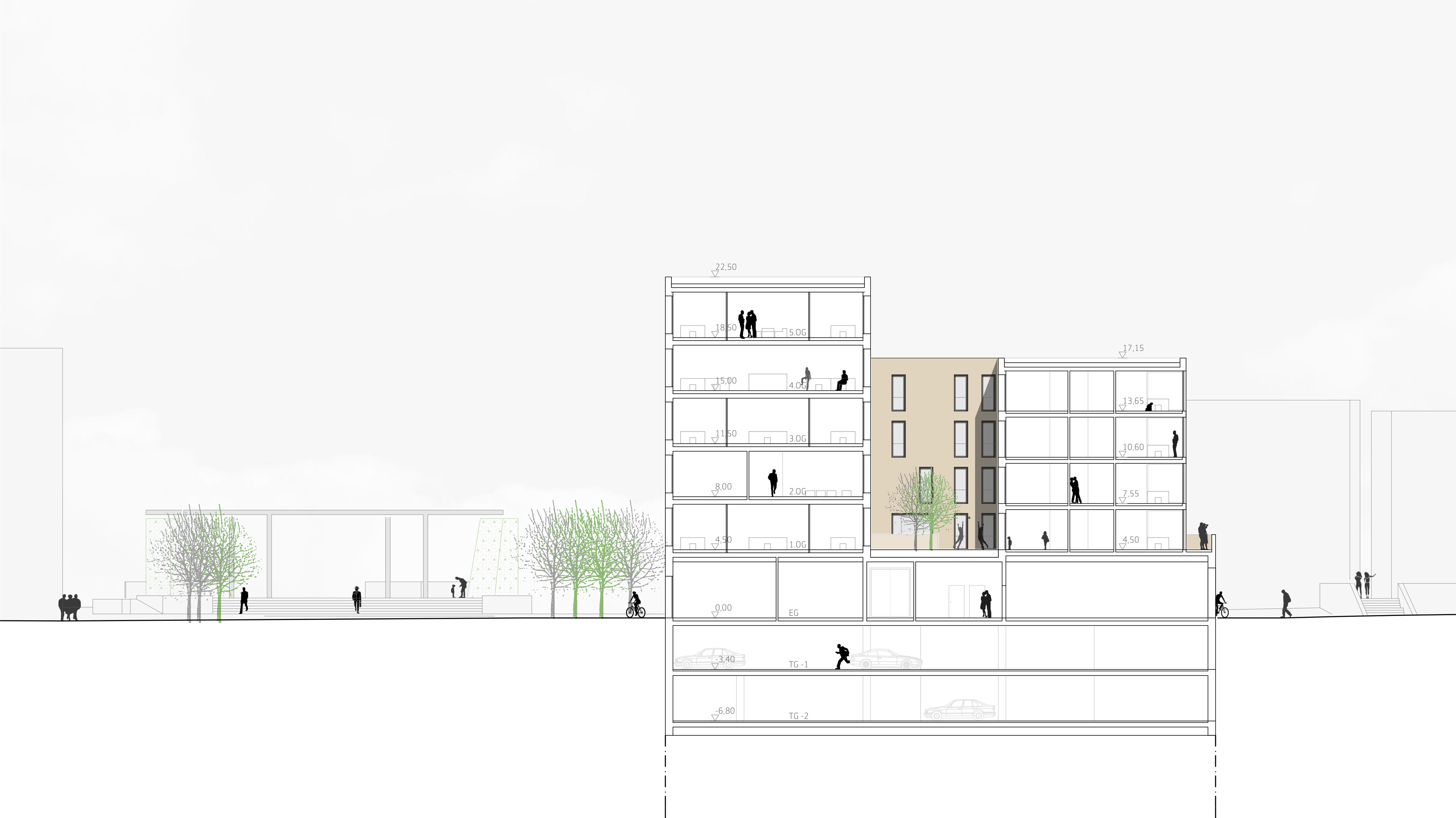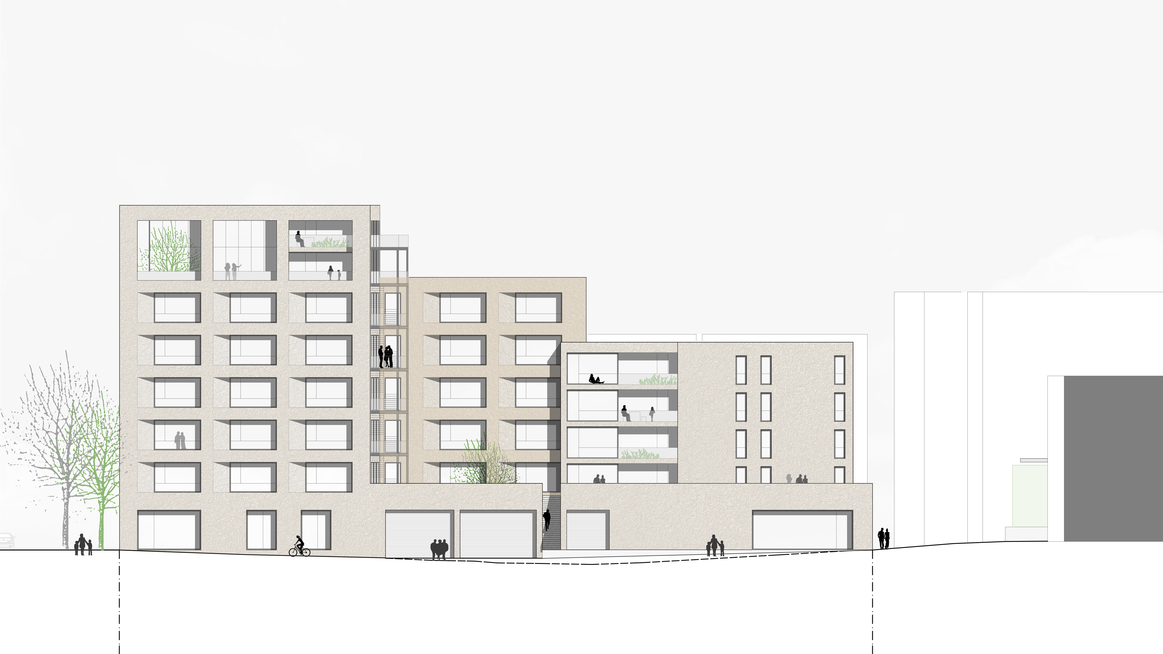 im süden befindet sich, getrennt durch einen halböffentlichen und durchwegbaren innenhof, die zur caponiere und dem glacis-park hin orientierte wohnbebauung mit 4 wohngeschossen. es entstehen dort insgesamt ca. 16 barrierefrei erschlossene wohneinheiten mit offenen fassaden und loggien.