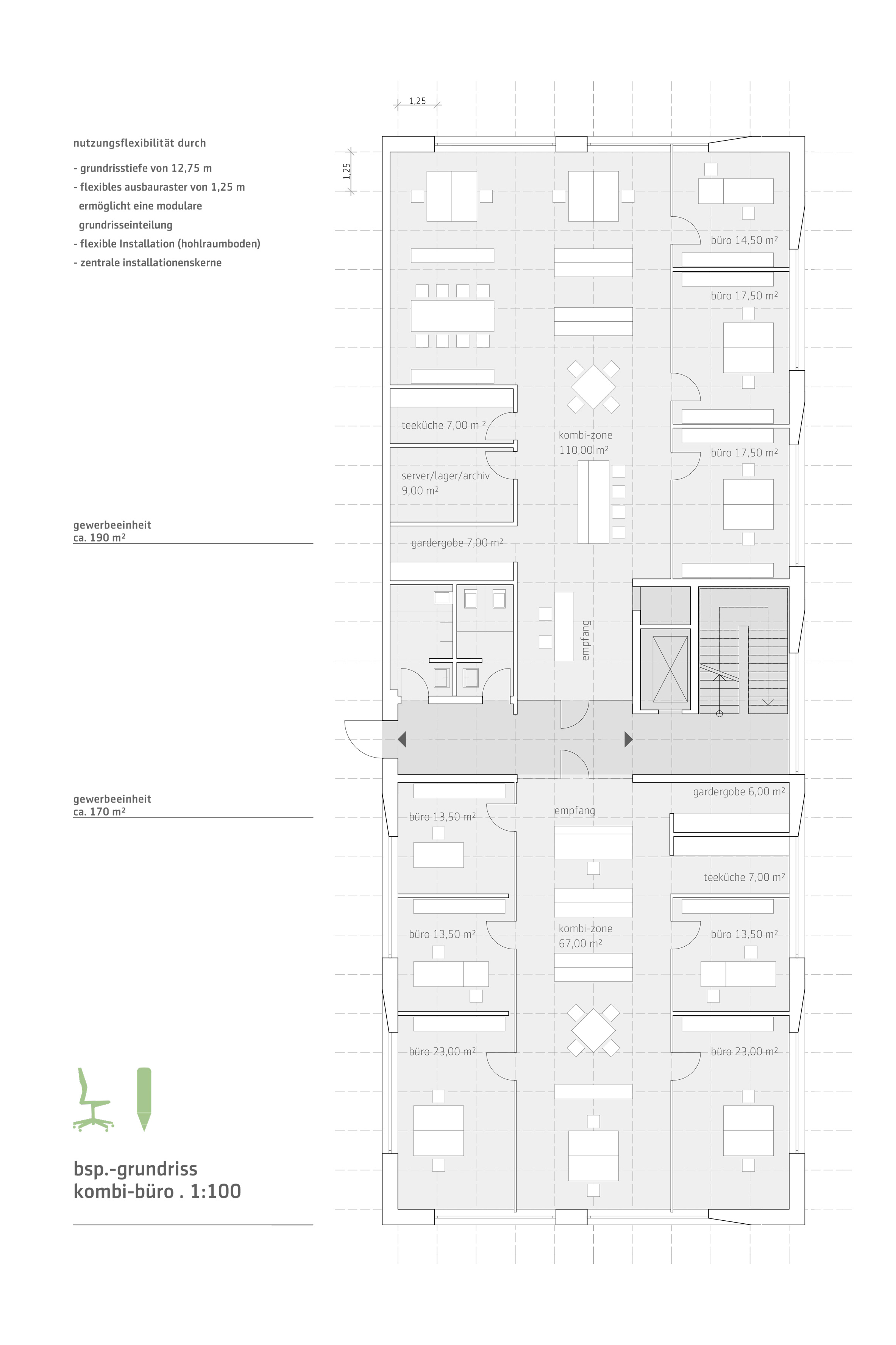 der sechsgeschossige nord-östlich gelegene gewerberiegel vermittelt maßstäblich zur nachbarbebauung und definiert die neue platzkante des theodor-von-hildebrand-platzes. sein flexibles ausbauraster und die flexiblen installationsmöglichkeiten wie z.b. der hohlraumboden lassen unterschiedlichste nutzungen und arbeitsformen zu.
