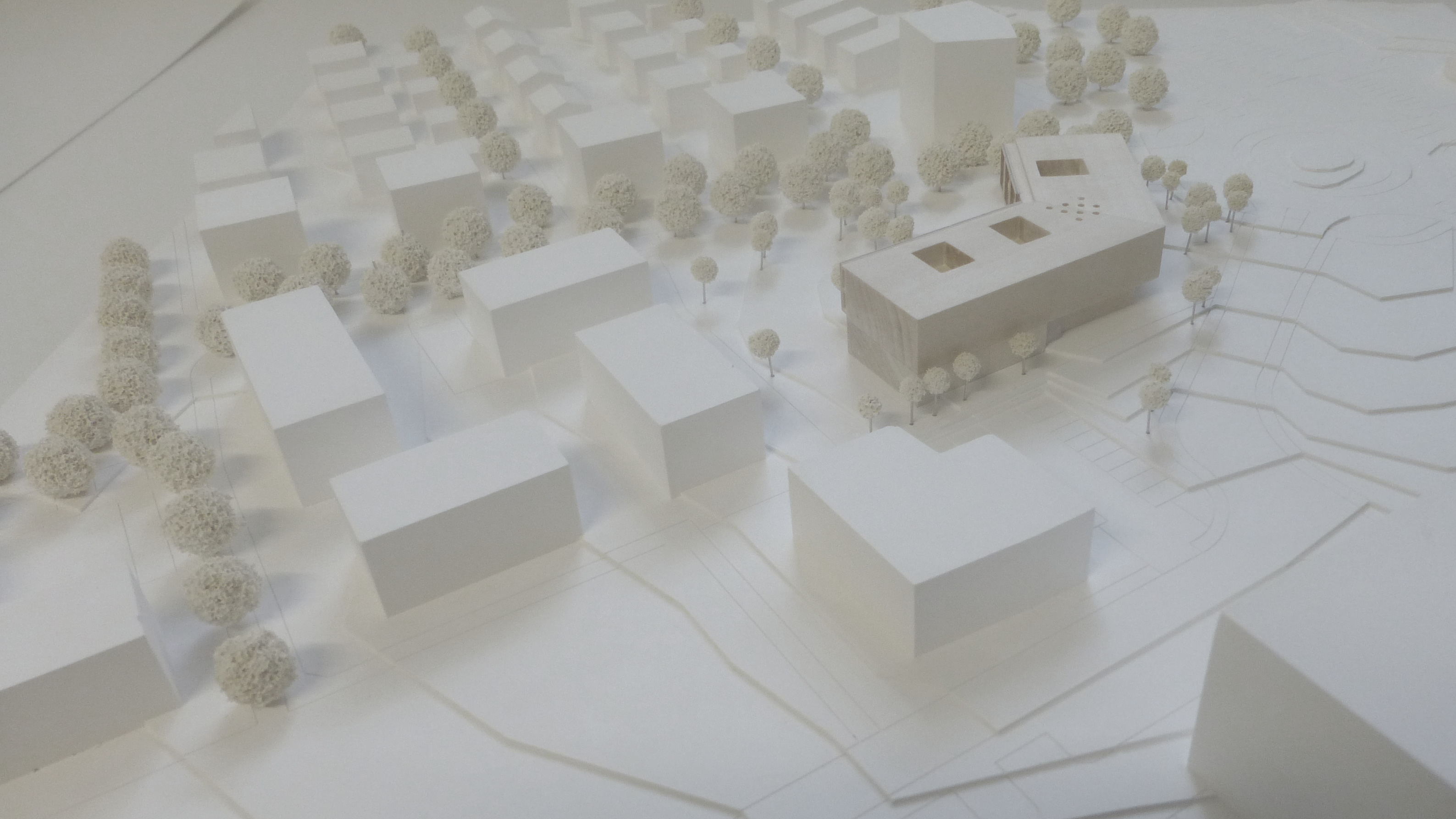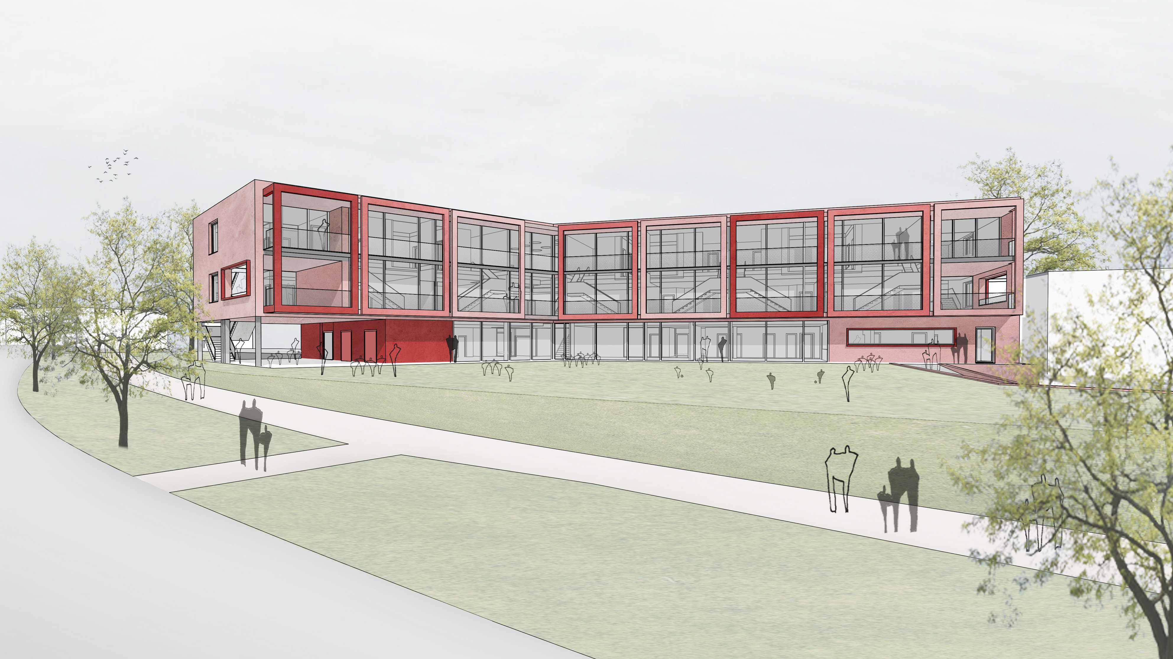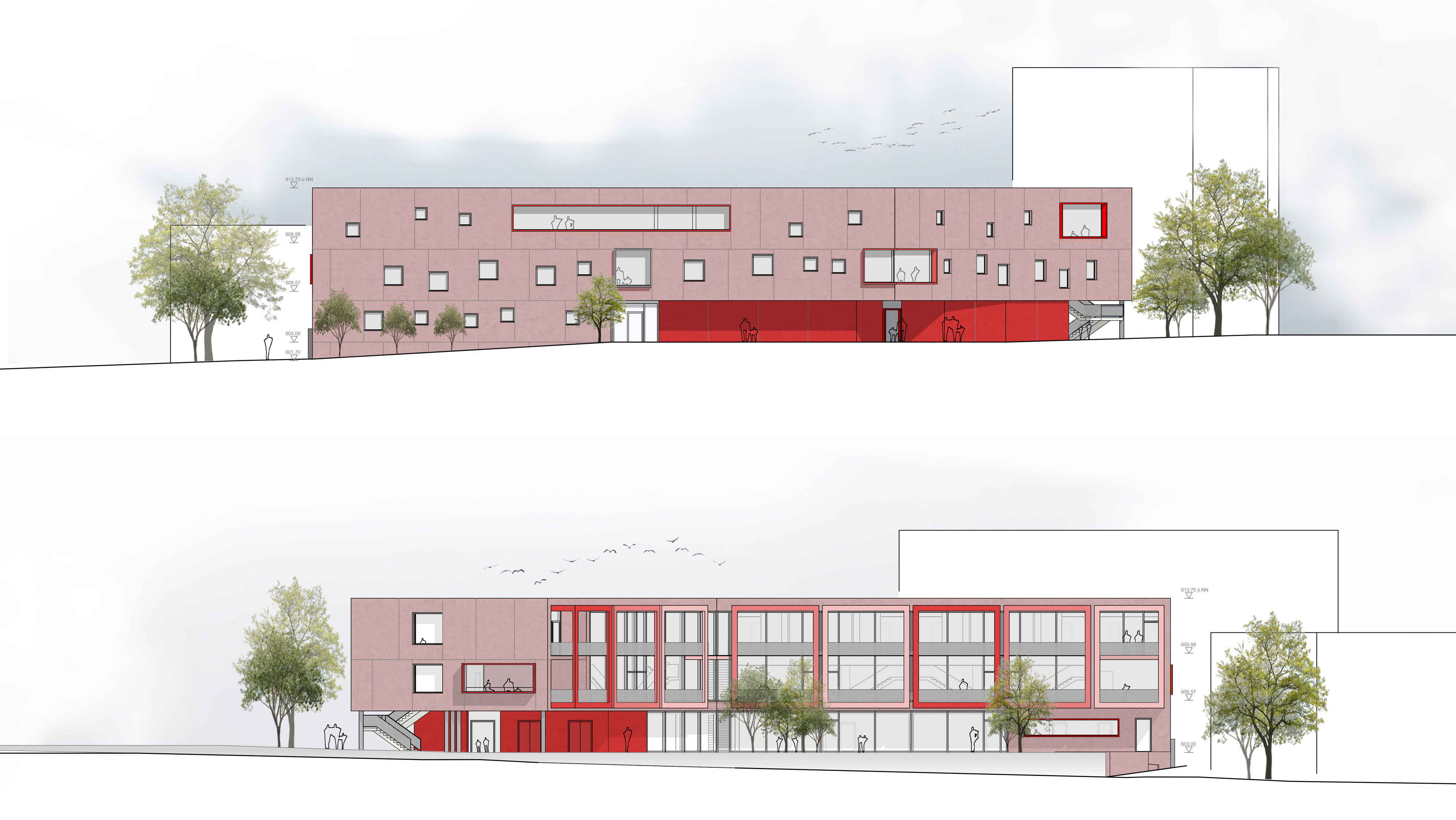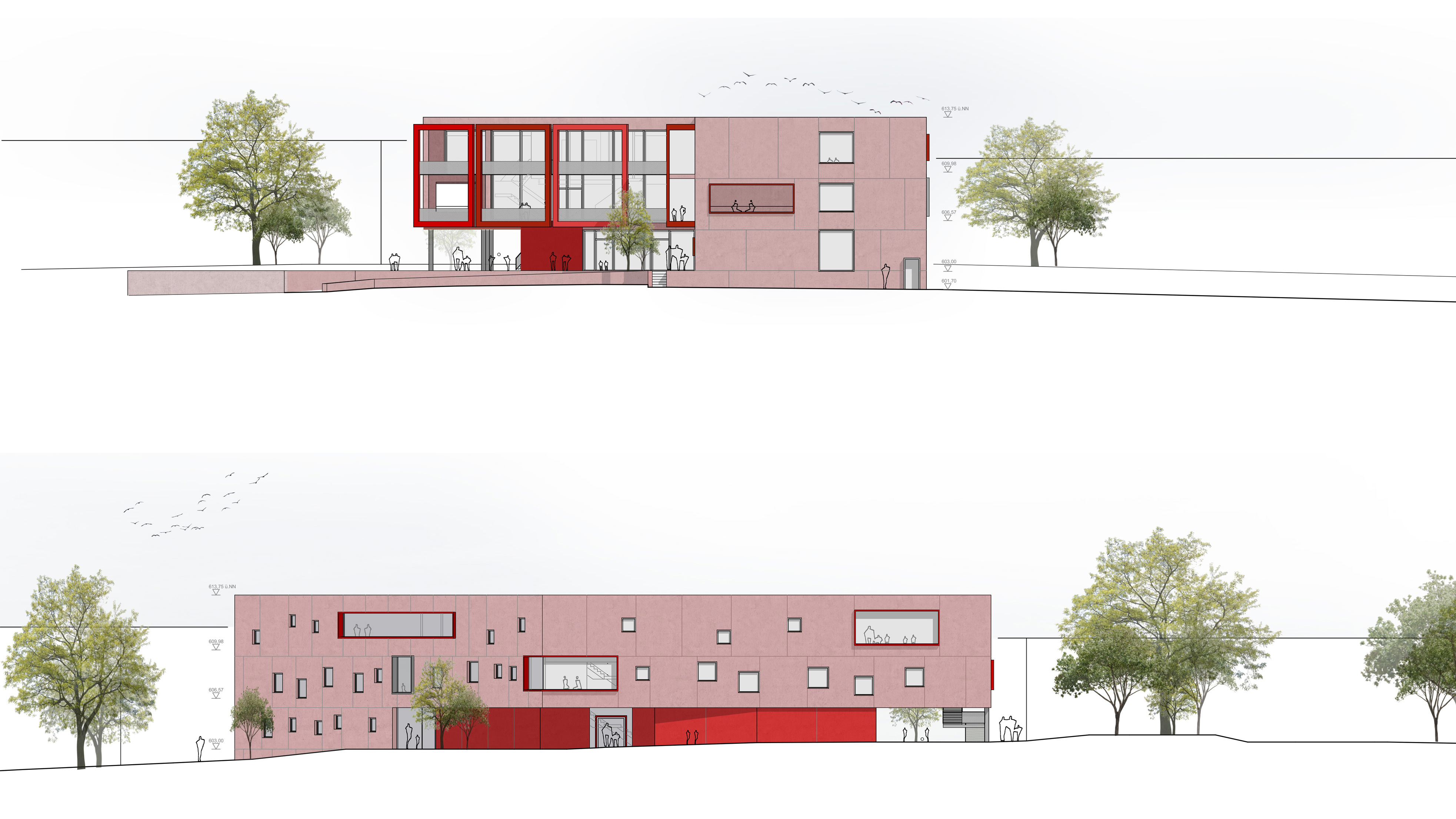 der hauptbaukörper wird aus strukturierten, haptischen sichtbeton-fertigteilen, lasiert in einem warmen hellen rot-ton, vorgeschlagen. beeinflussung der optik und haptik der betonoberfläche durch z.b. matrizen oder mechanische nachbehandlung. alternativ aussenwände fugenlos aus monolitischem lasierten dämmbeton.