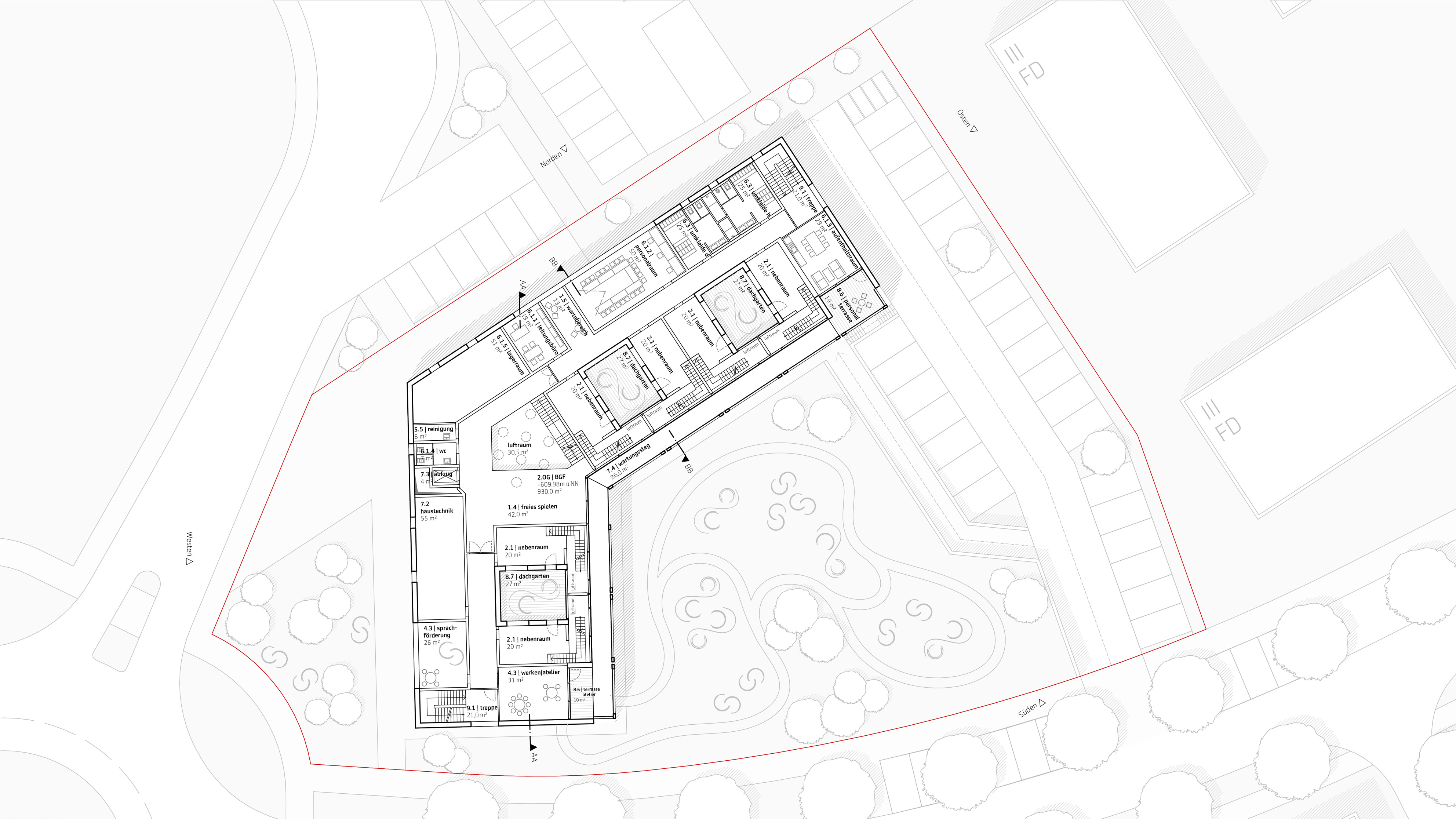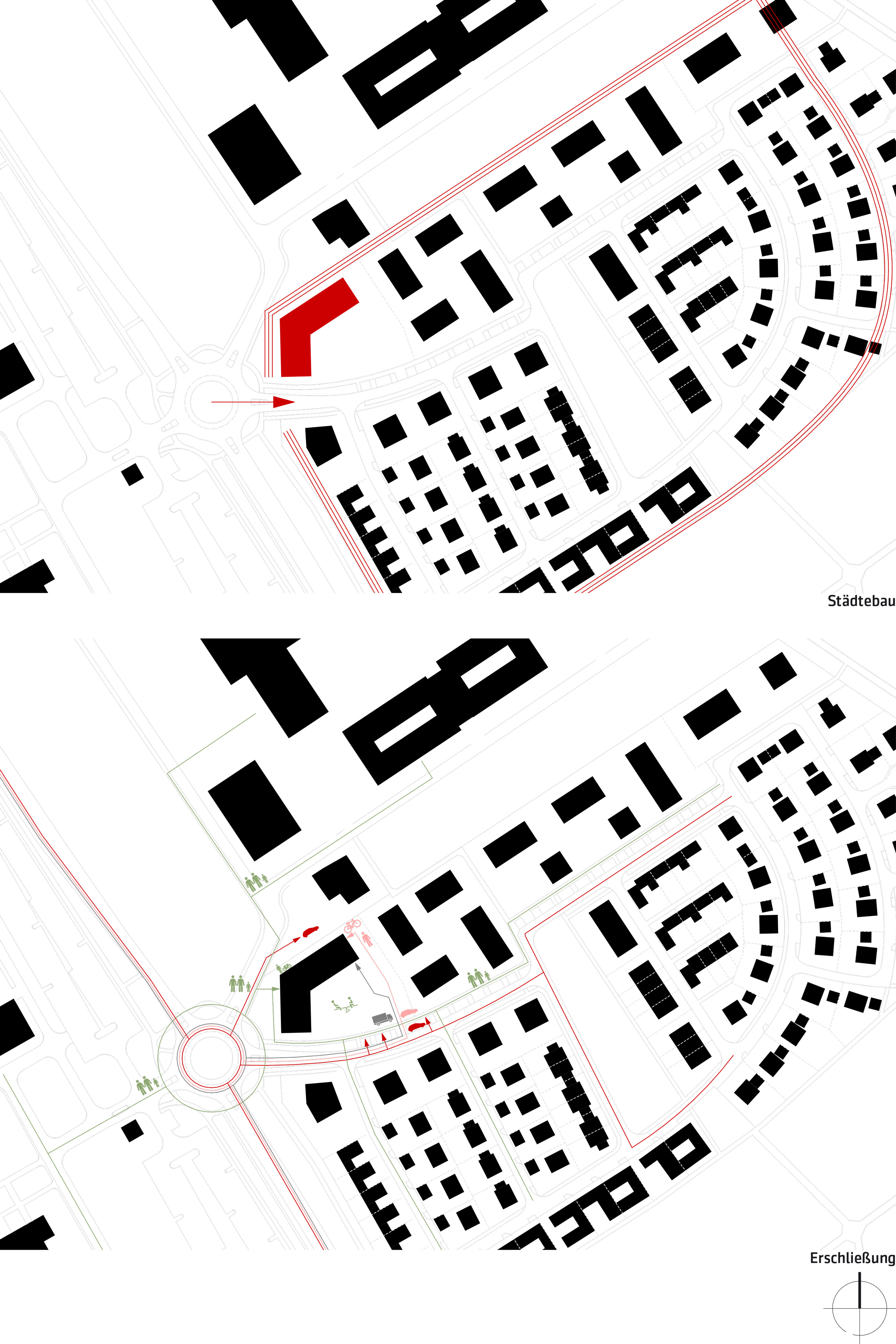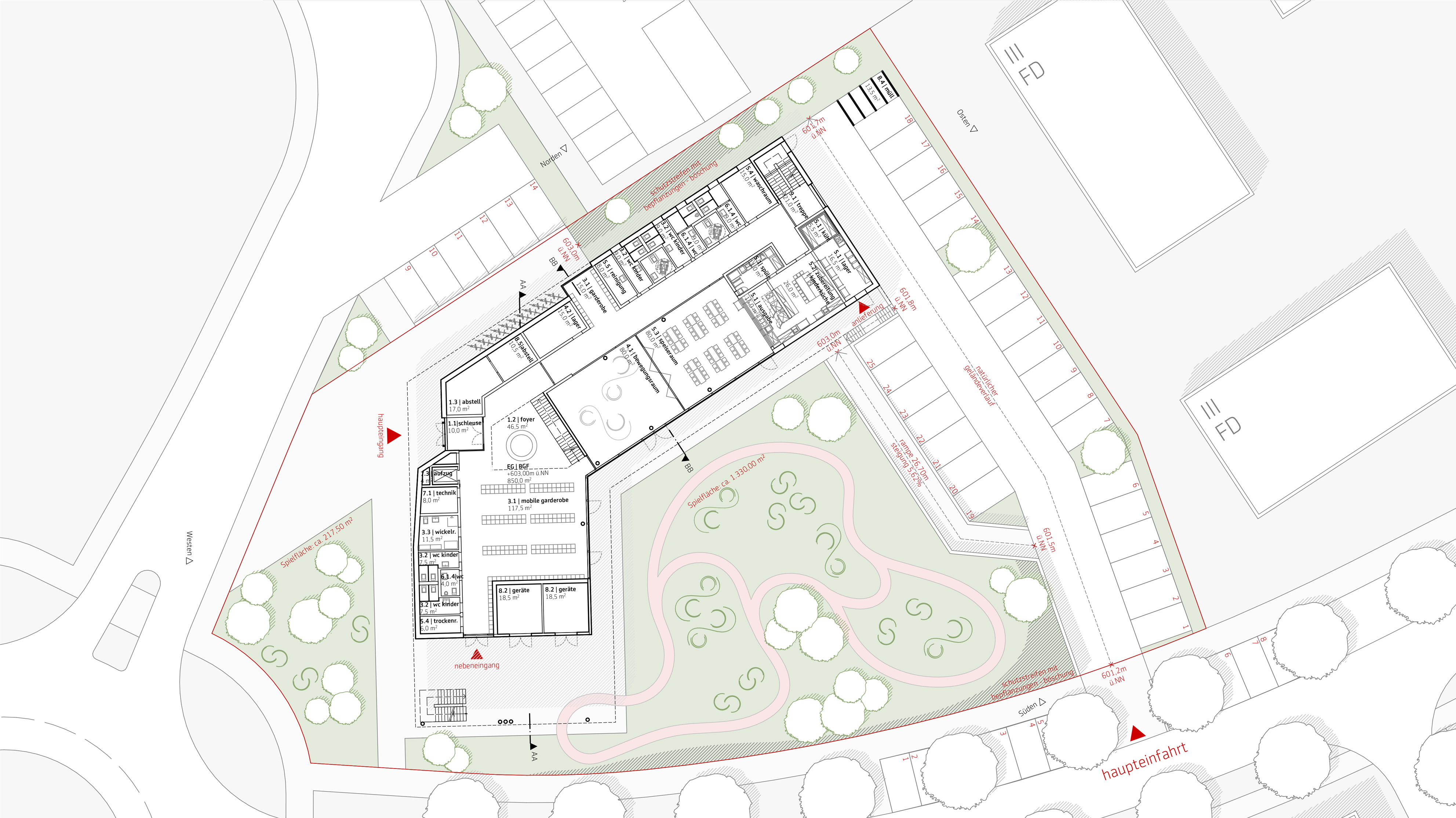 auf der nord- und westseite ist das eg ein stück weit gegenüber den obergeschossen eingerückt. das gebäude erscheint so leichter und generiert damit eine dynamische geste entlang des kreisverkehrs. zudem leiten die konischen rücksprünge subtil aber klar auf den haupteingang zu und bilden überdachte bereiche vor dem windfang und für fahrräder.