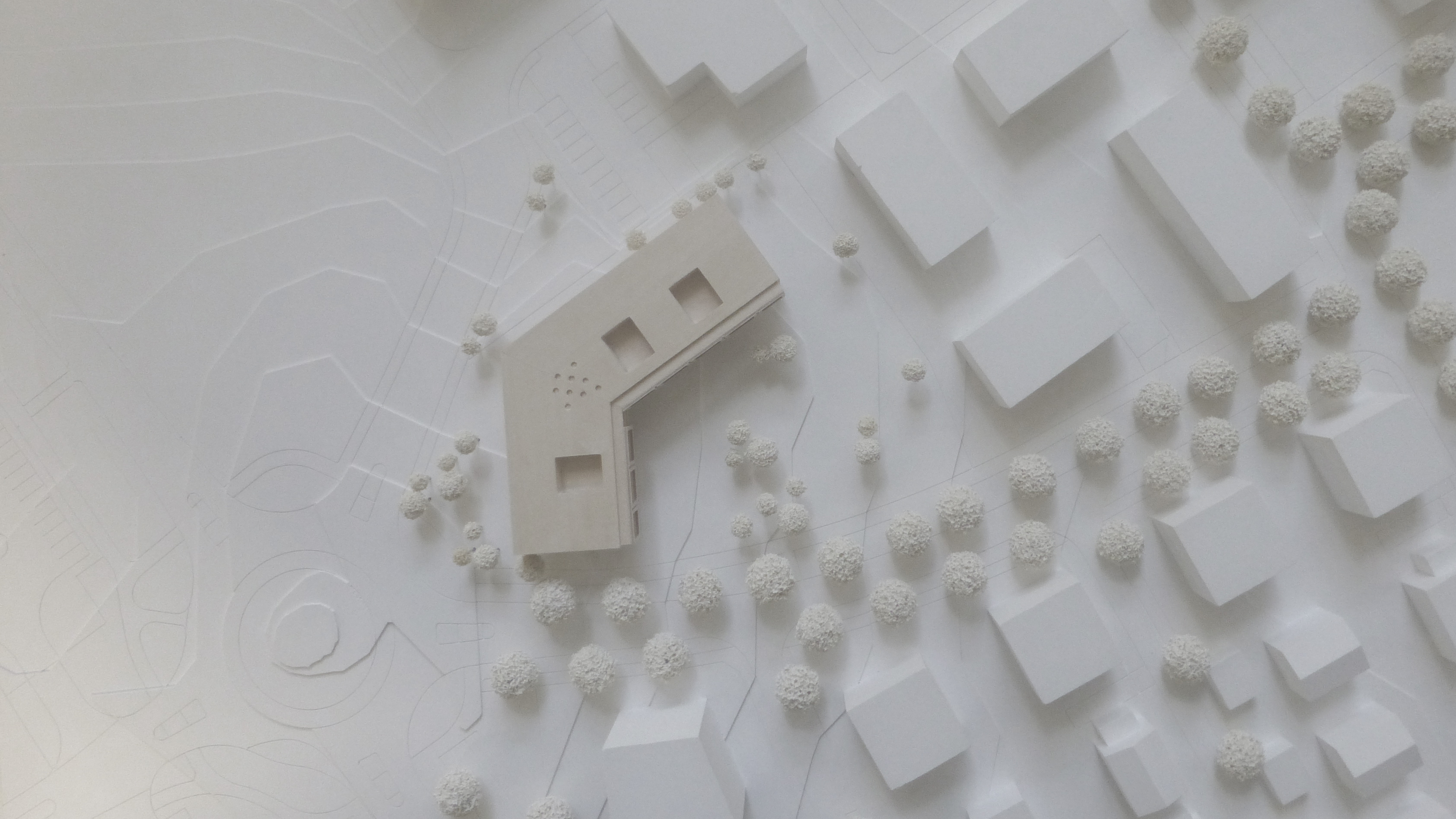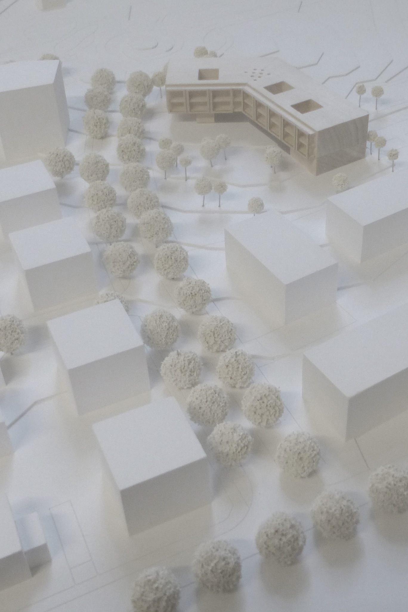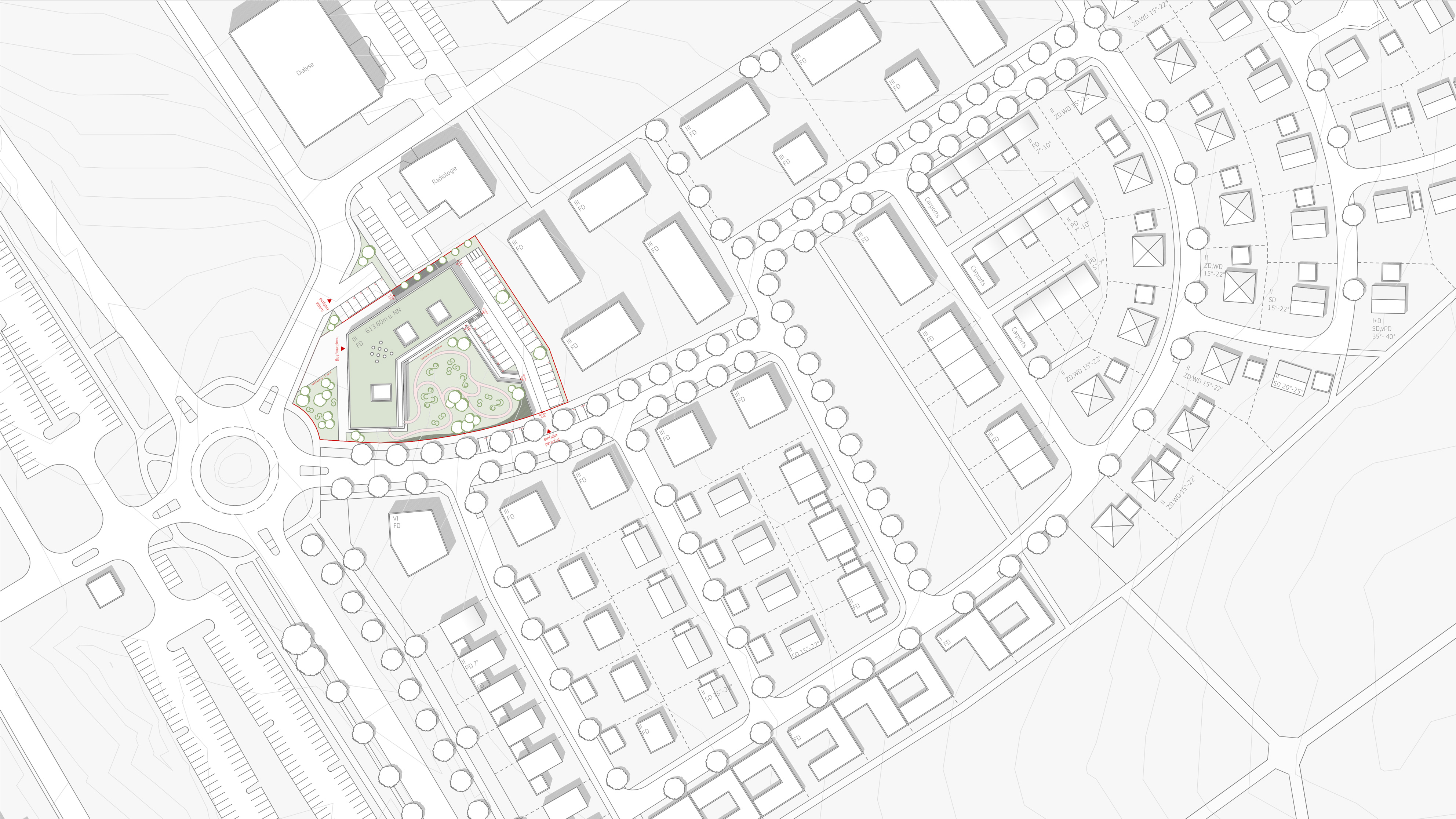 auf der nord- und westseite ist das eg ein stück weit gegenüber den obergeschossen eingerückt. das gebäude erscheint so leichter und generiert damit eine dynamische geste entlang des kreisverkehrs. zudem leiten die konischen rücksprünge subtil aber klar auf den haupteingang zu und bilden überdachte bereiche vor dem windfang und für fahrräder.