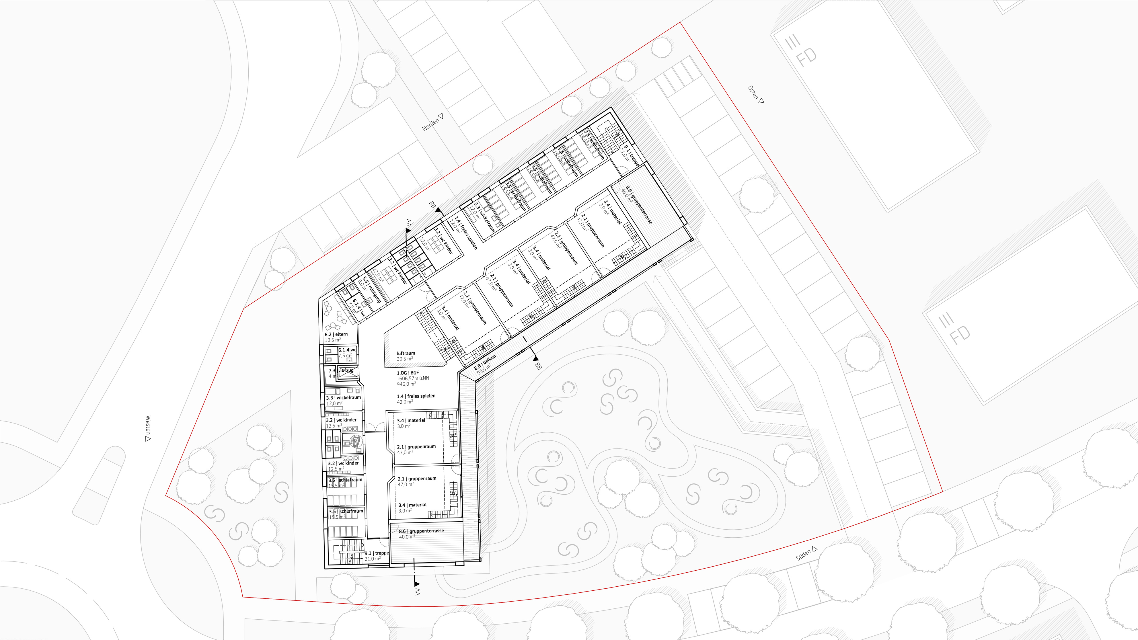im innenbereich werden die wände der gemeinschafts-/gruppenräume und flure teils in abgestuften rot-tönen vorgeschlagen, teils weiße wände für kinderbilder. böden in orangefarbenem kautschuk, schlafräume helles blau. kontraste zwischen boden und wänden erleichtern die orientierung, die böden etwas heller, die wände etwas kräftiger. türen und zargen in einem durchgängigen farbton, abgesetzt von den wandfarben unterstützen die kinder ebenso bei der orientierung. abgehängte gipskarton-akustik-lochdecken in weiß für maximale helligkeit im raum. bei kunstlicht bevorzugen kinder punktuelle lichtquellen, somit kreisrunde aufbauleuchten unterschiedlicher größe, in teilbereichen dimmbar.
