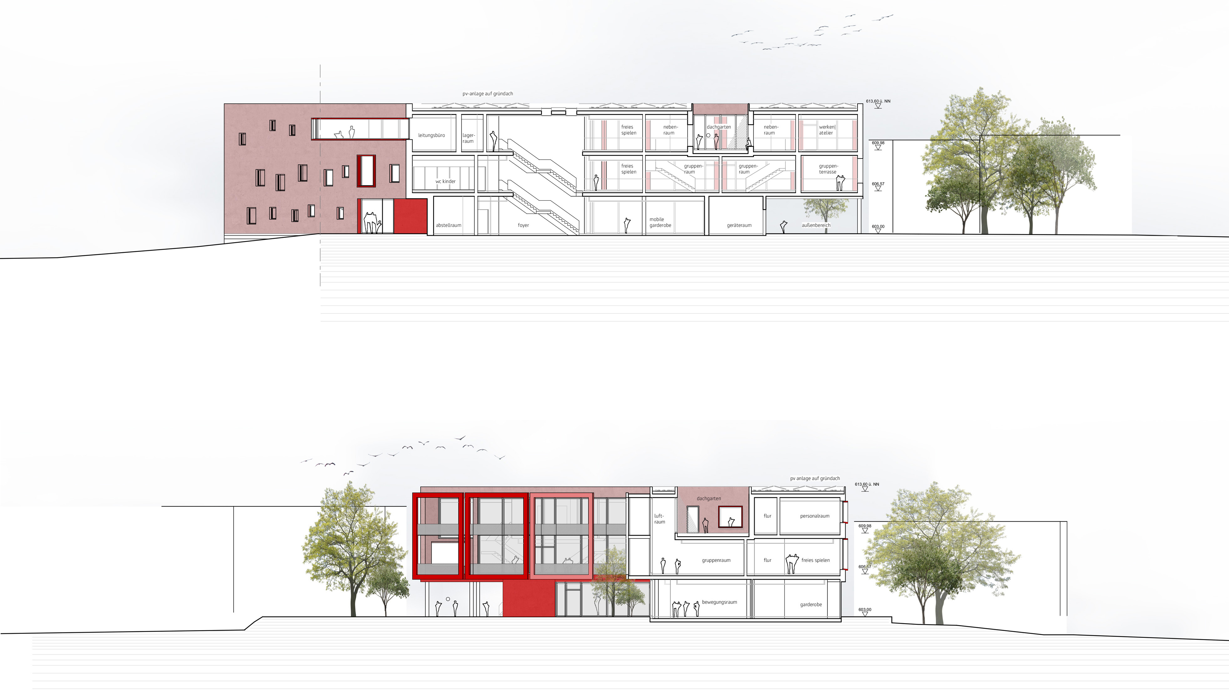 gartenseitige „frames / bilderrahmen“ aus farbig lasierten betonfertigteilen in abgestuften rot-tönen vor den 2-geschossigen gruppenräumen geben der gartenfassade struktur, proportion, identifikation. die frames werden an den auskragenden balkon- und vordachelementen befestigt. an der nord-west-fassade bilden farbige betonfertigteile rahmen um die drei größten fassadenöffnungen. die windfang-element-rahmen auch farbig.