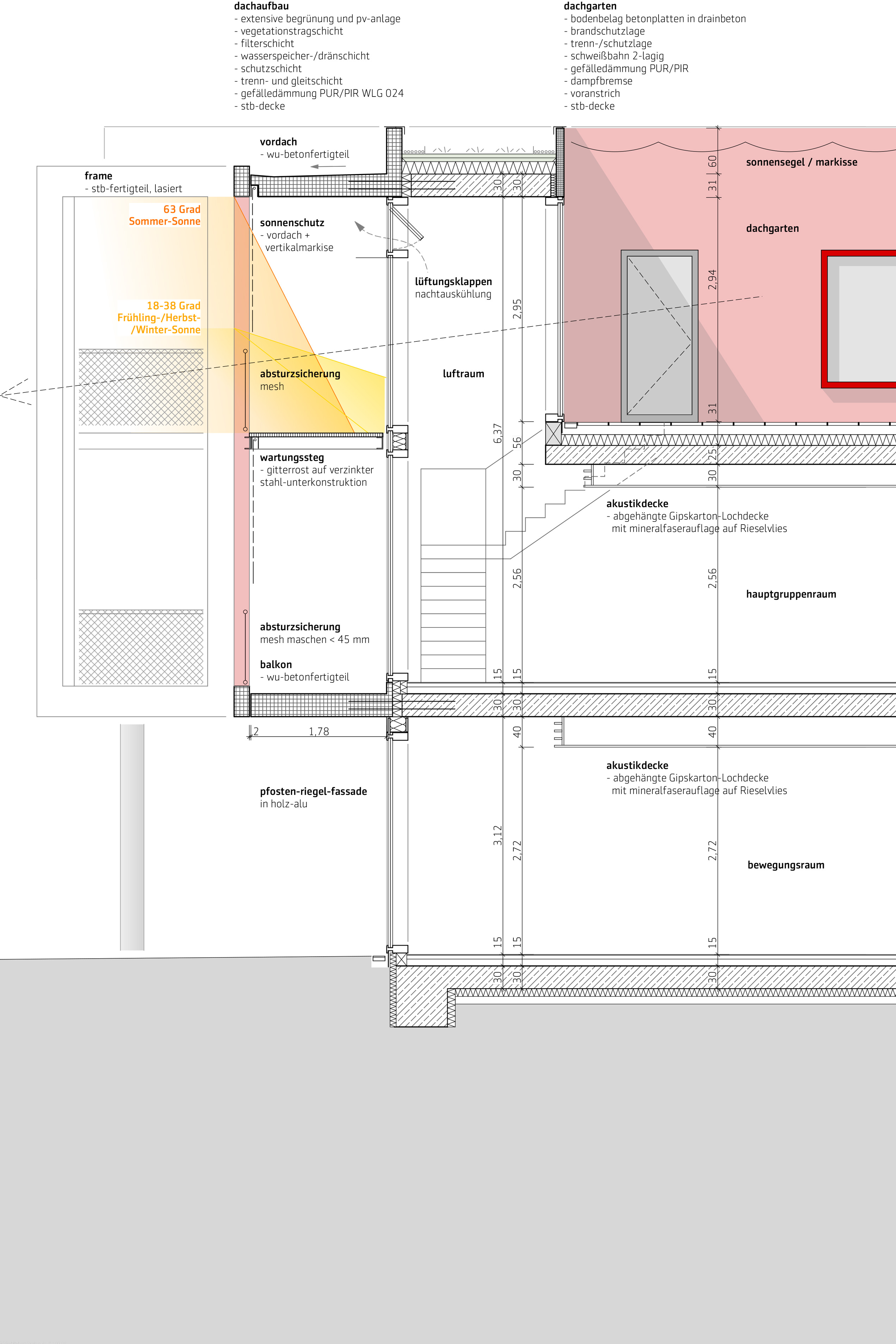 gruppen- und gemeinschaftsräume mit raumhohen holz-alu-pfostenriegel-fassaden, verschattung durch auskragende balkone/dachvorsprung gegen direkte sommersonne, zusätzliche vertikalmarkisen mit durchsichtigem stoff in obergeschossen in ebene der frames für tiefstehende sonne in übergangsjahreszeiten.