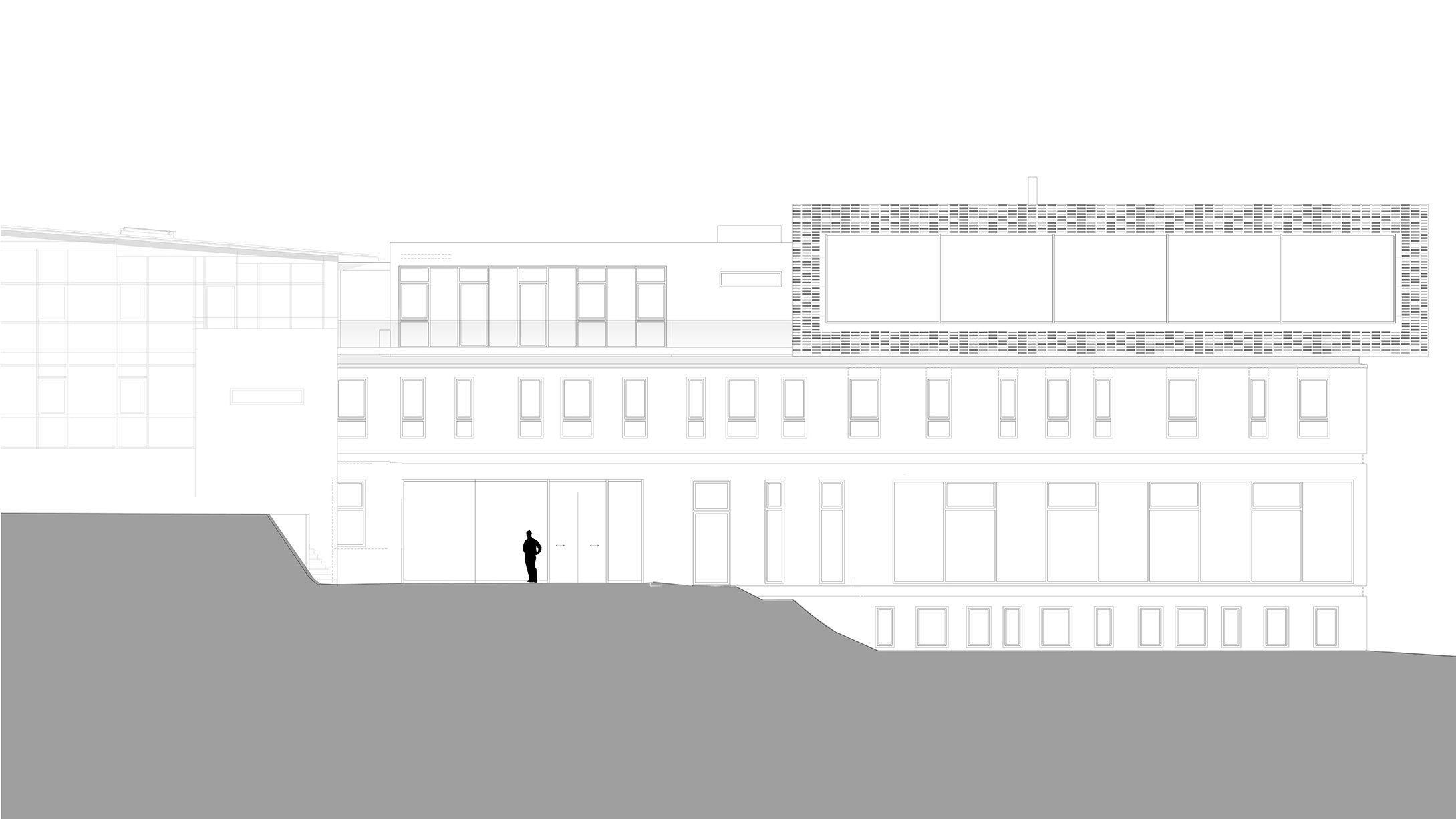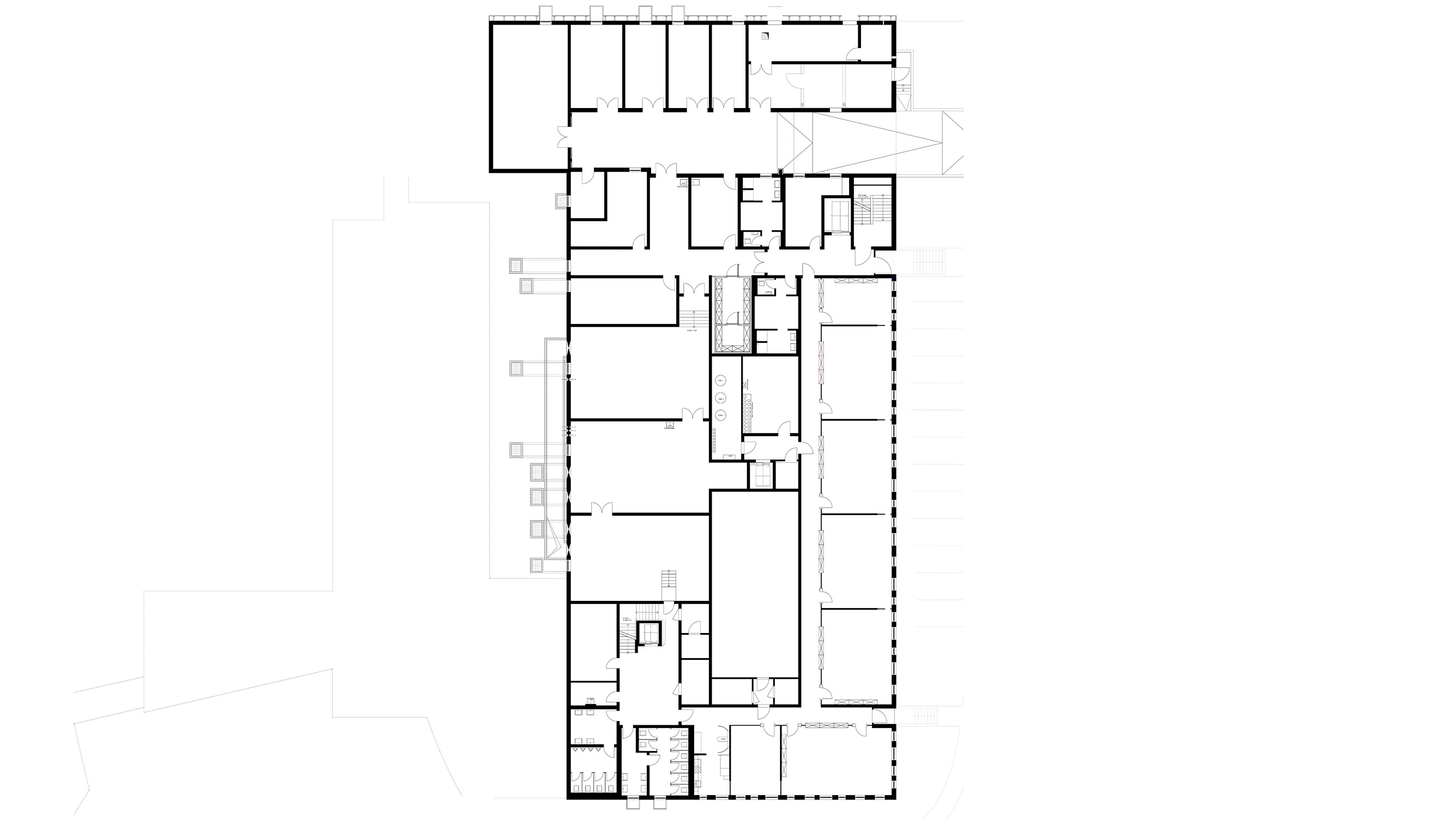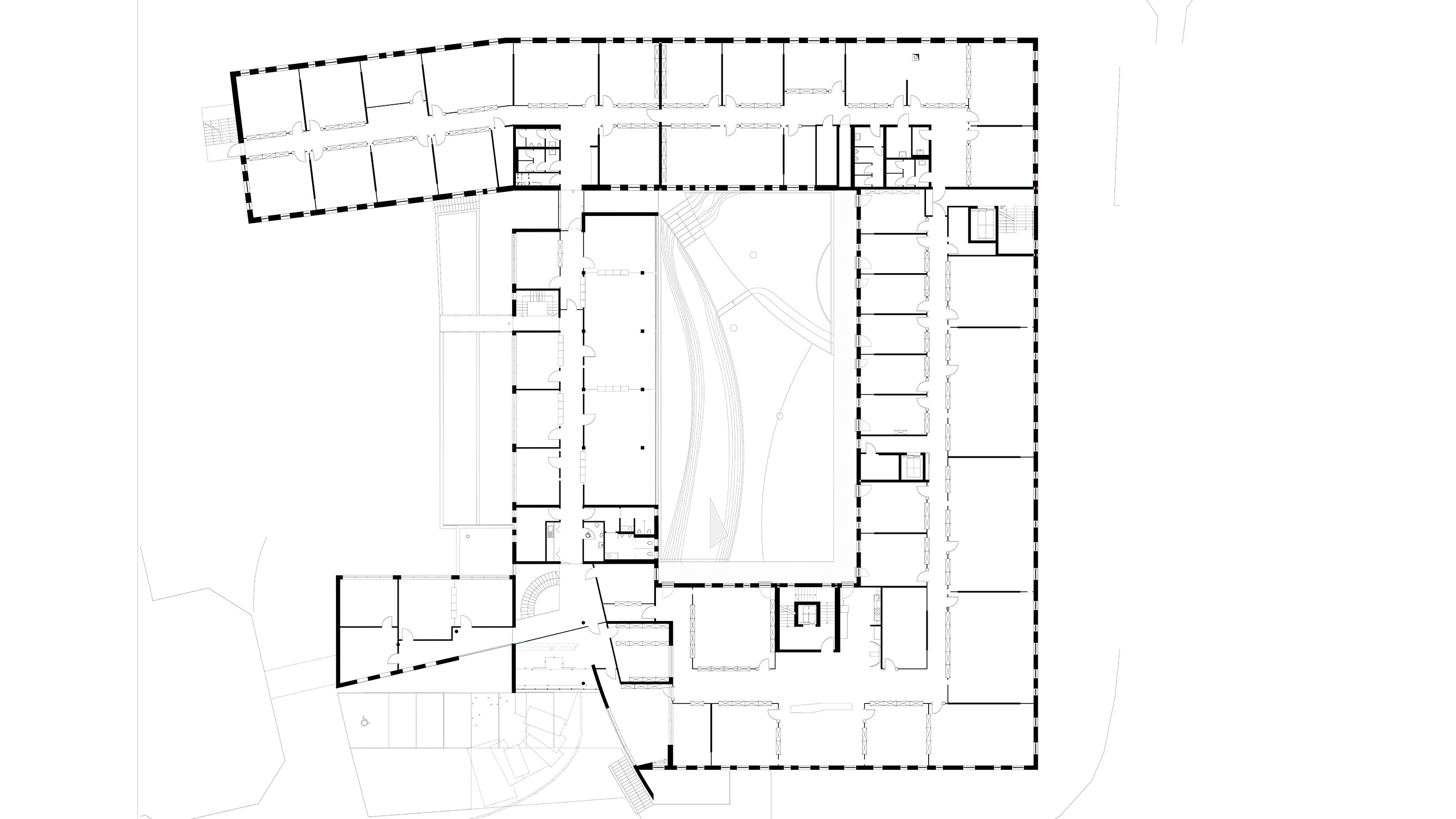 das obergeschoss ist ein reines bürogeschoss, das mit dem bestandsgebäude einen rundgang erzeugt. das eingangsgeschoss
