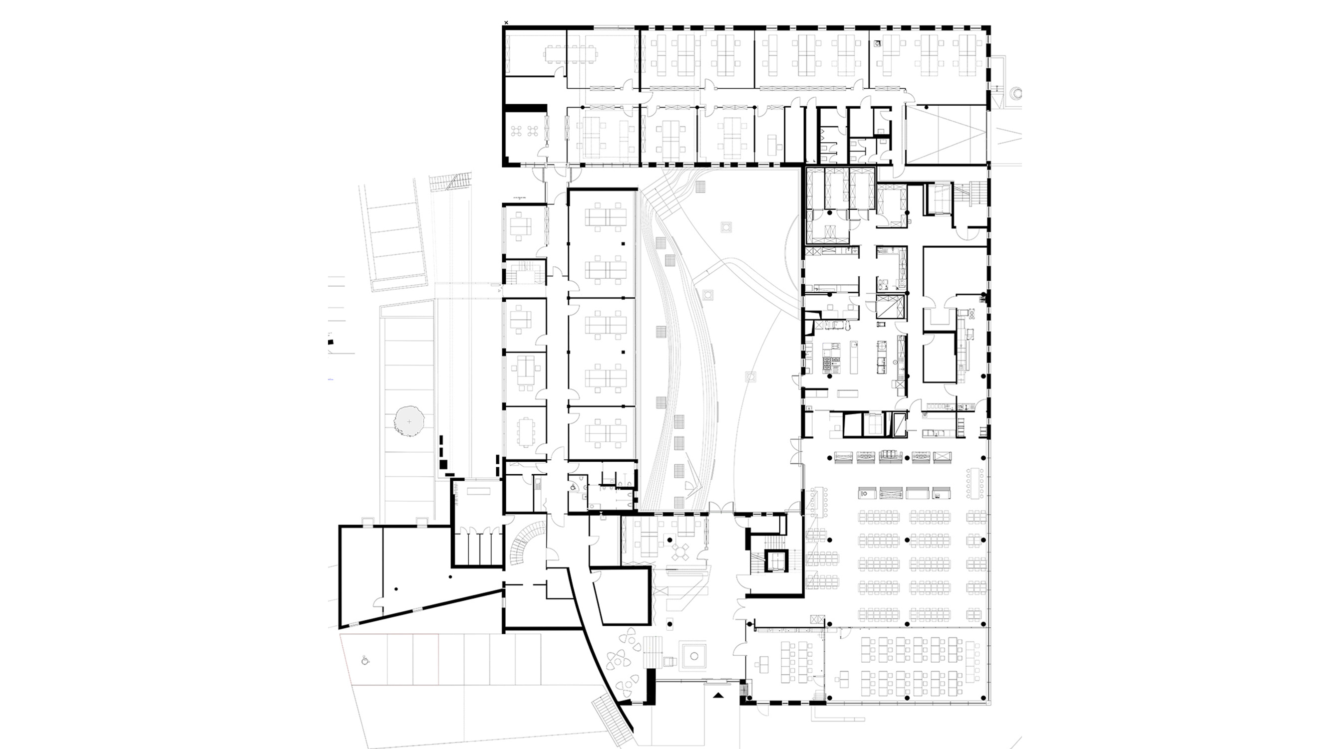 beinhaltet im süden das foyer mit angrenzendem casino und im norden einen büroriegel. der innenhof dient als kommunikations- und erholungszone.