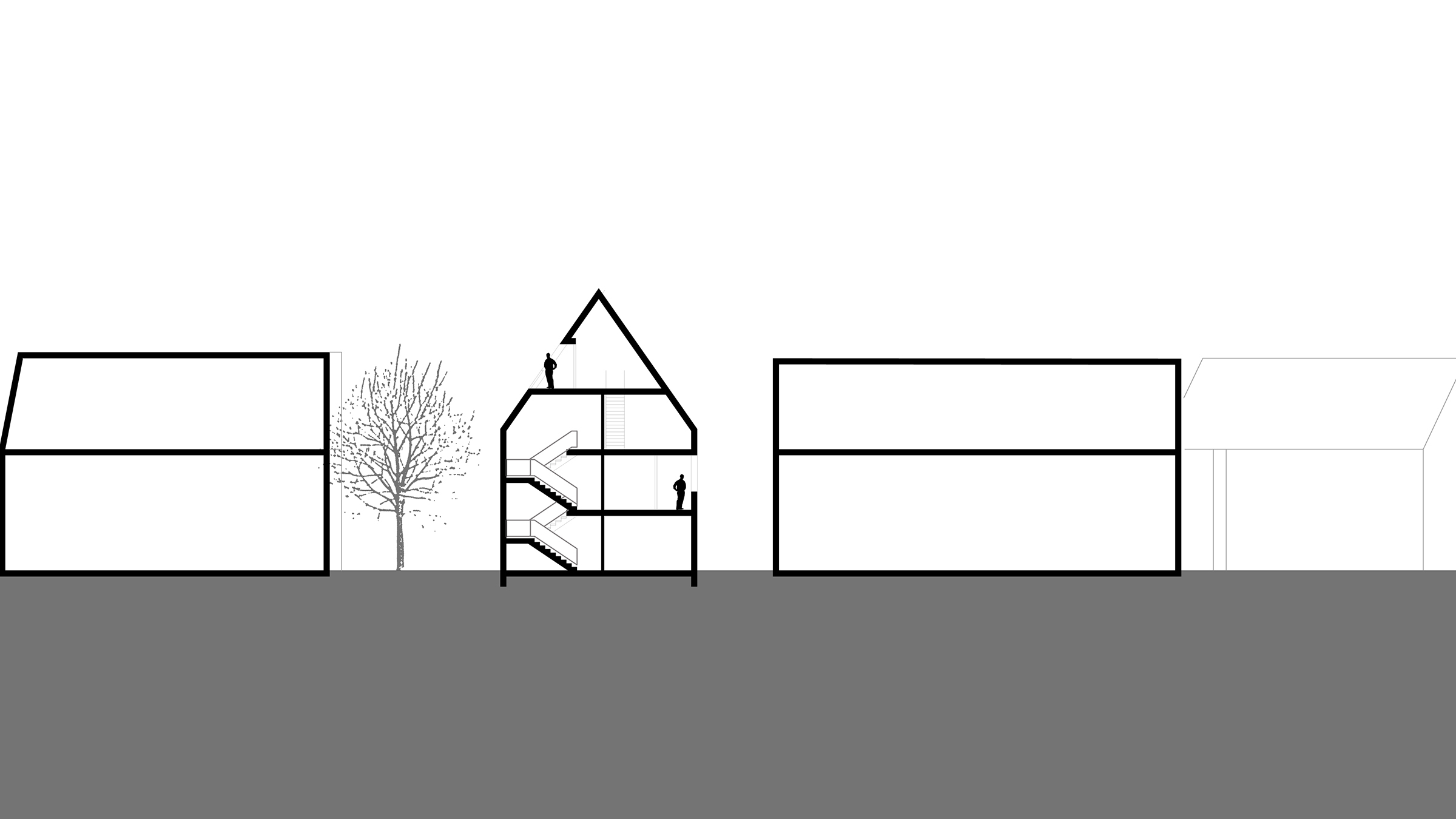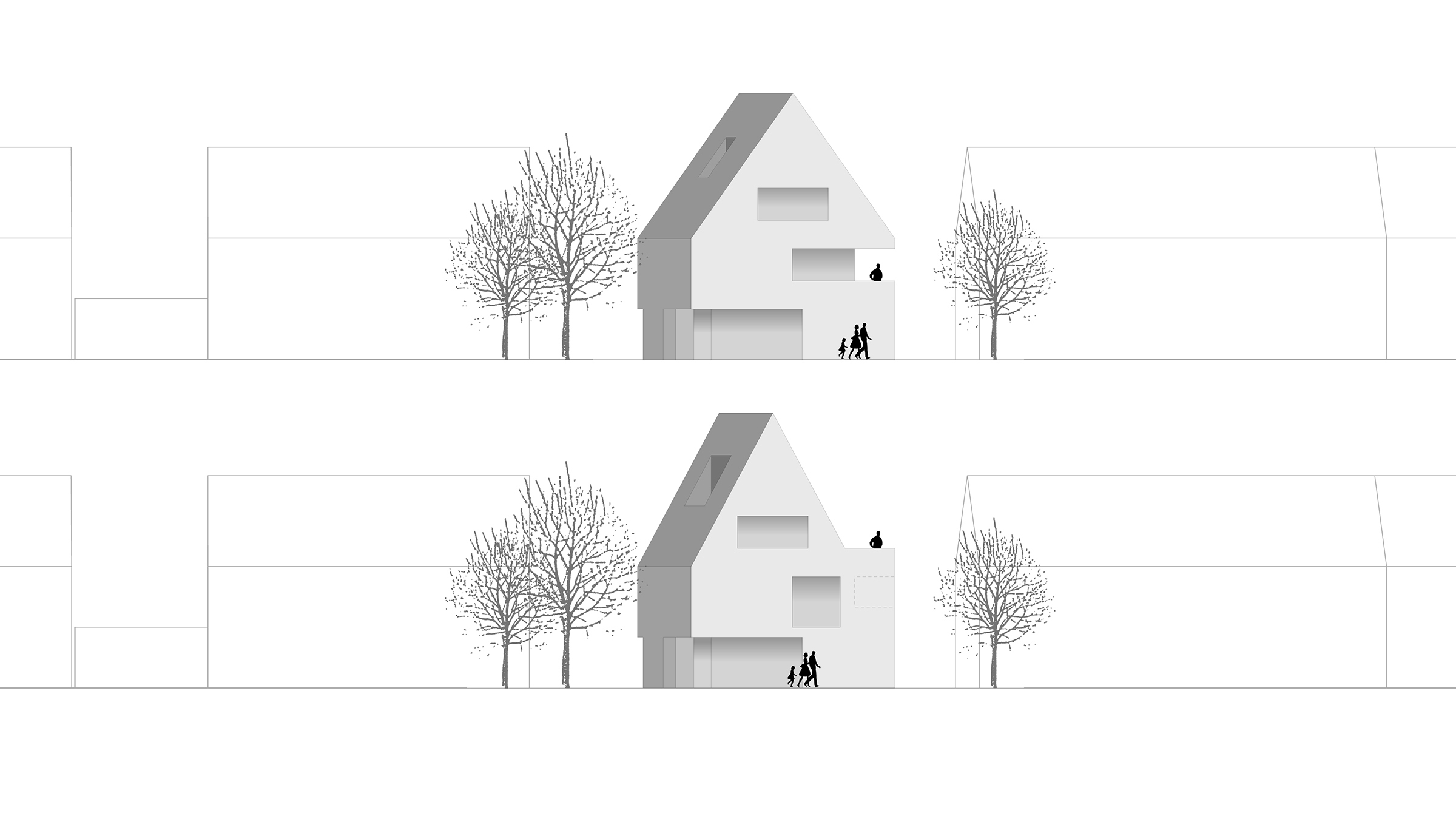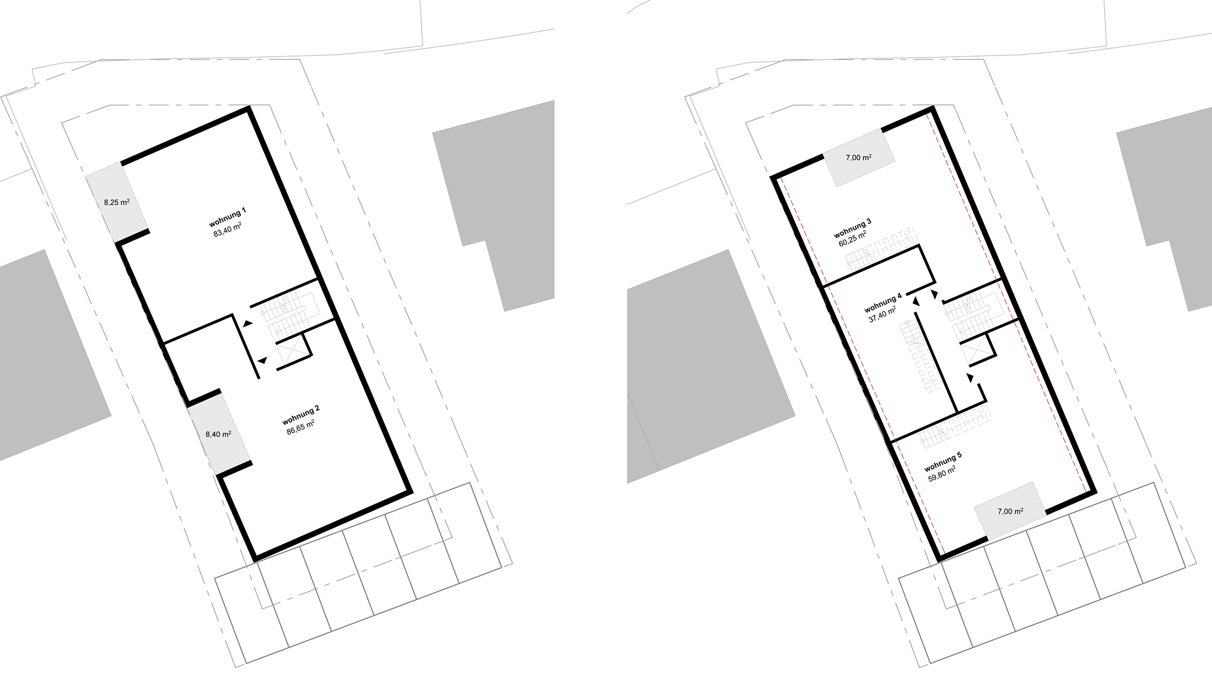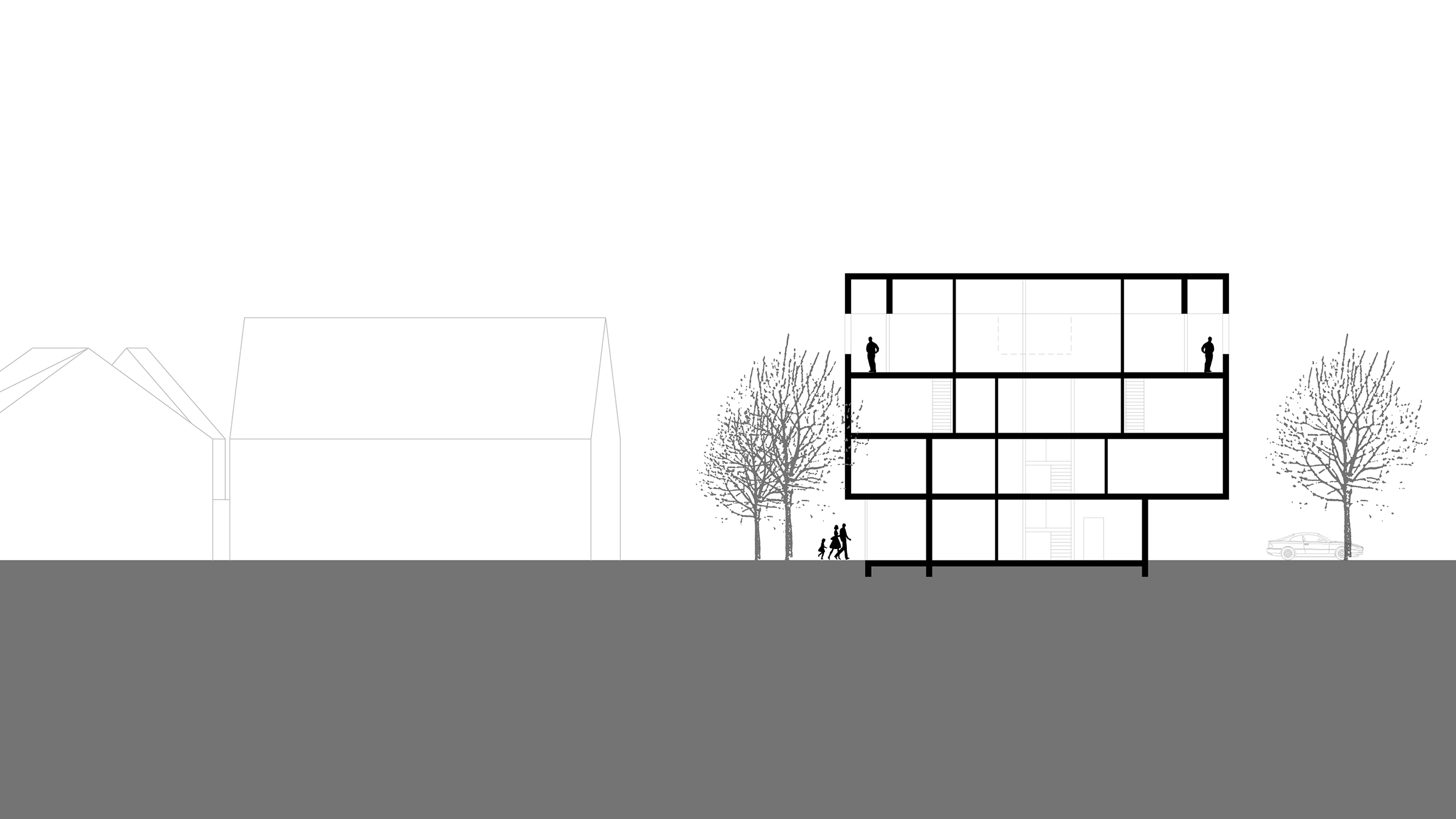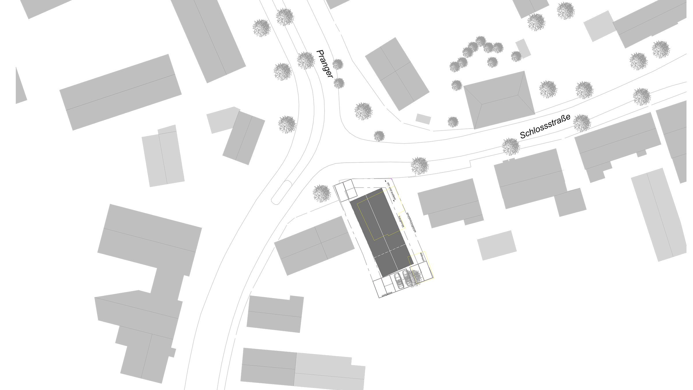 städtebaulich orientiert sich die lage des neuen gebäudes an der linie der bauflucht der traufständigen nachbargebäude. Der neubau wird als monolithischer satteldachkörper mit 2 vollgeschossen und 2 dachgeschossen mit eingeschnittenen loggien geplant. Der neue giebelständige körper ist leicht aus der bauflucht herausgedreht und markiert somit die platzkante. durch den homogenen baukörper mit der klar gegliederten fassade wird identität im stadtraum geschaffen und der platz am pranger aufgewertet.