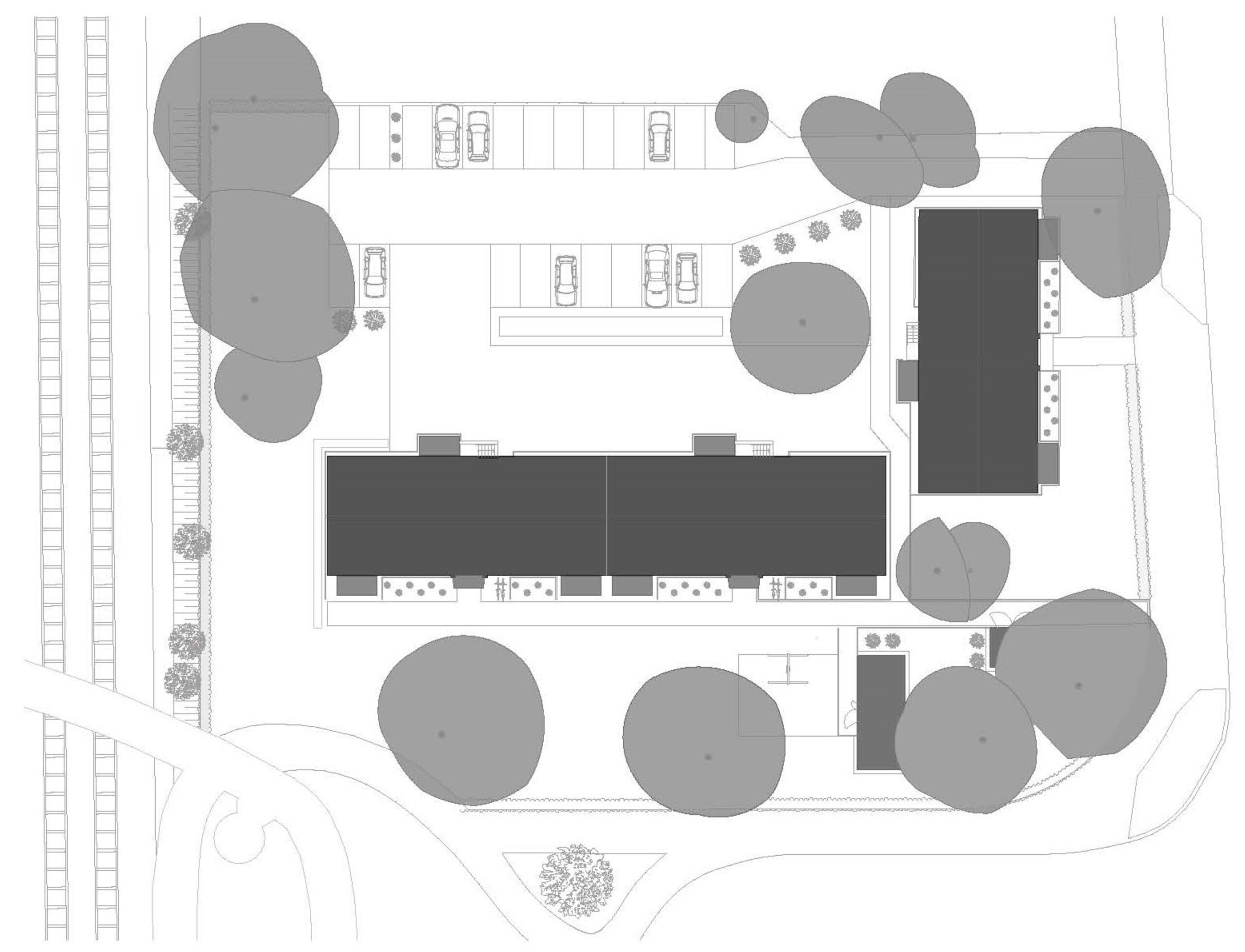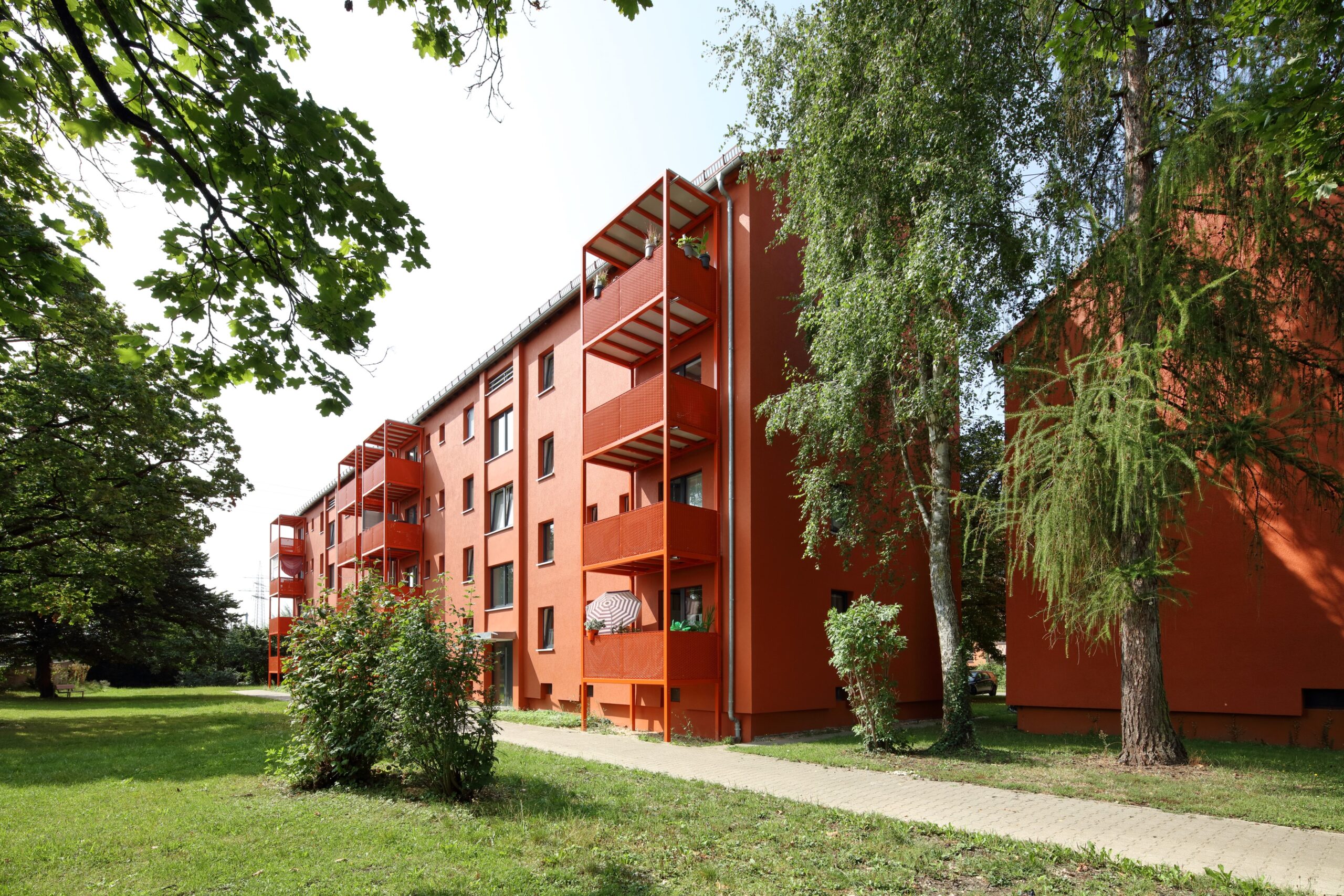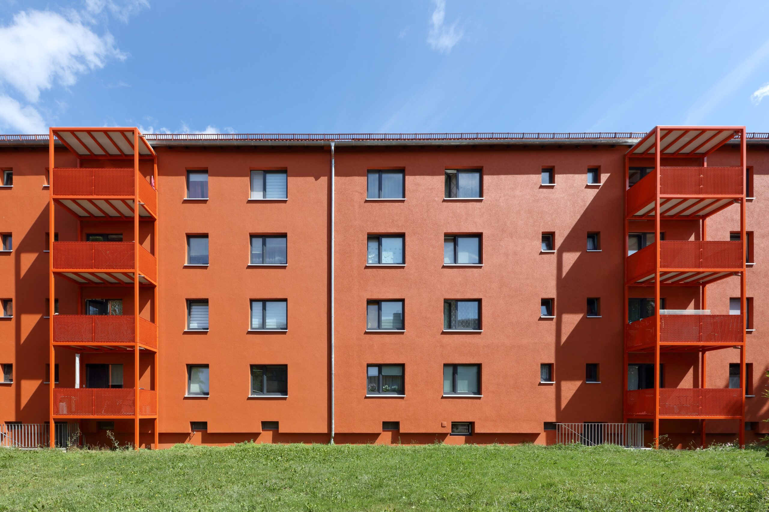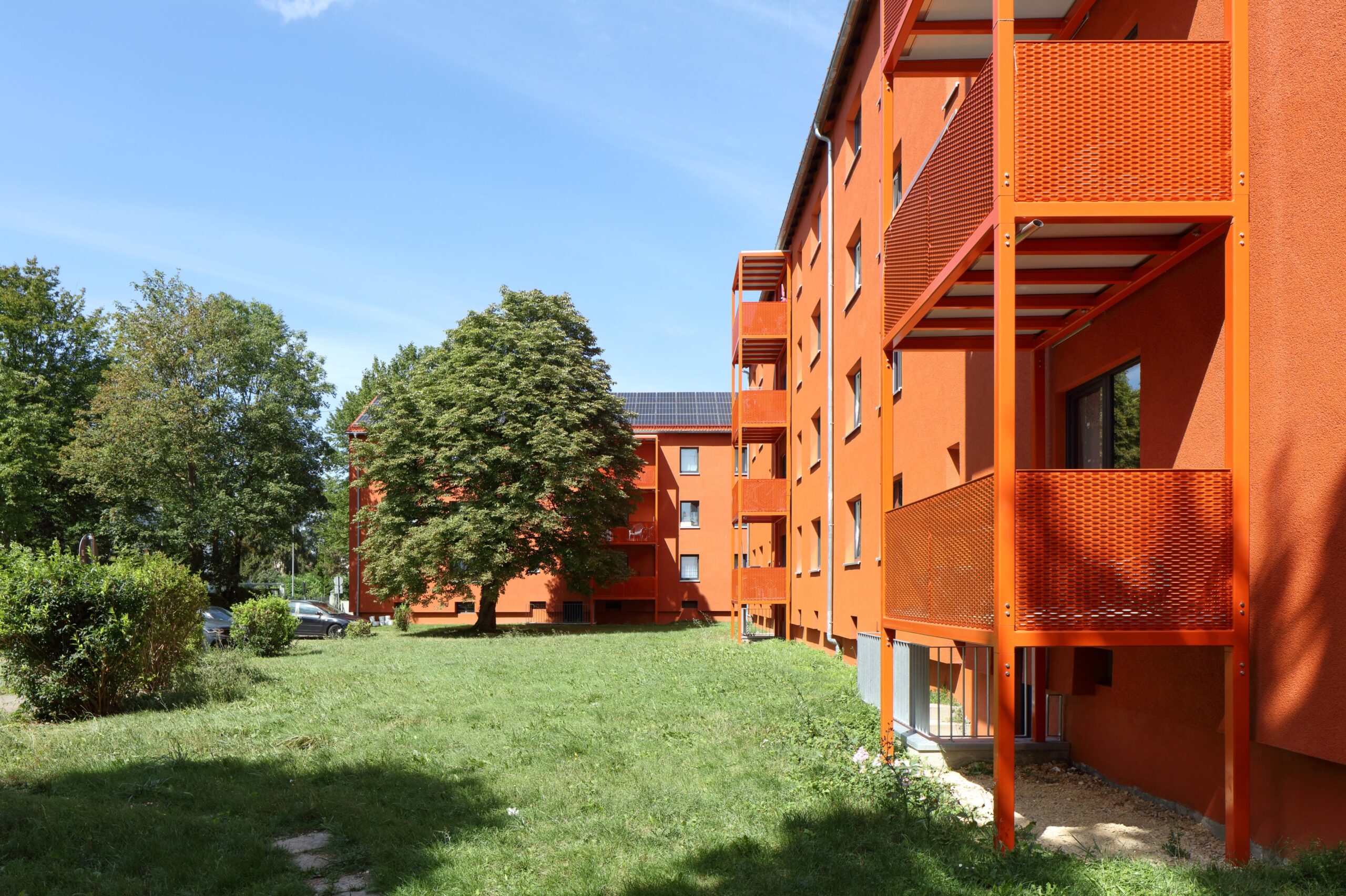 das quartier besteht insgesamt aus drei gebäuden. ein viergeschossiges freistehendes wohnhaus und zwei viergeschossige doppelhaushälften mit je 12 mieteinheiten. diese beiden gebäudehälften wurden nacheinander energetisch saniert und modernisiert. die maßnahme wurde im rahmen einer generalplanung umgesetzt und umfasste eine energetische sanierung, die ertüchtigung der fassade, den bau neuer balkonanlagen, die erneuerung der fenster und außentüren sowie diverse brandschutzmaßnahmen. zusätzlich wurde eine pv-anlage installiert und die bäder modernisiert, einschließlich der erneuerung des gesamten trinkwassernetzes. in diesem zuge wurden die sanitäreinheiten barrierefrei gestaltet und aufgewertet. die arbeiten erfolgten im bewohnten zustand und wurden daher abschnittsweise ausgeführt. vier wohneinheiten waren unbewohnt und wurden von grund auf modernisiert. zusammen bilden die drei gebäude ein einheitliches wohnviertel mit insgesamt 33 mieteinheiten.